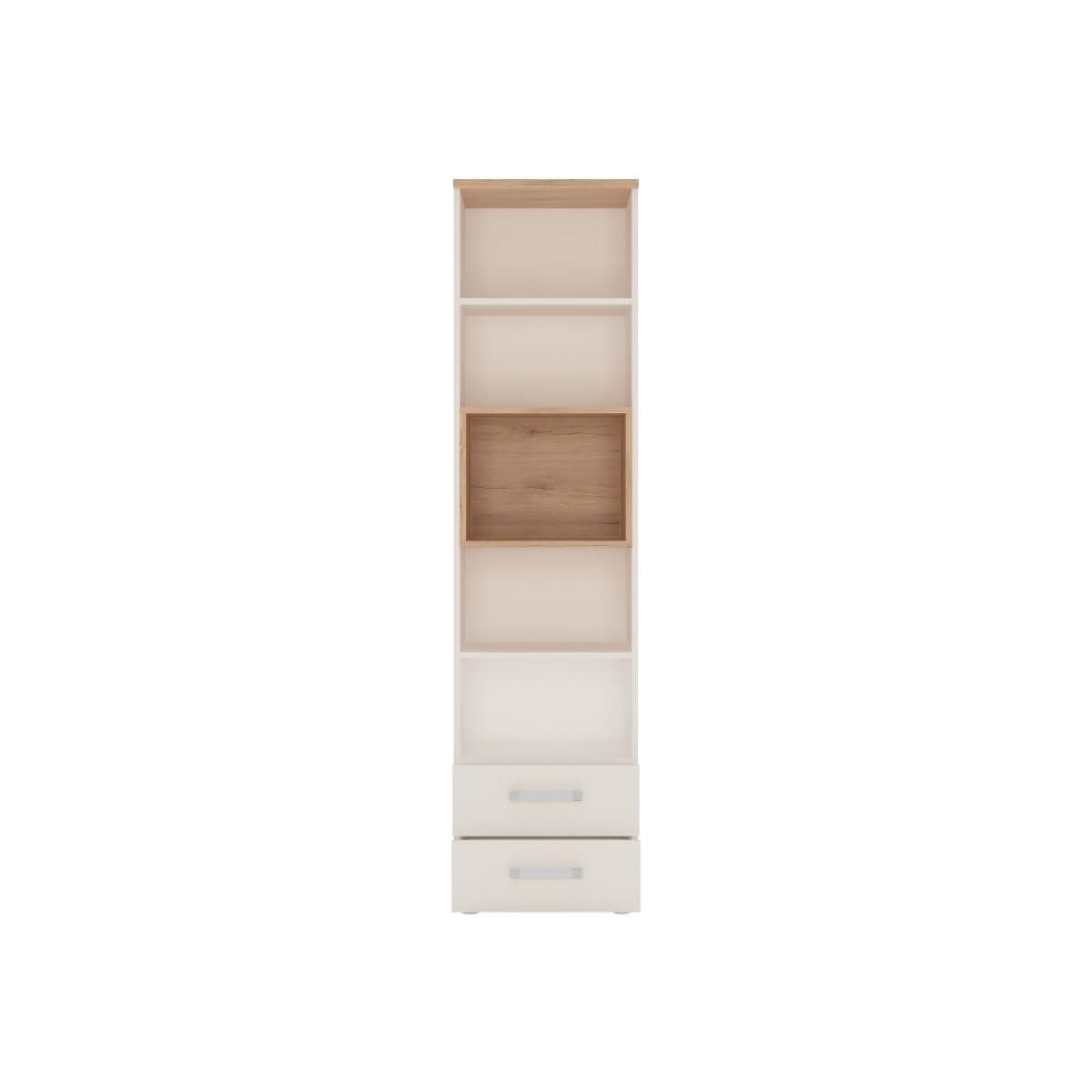 Kinder Tall 2 Drawer Bookcase in Light Oak and White High Gloss. Display your books uniquely with this original design. The height makes this bookcase ideal for smaller spaces and the light oak and bright white gloss helps by lighting up the room. Enjoy an impressive amount of space with adjustable shelves and two useful drawers at the base. Highly durable child-friendly laminate. Made from PEFC Certified sustainable wood Attractive opalino handles. Easy self assembly Contemporary light oak and high white gloss finish