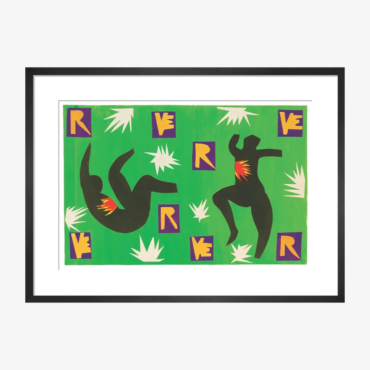This print shows Henri Matisse’s cover design for Verve Magazine in 1937. Verve was an arts magazine published by Tériade, who also commissioned Jazz. In the earliest cover shown here, two black figures dance energetically on a green background with white stars. The letters of "VERVE" appear as scattered letters "VE" and "R" in orange on purple.