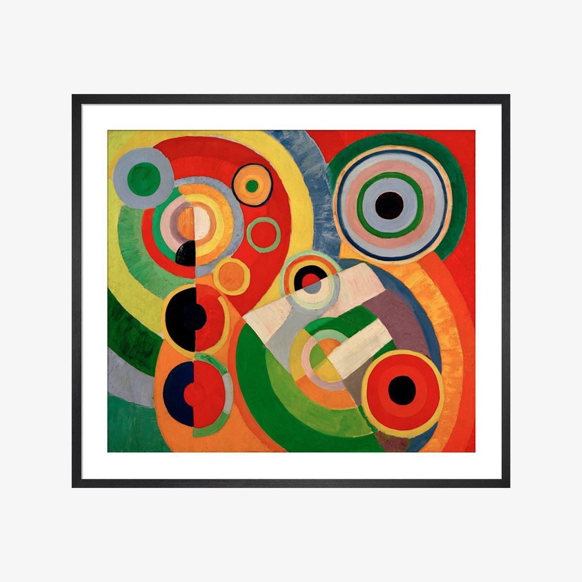 Robert Delaunay often divided his canvases into equal segments, distributing complementary and non-complementary colours amongst a succession of geometric forms. This process was based on the law of simultaneous contrast, developed by French chemist Michel Eugène Chevreul who stated that two colours in close proximity will take on the hue of the complement of the adjacent colour. Delaunay applied this theory when producing ‘Joie de Vivre’, positioning hues of red and orange against greens and yellows which appears to make the surface of the canvas vibrate.