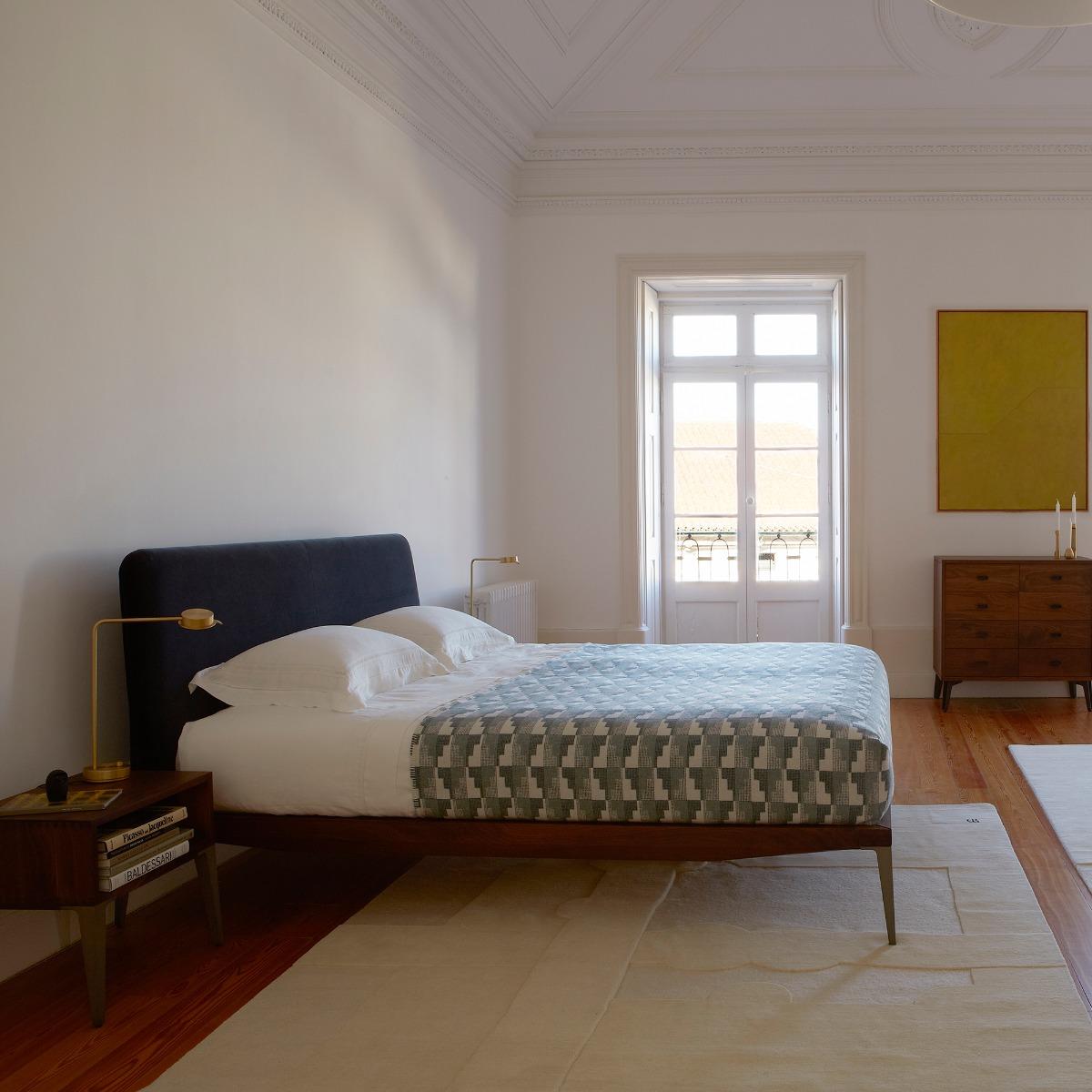 Inspired by the rugged landscape and abundance of modernist sculptors from Bretton in North Yorkshire, the king size Bretton Bed created by Matthew Hilton and crafted by De La Espada would bring an element of modern design to any bedroom. Crafted in Portugal, the body of the bed is crafted from luxuriously grained black walnut, a rich dark heartwood sourced from the Midwestern United States, and finished with Danish oil. Supported by four taupe anodised aluminium legs, the body features exquisite joinery specially designed by Matthew Hilton. Combined with the highest quality materials, the meticulous detailing on the Bretton Bed marks it as an item of quality. The elegant headboard is available upholstered in Vidar and Coda fabrics from Kvadrat. Designed by Raf Simons and Fanny Aronsen, Vidar has a large-grained texture with a gentle satin surface finish and is crafted from 94 percent new wool and 6 percent nylon. Coda, designed by Norway Says and Per Bjornsen, is woven in two layers, with two colours to highlights its three-dimensional character, from 90 percent New Wool and 10 percent Nylon. The ideal place to rest your head after a hard day's work, the Bretton bed in walnut would bring elegance, superb craftsmanship and modern design to any bedroom. Upholstery available in 8 different colours. Explore our Mattress collection and find the perfect one for your bed here.