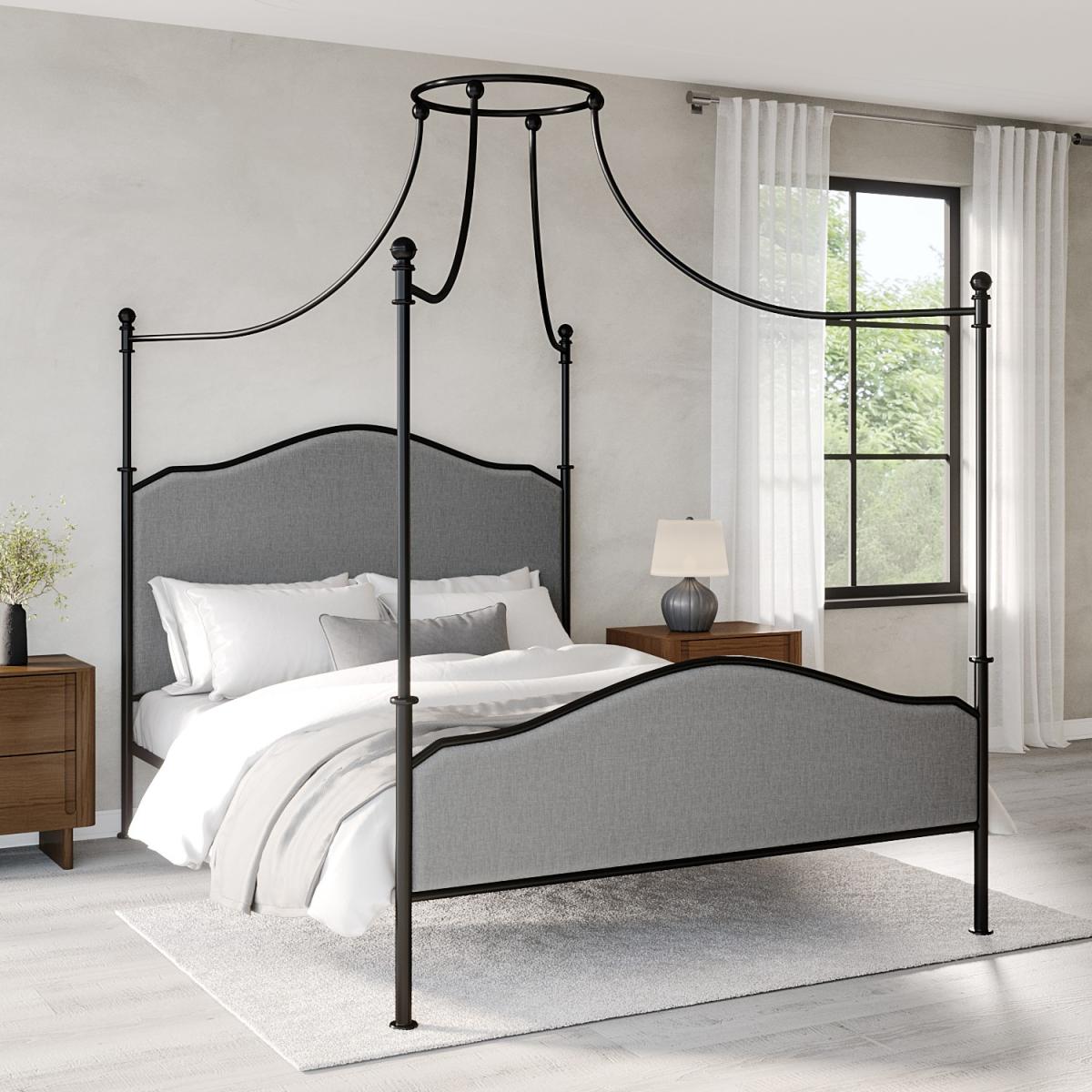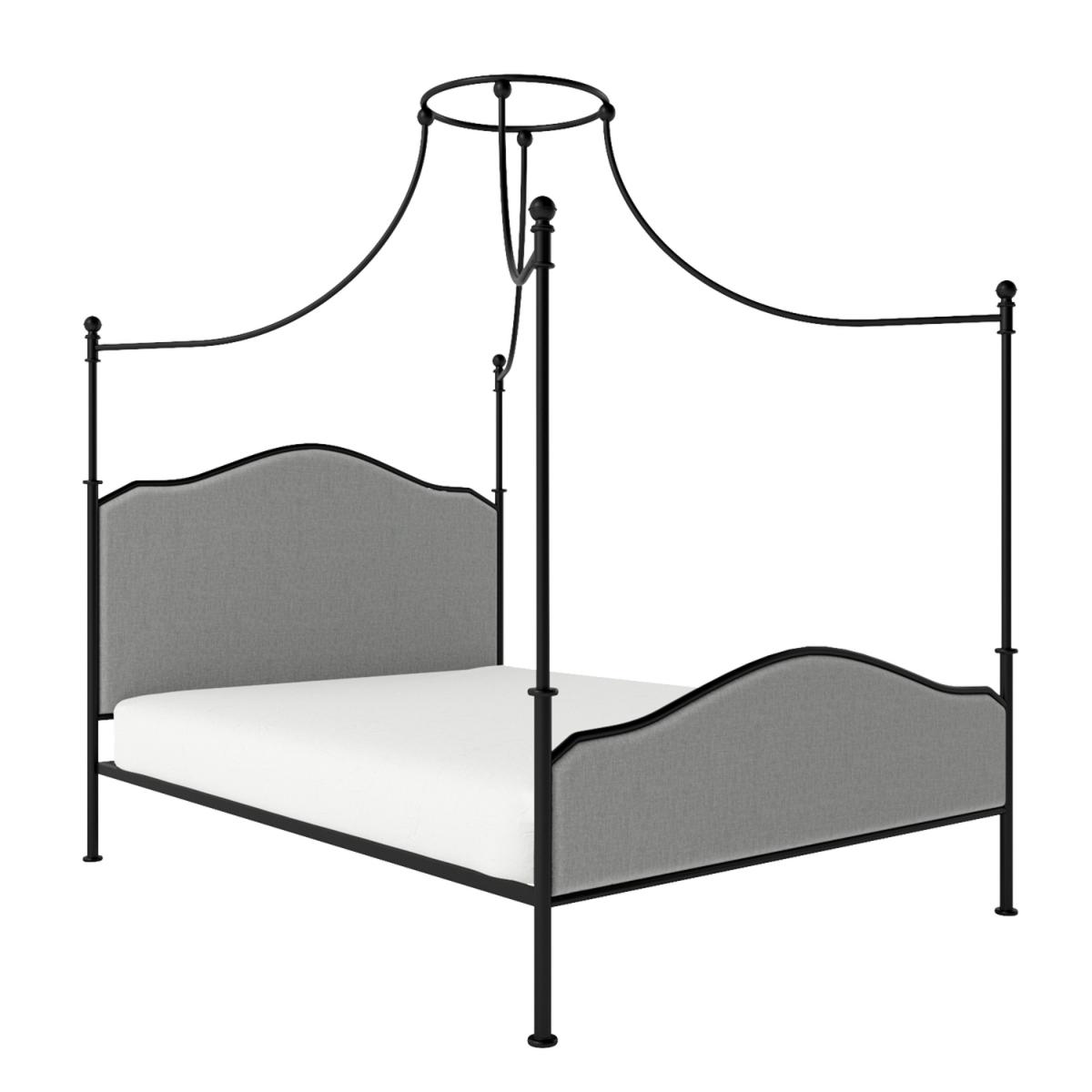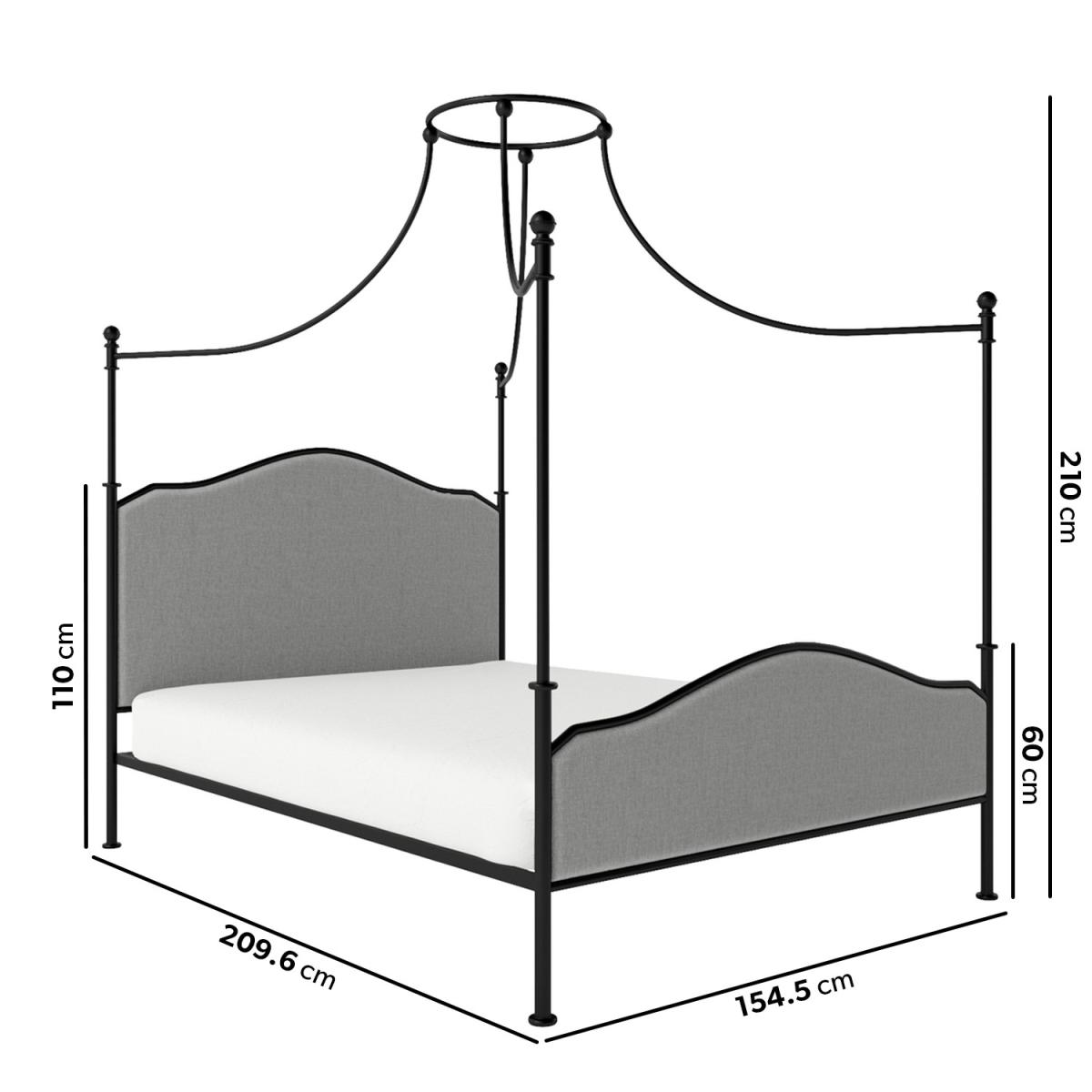 Features we love Enchanting French-inspired king size canopy bed A modern take on the classic 4-poster bed frame Upholstered in a chic light grey woven fabric Black frame contrasts beautifully with the upholstery Receive 10% off your perfect mattress with this bed All about me Add a sense of classical elegance with this French-inspired four-poster canopy bed with an integrated padded headboard and footboard. With its slender silhouette and crown-like central feature, it would perfectly adorn any master bedroom. It can be dressed with sheer voile drapes to add a dramatic effect. It's sturdy, too, thanks to the metal frame and wooden sprung-slatted base, so you'll have assured mattress support, and there's even space beneath to add under-bed storage. It fits a UK standard king size mattress that isn't included, so you can choose one that's perfect for you. Need to know Dimensions: W155 x D210 x H210 cm Finish: Upholstered Material:Woven fabric Colour: Grey and black Frame: Metal Base: Sprung-slatted Assembly Required:Yes Mattress Included: No Mattress Size Required: UK king size (5ft) Packaging Dimensions: Box 1: W127 x D165 x H15 cm. Box 2: W19 x D213 x H13 cm