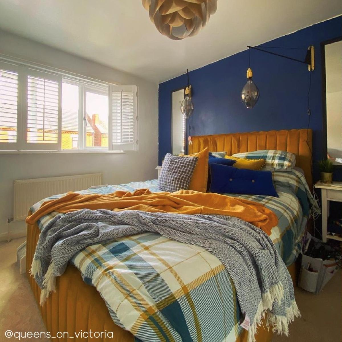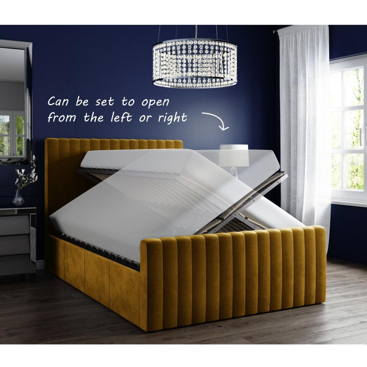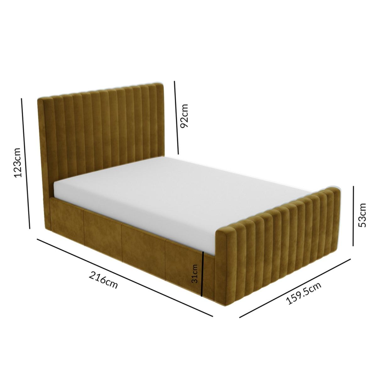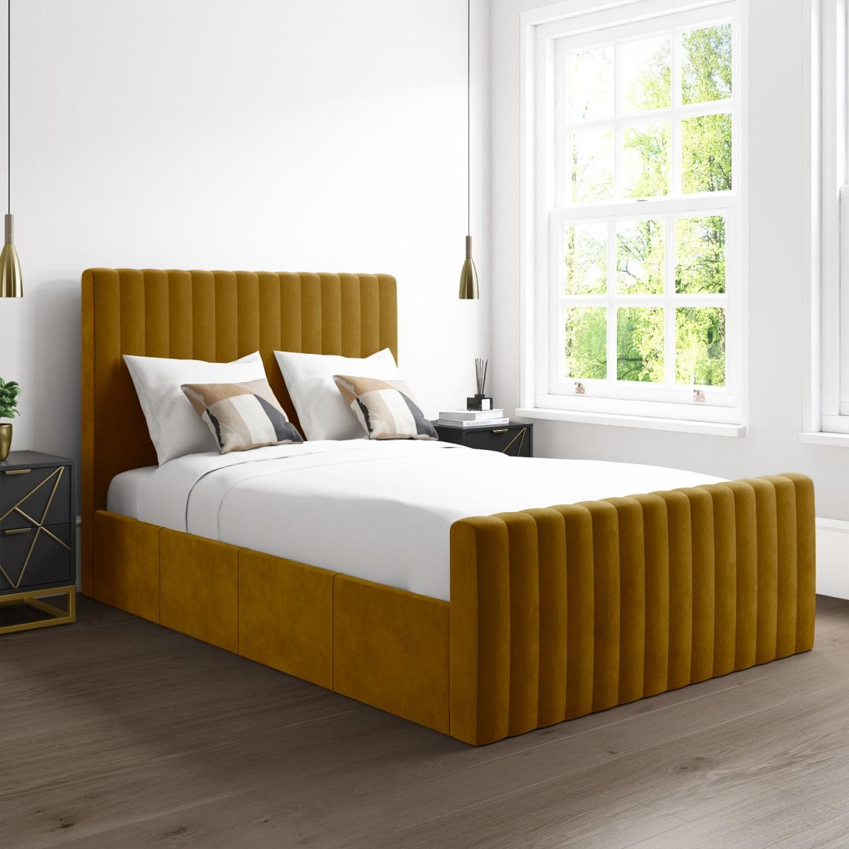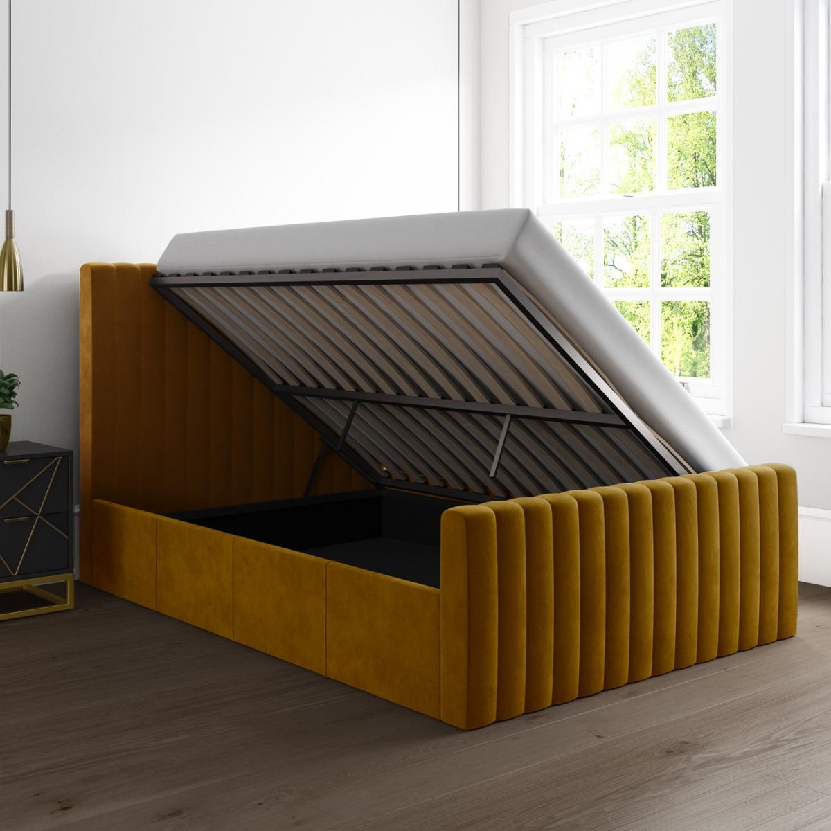 Features we love Easy access side opening storage space with gas lift mechanism. The storage frame can be set up to open from either the left or right hand side to suit your room layout Plenty of storage space the entire area beneath the mattress can be used. Its fabric base helps to protect your stored items from dust Contemporary vertical stitch detailing on the headboard and footboard creates an instant focal point in the bedroom. Upholstered in high-quality soft-touch velvet brings an elegant tone to your bedroom Sprung slatted bed base gives comfortable and durable mattress support. Mustard yellow finish makes a style statement in any bedroom. The tall padded headboard is ideal for comfortably propping yourself up All about me. The luxuriously padded headboard sumptuous smooth velvet and under-bed storage makes the Khloe as stylish as it is practical. The hidden storage area is ideal for keeping things like duvets seasonal clothing and anything you like out of the way but close to hand. It features a handy gas-lift mechanism for quick and effortless access to your stored items. Plus it opens from the side rather than the end which make it easier to access all of your stored items. You can even set the storage frame to open on either the left or right-hand side giving you that extra freedom when it comes to your bedroom layout. Upholstered in a mustard yellow velvet fabric with vertical stitch detailing this stylish king bed exudes a timeless sophistication that's guaranteed to make an impact in your bedroom. It has a durable frame made from metal and wood with a sprung slatted bed base for comfortable and durable mattress support. The tall padded headboard is great for propping yourself up in bed to snuggle down with a good book or in front of the TV. It also features a fabric base to keep your stored items clean and dust-free. The bed fits a standard UK king size (5ft) mattress. A mattress is not included so you'll be able to pick the perfect one for you. Need to know. Size. Standard UK king (5ft/150x200cm) Dimensions. W159.50 x D216 x H123 cm Storage Dimensions. W154.5 x D200.5 x H22.5 cm Material. Metal and; wood frame Finish. Upholstered mustard yellow velvet Base. Sprung slatted Maximum weight limit. 300kg More info Full ottoman base for extra and discreet bedroom storage Gas lift mechanism gives easy access to storage space. The storage frame can be fitted to open on either the left or right-hand side. Durable wood and metal frame with an upholstered mustard velvet finish. Sprung splatted bed base for comfortable and durable mattress support. The fabric base helps protect your items from getting dusty. Fits a standard UK king mattress (5ft/150x200cm)A mattress is not included with this bed. Also available as a double size.