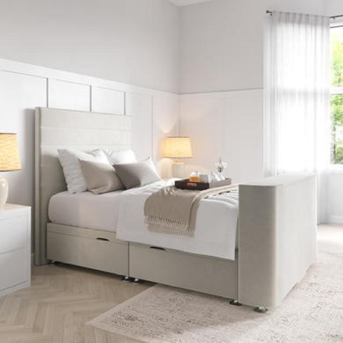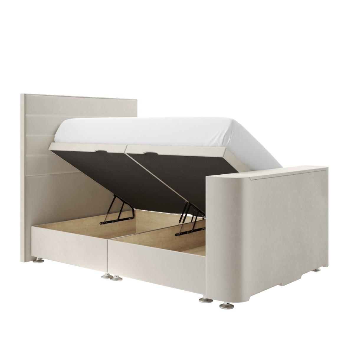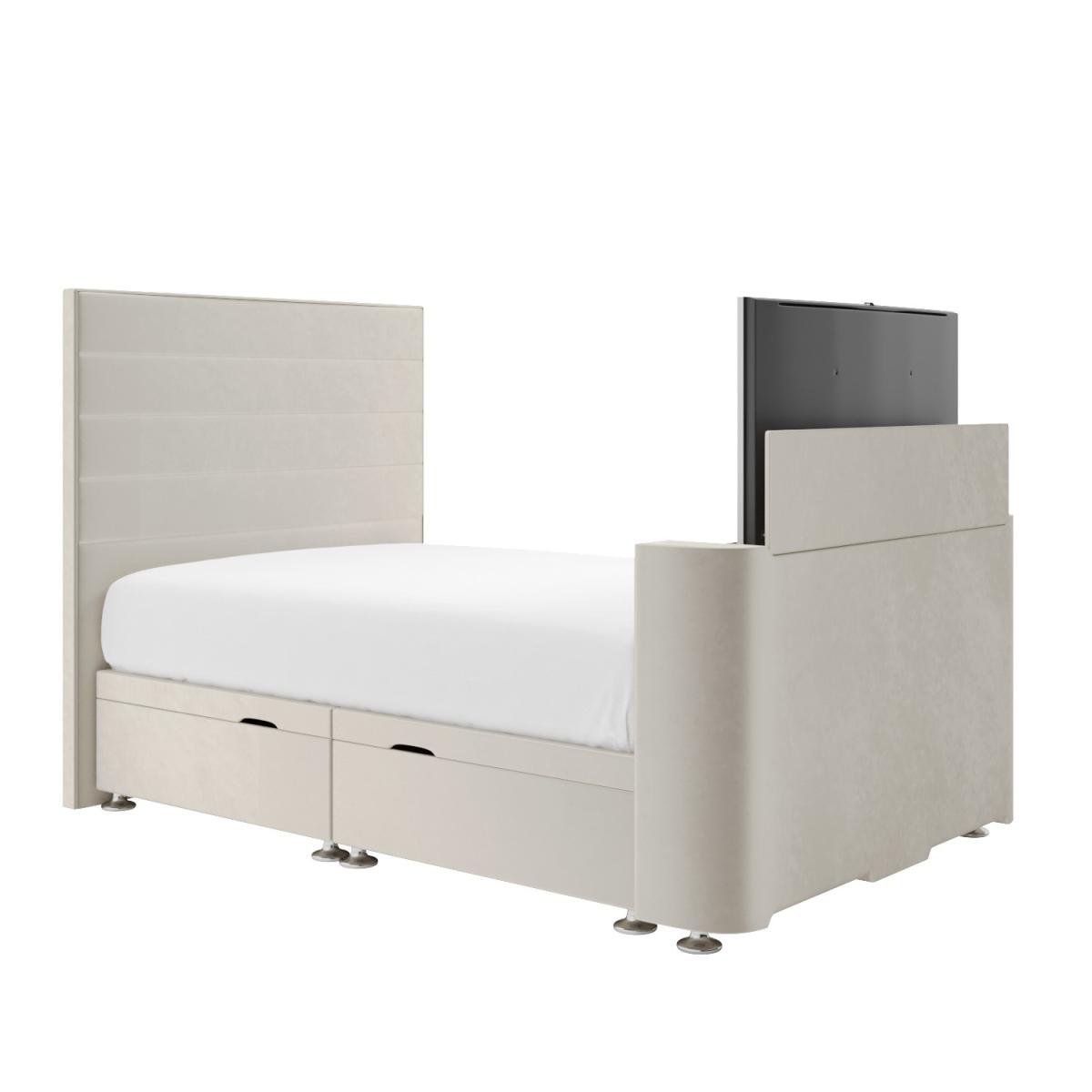 Transform your bedroom into your own private cinema with the Eden TV bed. The padded stripe headboard and sumptuous velvet upholstery create the perfect place to relax and watch your favourite films and TV shows. The ottoman feature is great for keeping your bedroom clutter-free, and it can be assembled to lift on either side to suit your bedroom layout. Install your TV of choice to the bracket, press the button on the handy remote and watch it rise from the footend.