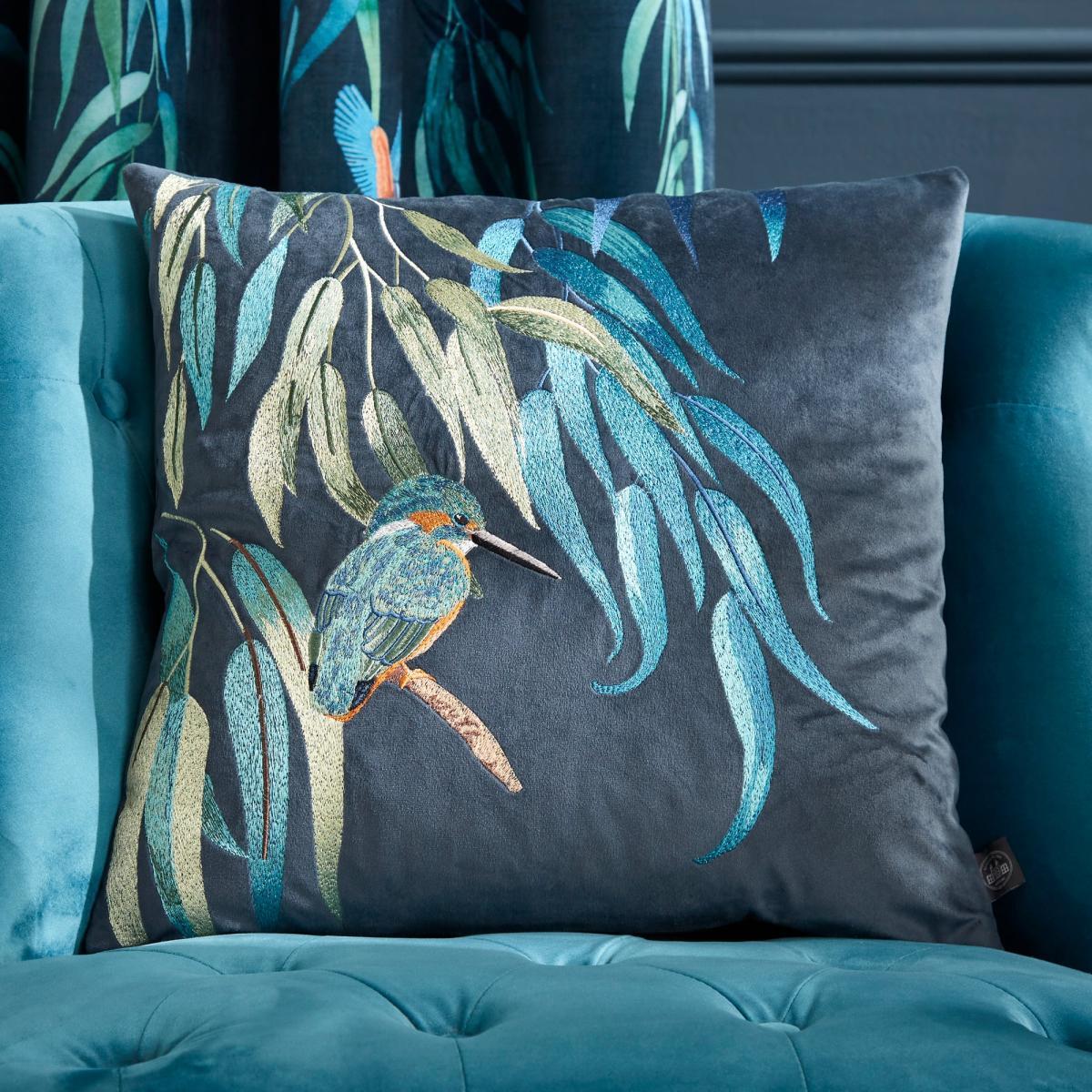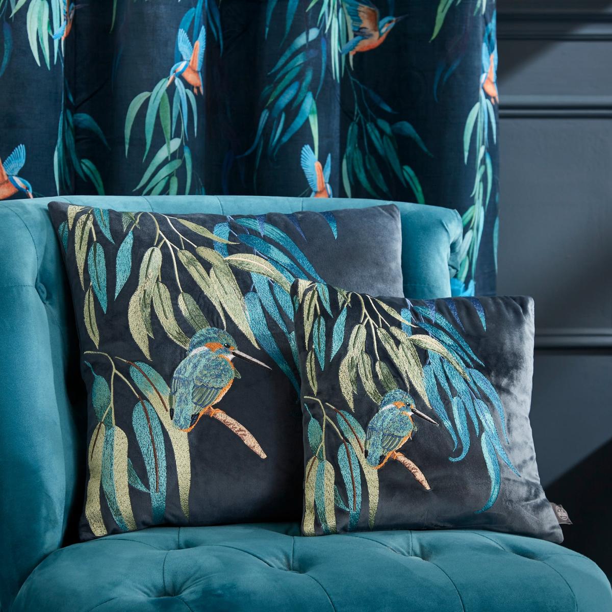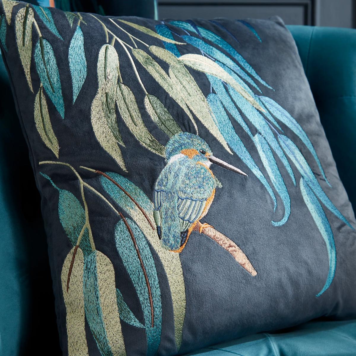 **In collaboration with the Natural History Museum*** Cover crafted from 100% recycled polyester* Feather insert* Soft feel velour* Zip fastening - keeps the insert secure Featuring beautiful kingfishers with exotic plumage that are the jewel of the English waterways, this cushion is perfect for adding a small statement to a room. Crafted from 100% recycled polyester, the cover has an intricate embroidered design and a soft velour feel. The collection plays on the rich colours these birds are renowned for. A zip fastening has been fitted to keep the feather insert secure.**Natural History Museum x Dunelm**The Kingfisher Cushion is part of the Wetlands collection. Wetland habitats are vitally important in supporting an abundance of plants and animals that thrive in these unique and complex ecosystems. With this collection we’re shining a light on some of the wonderful species that you can find in the UK’s wetland areas and highlighting the need to protect these incredible yet vulnerable habitats. © The Trustees of the Natural History Museum, London 2022. All Rights Reserved.
