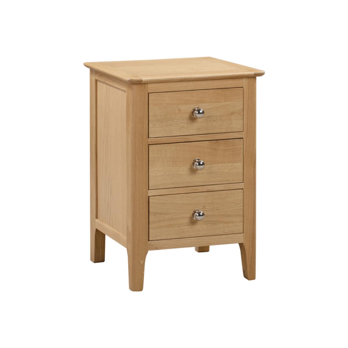 Crafted from solid oak and oak veneers, the Cotswold 3 Drawer Bedside ensures lasting durability with its robust structure. Featuring 3 spacious drawers, ideal for keeping night-time necessities within arm¿s reach, with additional space on top for a bedside lamp. This simple, yet elegant design is finished with a round silver knob, perfect for any traditional bedroom.