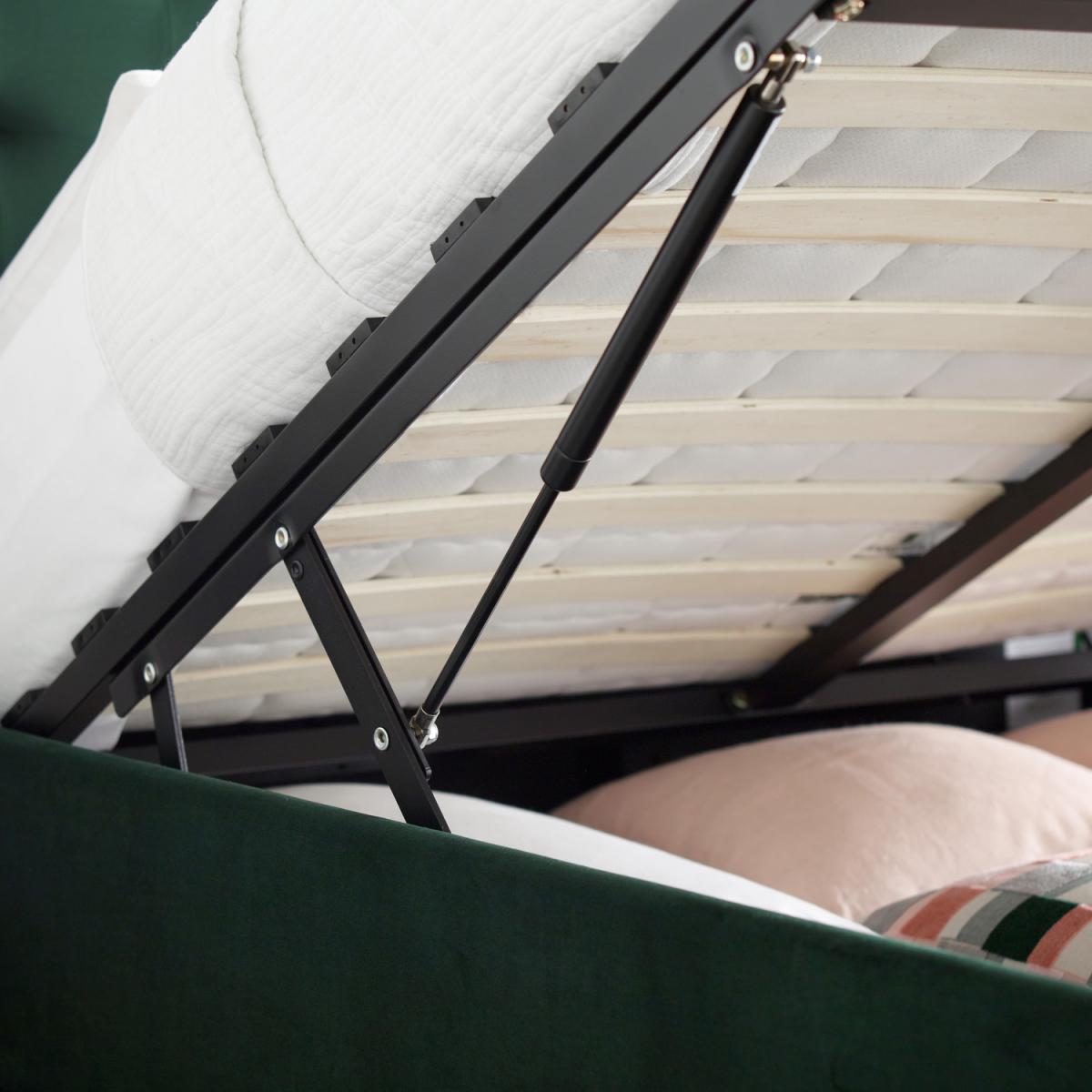 The Kingham is a modern ottoman bed which comes in a range of beautiful colours. A solid frame upholstered in velvet featuring a fully boarded base ideal for storage which can be accessed from the foot end. The contemporary headboard, wooden feet and colour options makes this bed ideal for any bedroom. The low foot end provides a greater sense of space and the sprung slats give fantastic mattress support.
