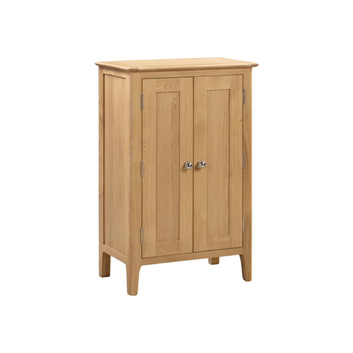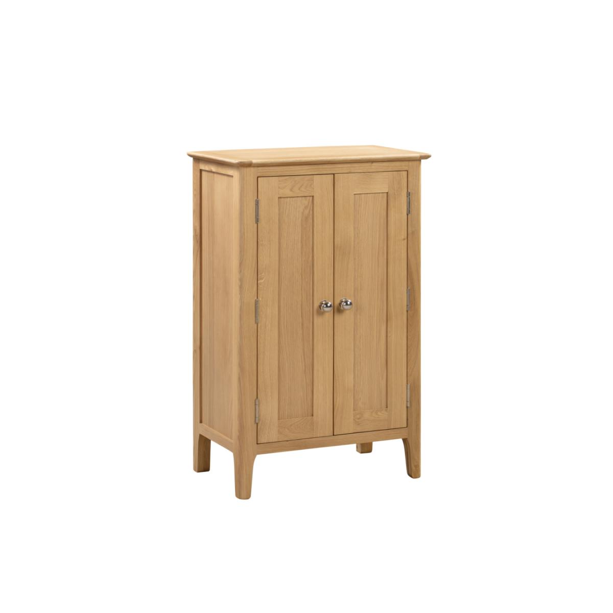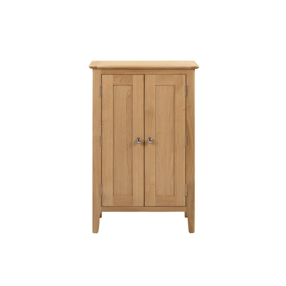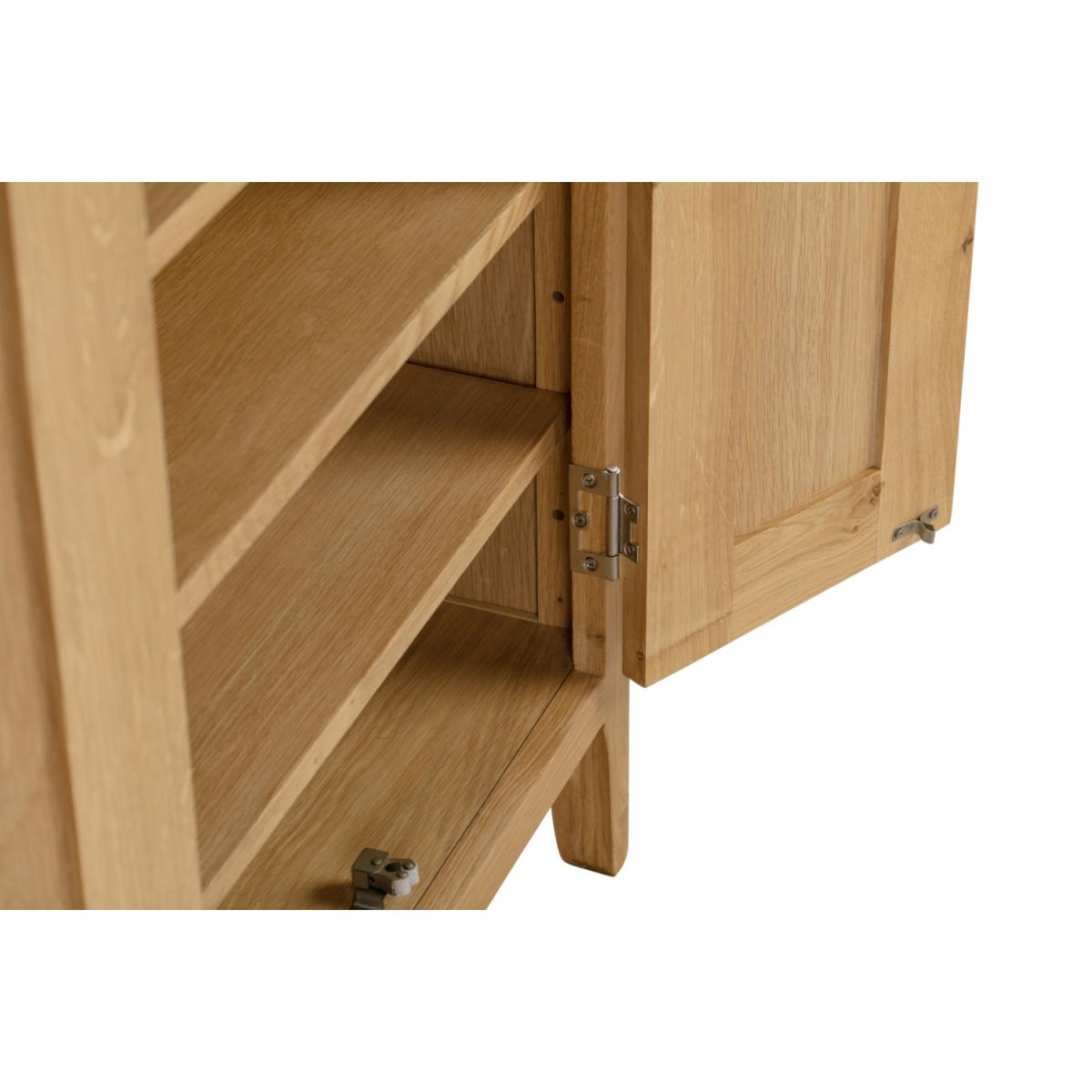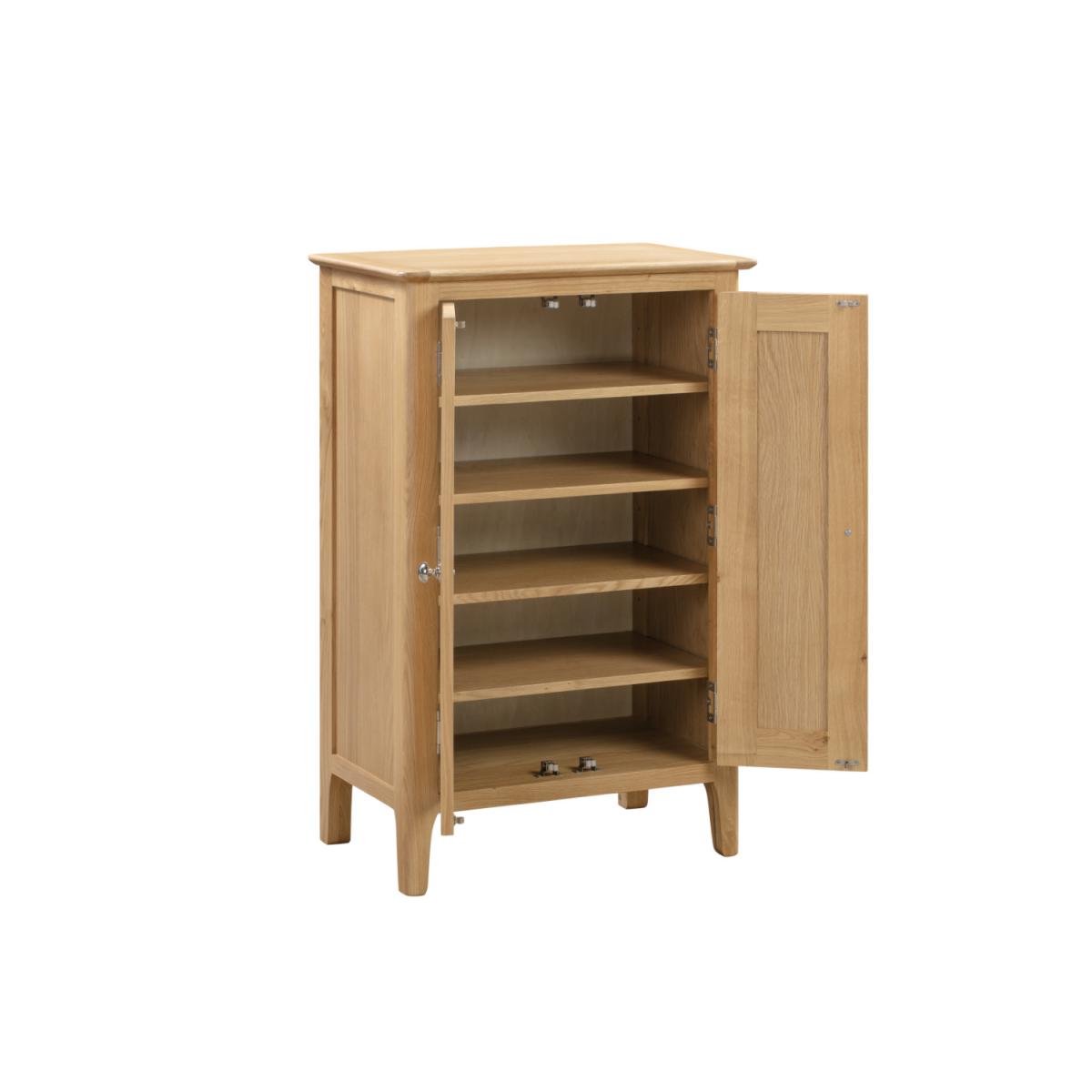 Crafted from solid oak and oak veneers, the Cotswold Shoe Cupboard features 5 shelves for storing you're your shoes away neatly. This simple, yet stylish design is an ideal additional to any traditional room with its soft edges and charming round silver knobs. Part of the Julian Bowen Cotswold Dining & Occasional Collection.