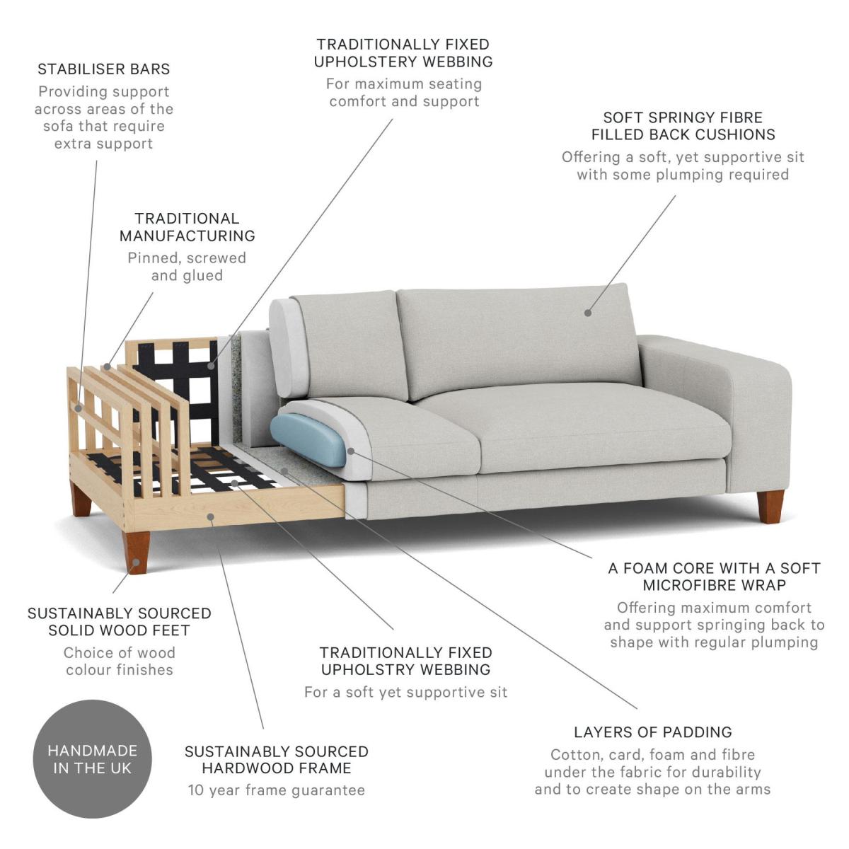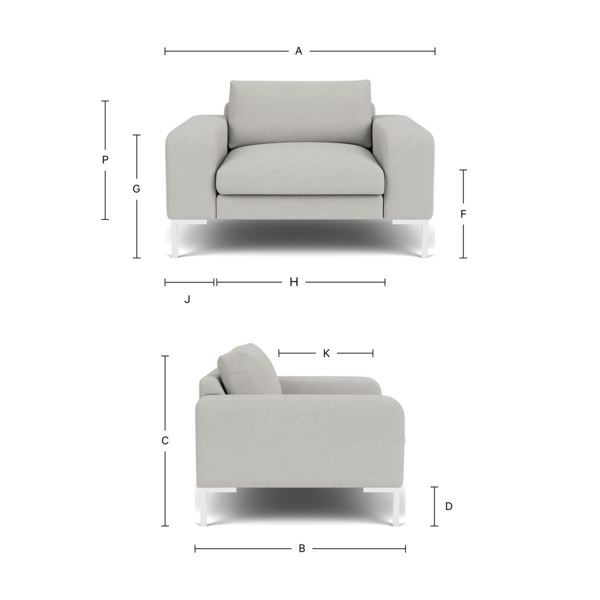 Enjoying all the trappings of modern design, the Kingly Loveseat features a low back, chunky arms and a generous deep seat to sink into. The option of sleek metal legs adds further to the contemporary style of this luxury sofa. Perfect for any cosy corner! Choose from our range of contemporary fabrics and leathers with over 170 to choose from you sure to find the perfect option to create your perfect cuddle chair. Handmade by expert craftspeople in the UK, our range of loveseat are made using the finest materials to create a sofa that will last. External (cm): - Width (A) = 125 - Depth (B) = 100 - Height (C) = 90 Seat (cm): - Width (H) = 75 - Depth (K) = 63 - Height (F) = 48 Arm (cm): - Width (J) = 25 - Height (G) = 61 Legs (cm): - Height (D) = 15 Frame Height (without Feet): - Height (P) = 75