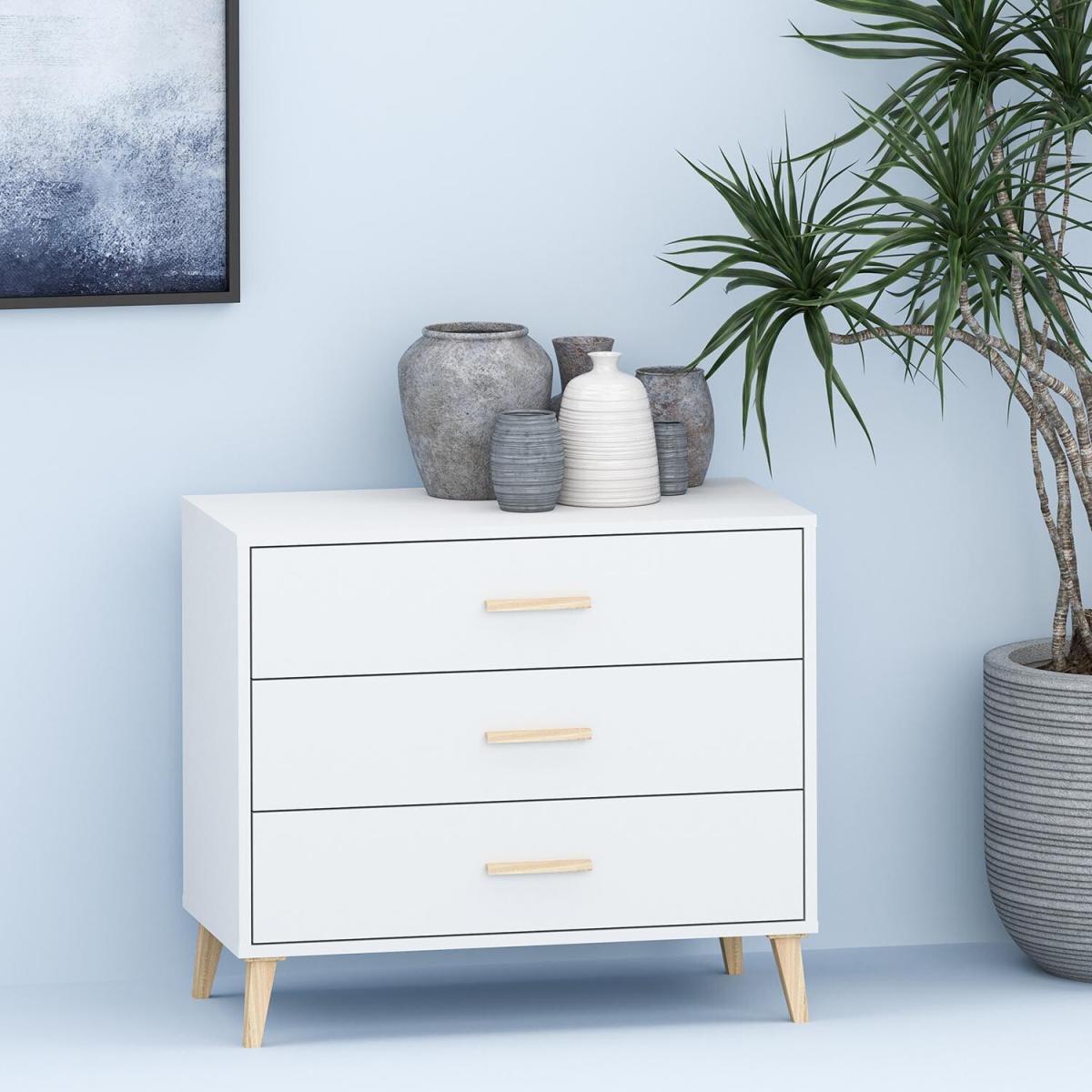 The Kingston 3-Drawer Chest features three large drawers all supported on strong, easy-glide metal runners. This Scandinavian styled chest is finished in arctic white with contrasting, natural wood toned handles and legs for a contemporary feel. The best is great for providing additional storage to any room and will beautifully coordinate with most decor thanks to it's classic and versatile design.