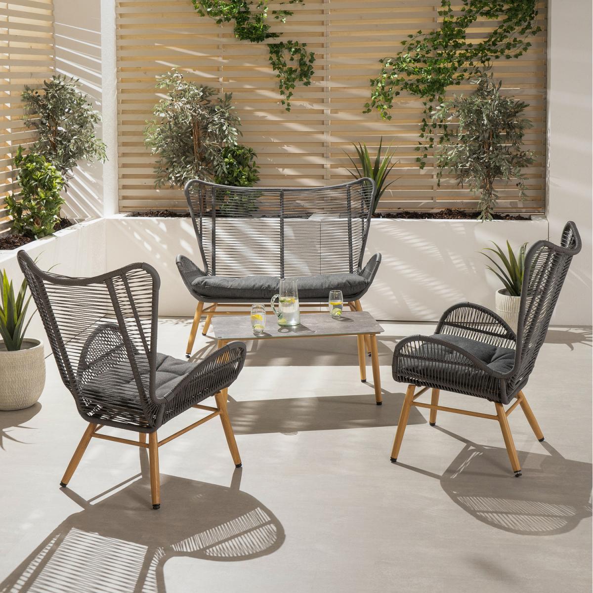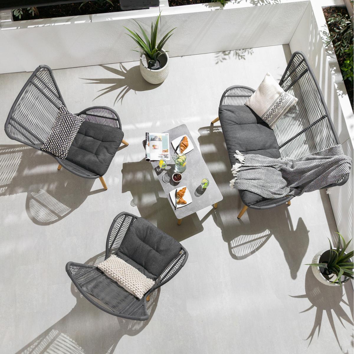 The Kingston Seating Set offers a contemporary design with its simple, sleek rounded corners and elegant high back in stylish dark grey. The set which comprises of a sofa, 2 armchairs and a coffee table is an ideal relaxed seating option with a luxurious spacious design for a comfortable fit in your outdoor space. The twisted poly rope gives the pieces a delicate, intricate look whilst being strong and durable. Thanks to the weatherproof properties of the poly rope, it will not absorb water, ensuring a taught structure with no sagging. The steel frame of the sofa, chairs and table ensures the stability and durability of the set whilst the teak effect offers the look of a subtle, natural wood grain. The perfectly proportioned coffee table with ceramic effect, tempered glass top ensures a durable surface ready for an alfresco lunch or a coffee in the sunshine. The comfortable cushions made from Olefin are extremely durable and easy to clean, perfect for outdoor living. We suggest using a cover to protect your set while not in use to maintain its quality.