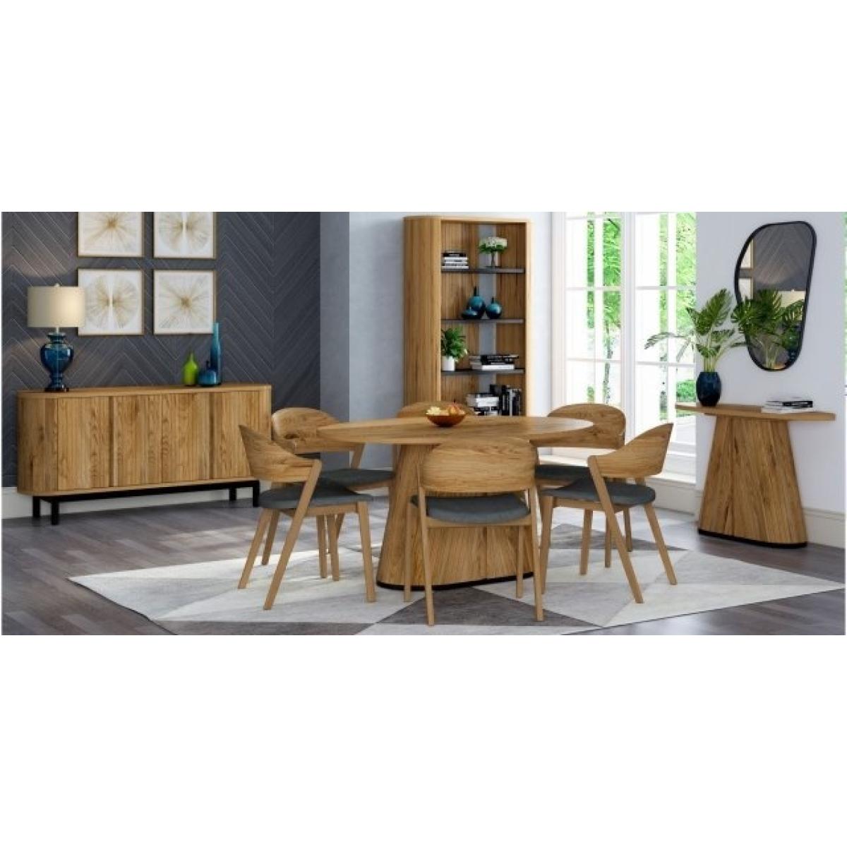 I’m a fan of this rustic oak dining table for its sturdy, sculptural base and honest wood grain - it’s a piece that grounds a space without looking bulky. It works equally well in a contemporary farmhouse scheme or a pared-back Scandinavian dining room, and the fixed six-seater format means you get generous tabletop real estate without wasted extension leaves. Styling-wise, keep things simple: a long linen runner or woven placemats, a cluster of low-profile candles or a shallow ceramic bowl with seasonal foliage, and mix-and-match chairs (or a bench and chairs) in muted tones to soften the oak’s warmth. Add a slim sideboard in a complementary wood or matt paint for extra storage and balance.