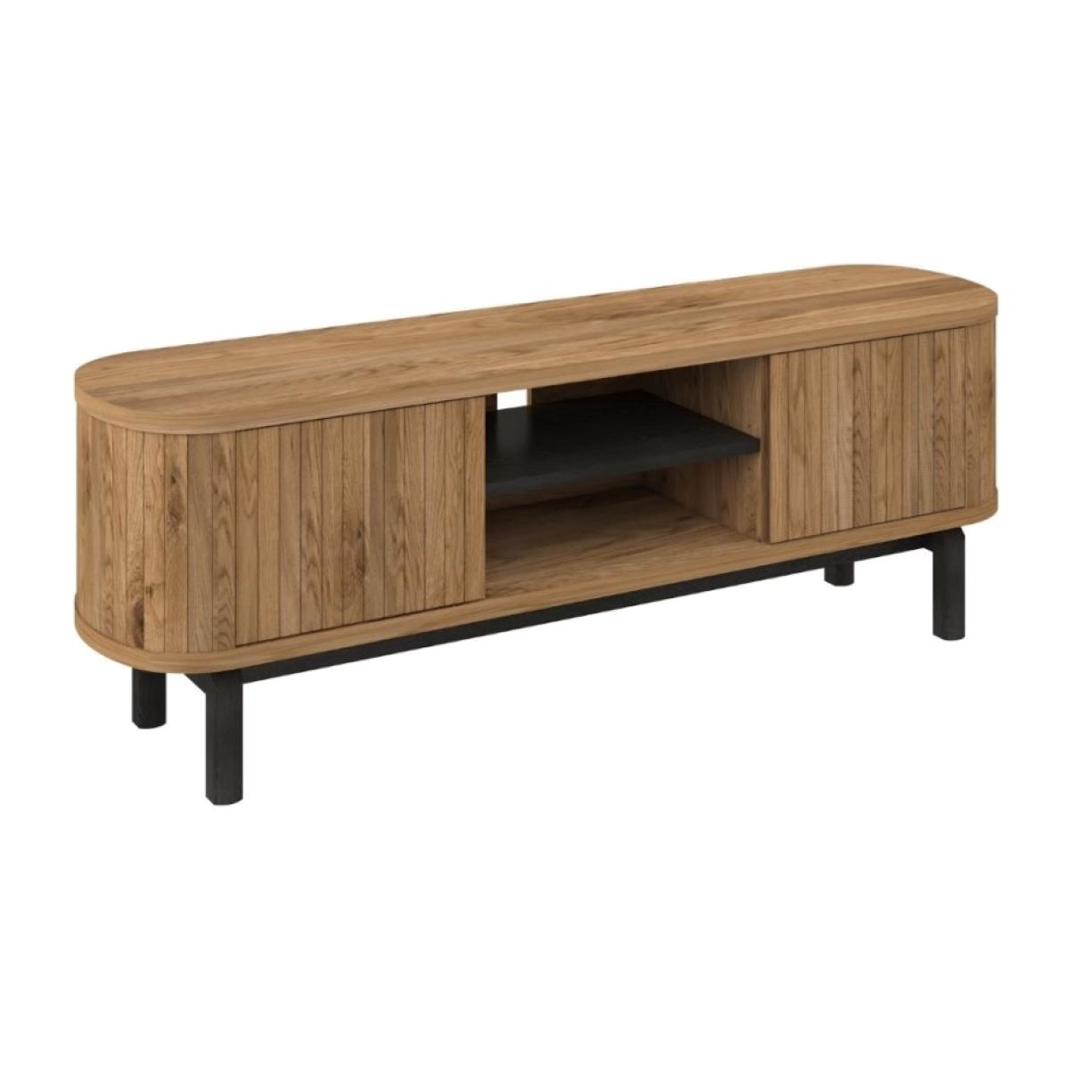 I really like this rustic oak media unit for its warm, natural finish and versatile design. It works particularly well in both contemporary and farmhouse-style interiors, adding a touch of understated charm. Its oval shape offers a softer silhouette that fits nicely into cosy living rooms, while the open shelving and concealed storage provide practical organisation options. Styling tips include layering with textured baskets or decorative books on the shelves, and pairing with neutral or muted-toned accessories to enhance the wood’s natural tones. It’s a great piece for creating a relaxed yet functional media area, especially if you favour an organic, understated vibe.