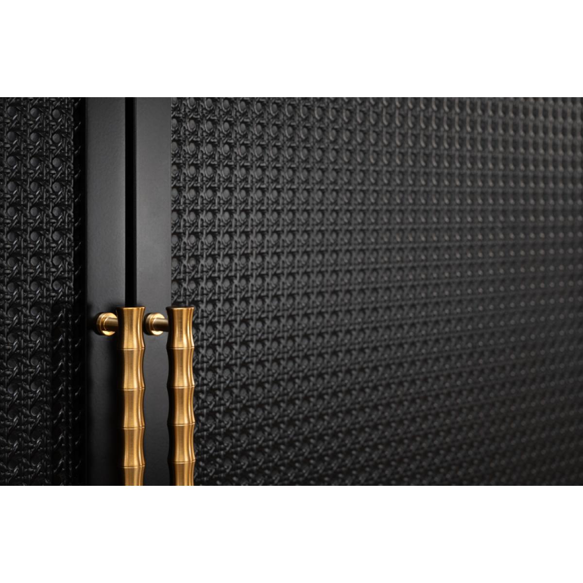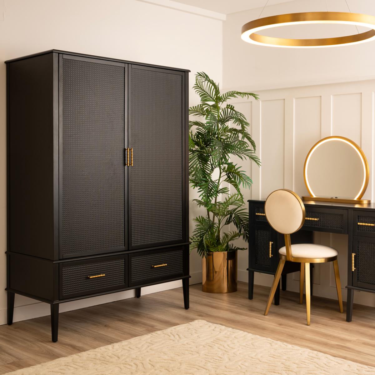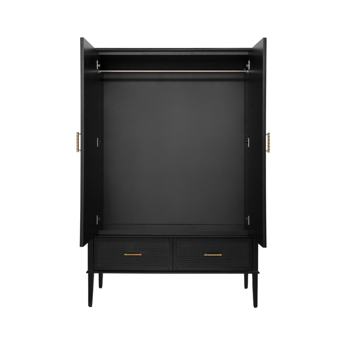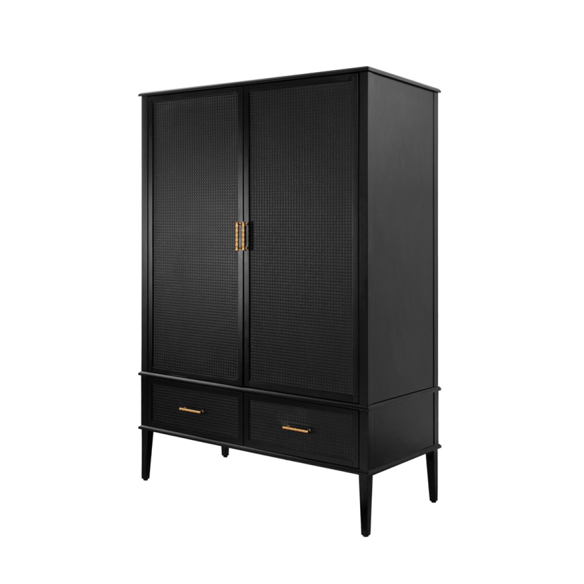 Contemporary wardrobe inspired by Colonial Caribbean interiors. Spacious hanging area and two large drawers provide generous storage. Soft close hinges and drawer runners. Solid wood and MDF construction. Durable black polyurethane paint finish. Black painted wicker detailing to door fronts. Stainless steel handles with brushed brass finish. Assembly required.