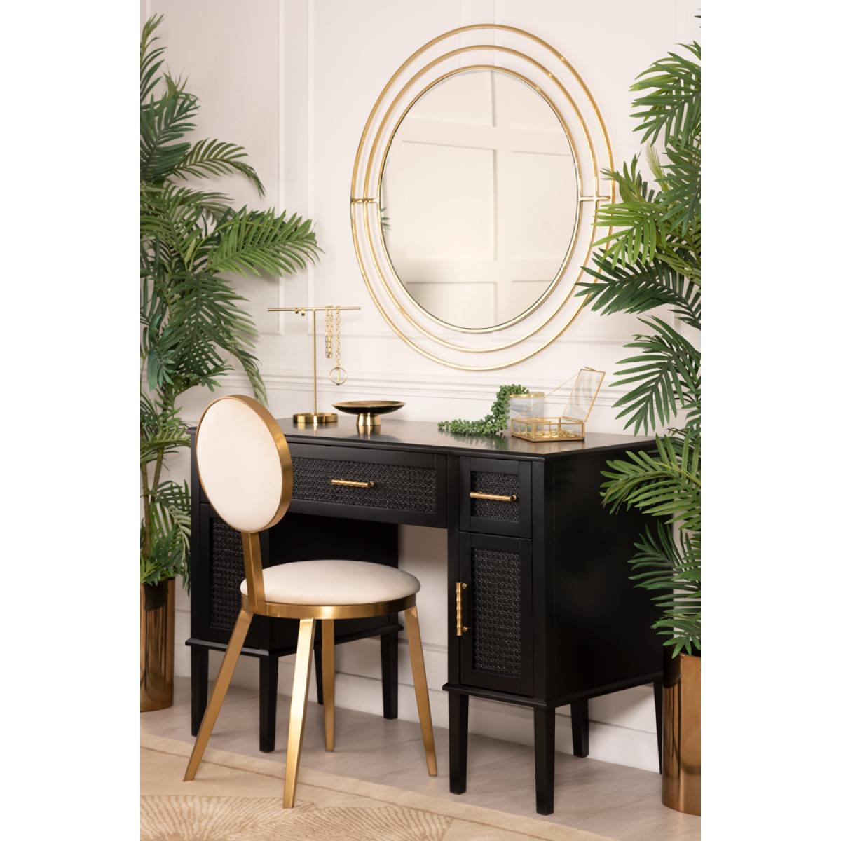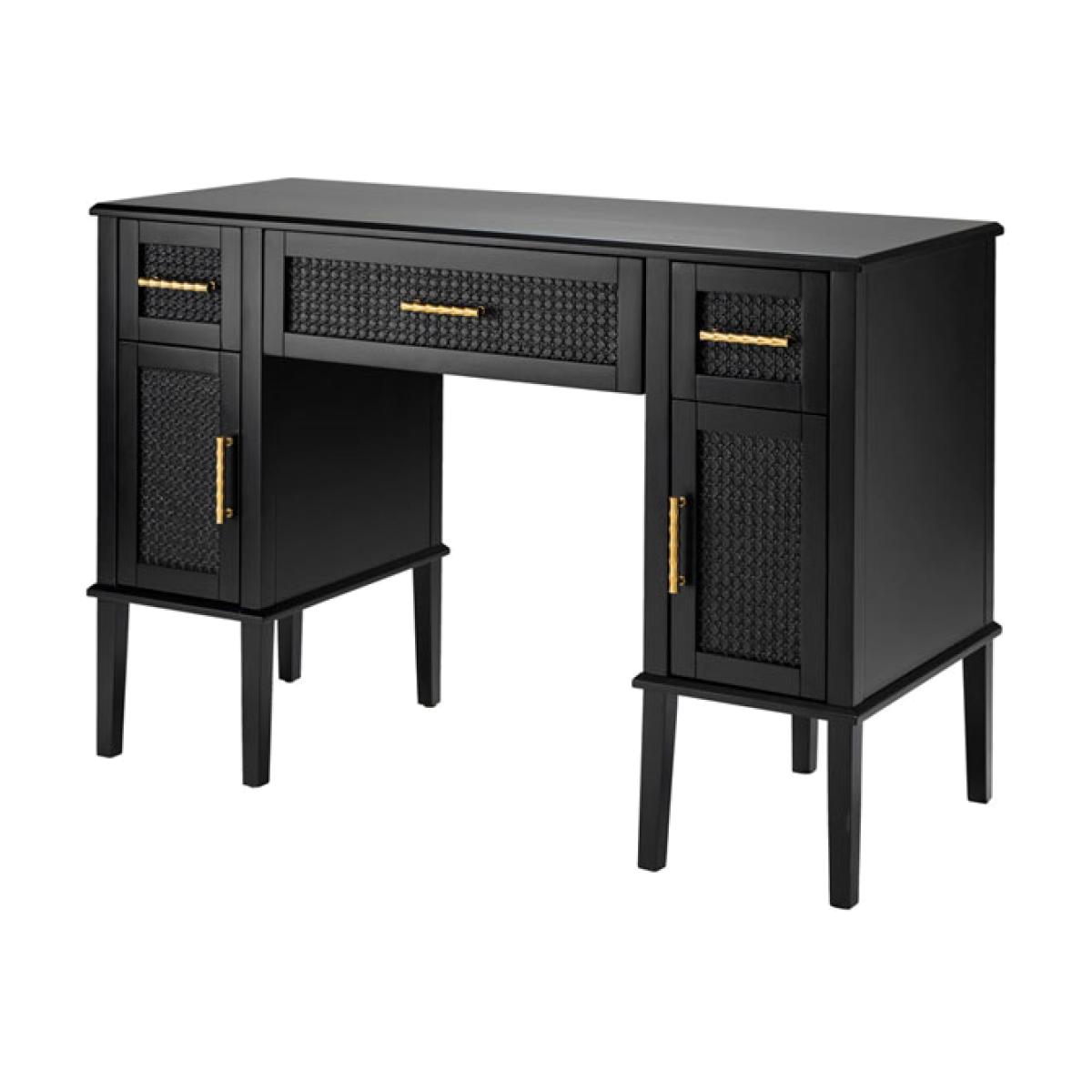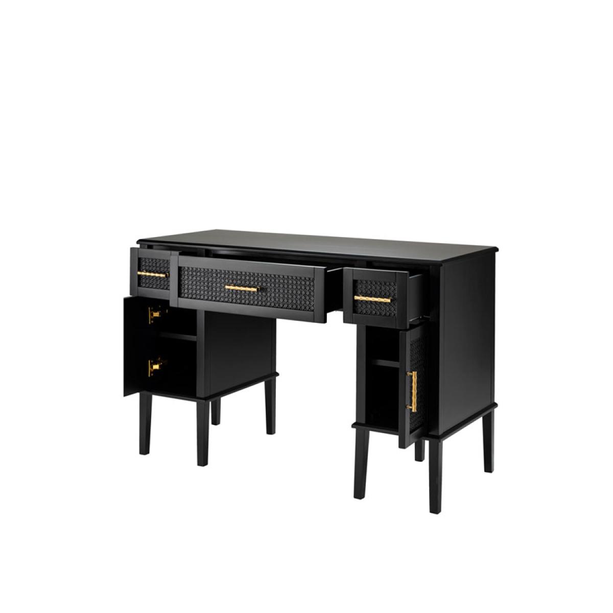 Contemporary dressing table inspired by Colonial Caribbean interiors. Three drawers and two cupboards provide generous storage for all your equipment. Cable ports to cupboards for routing hair dryers, straighteners etc. Solid wood construction. Durable black polyurethane paint finish. Black painted wicker detailing. Stainless steel handles with brushed brass finish. Soft close drawers.