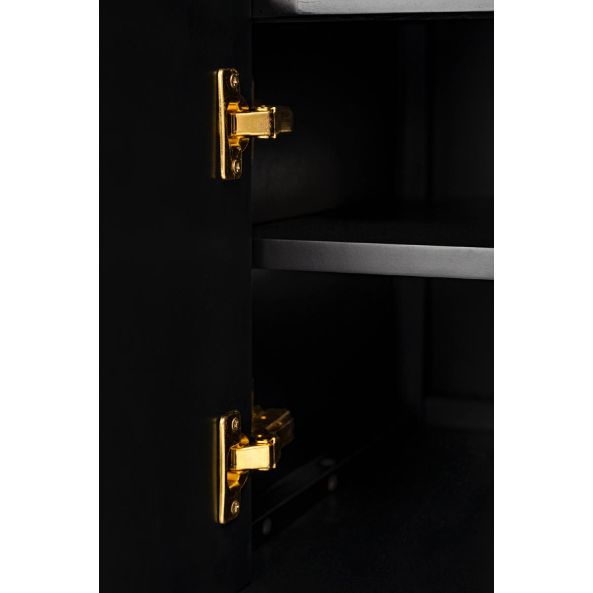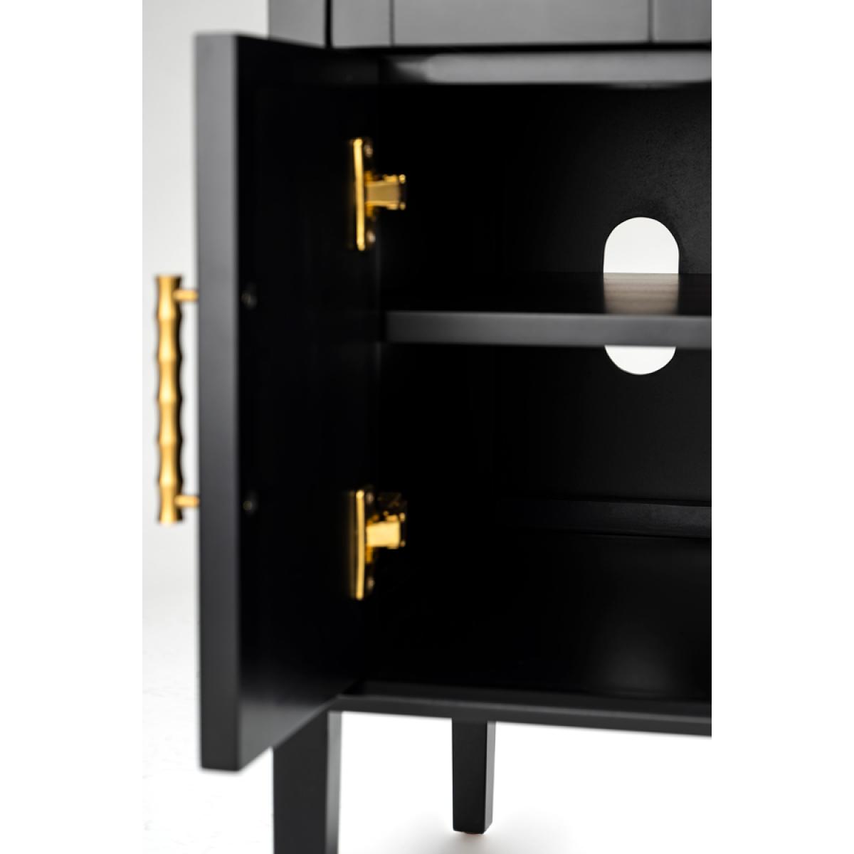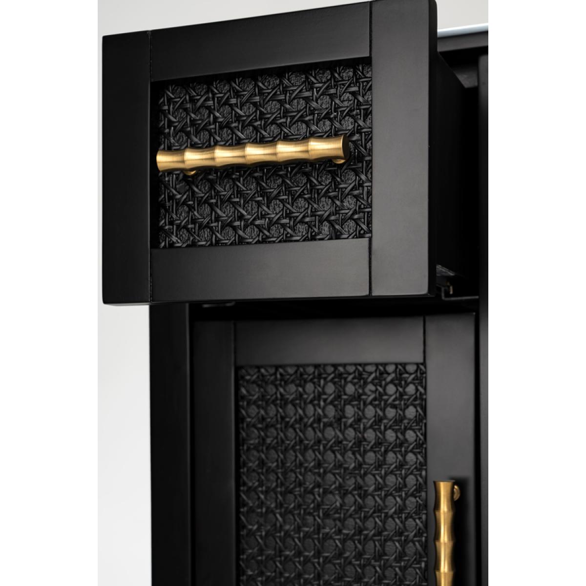 Contemporary dressing table inspired by Colonial Caribbean interiors. Three drawers and two cupboards provide generous storage for all your equipment. Cable ports to cupboards for routing hair dryers, straighteners etc. Solid wood construction. Durable black polyurethane paint finish. Black painted wicker detailing. Stainless steel handles with brushed brass finish. Soft close drawers.