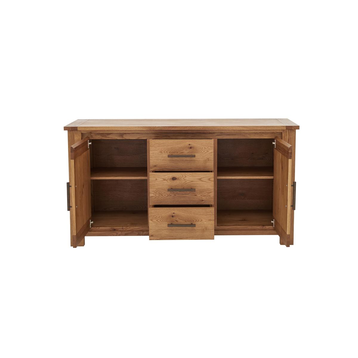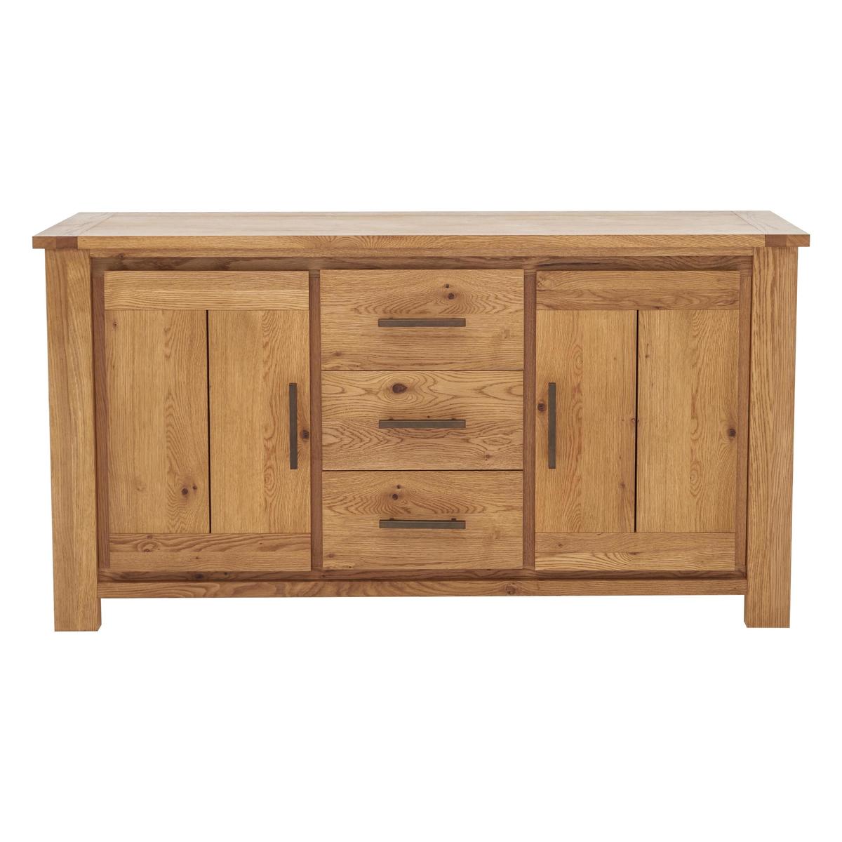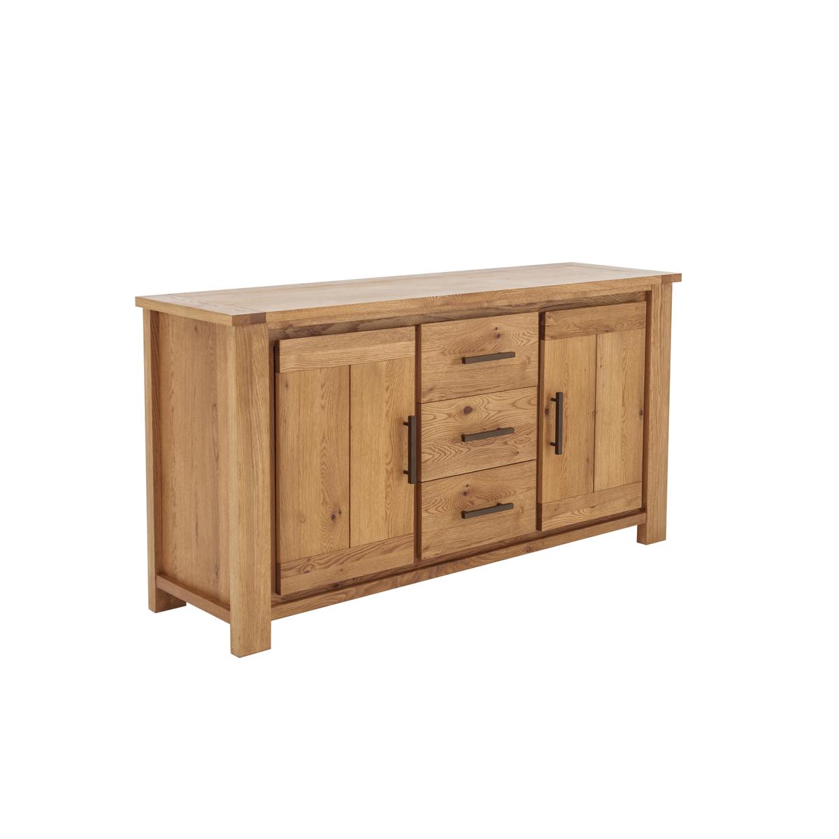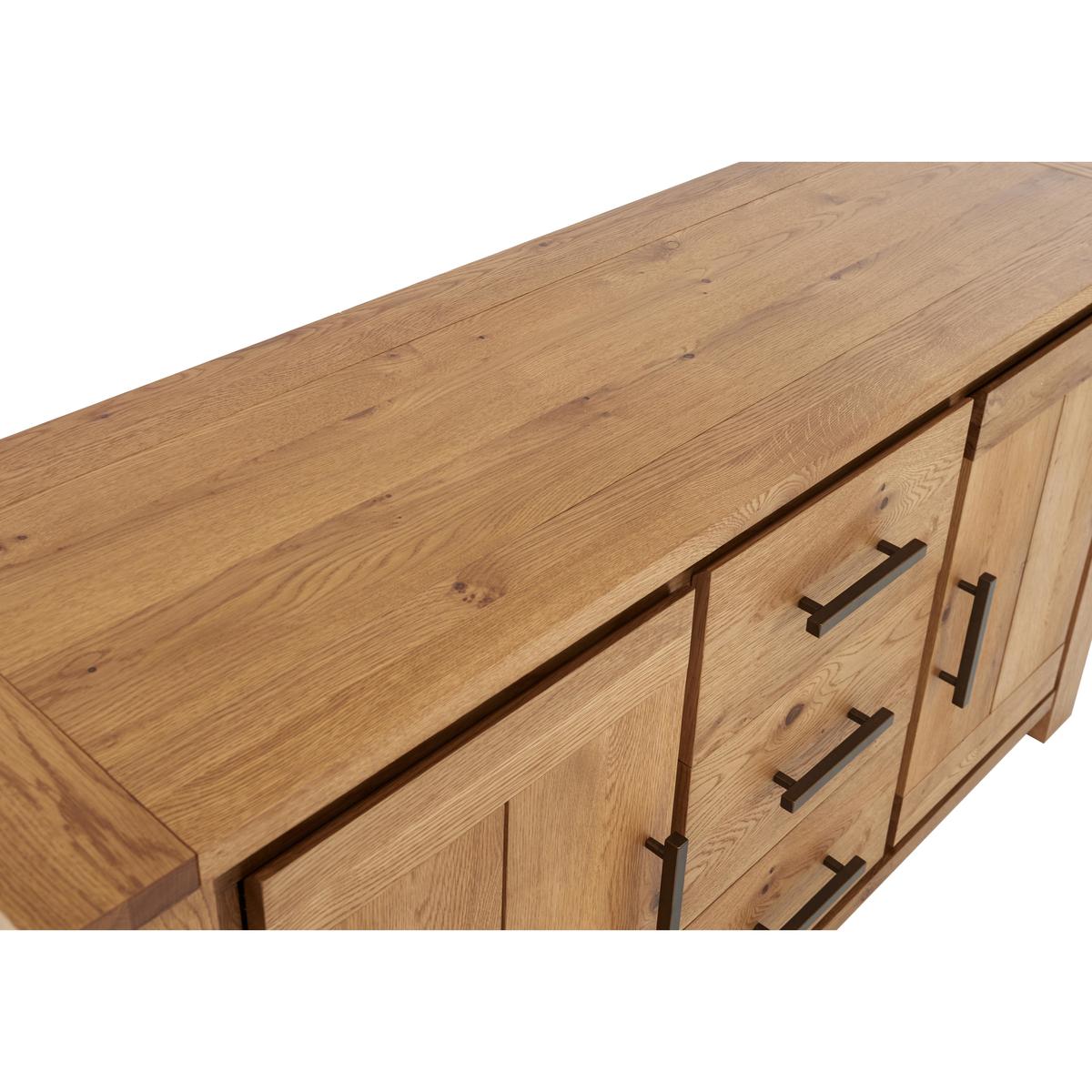 Beautifully finished and wonderfully spacious, the Kingswood sideboard is the perfect piece for anyone who loves real oak furniture. This modern rustic-style sideboard is made of solid knotty oak with rustic oak veneers, and has simple square lines and an overhanging top. There are two roomy cupboards with adjustable shelves, and the three central drawers have Blum soft-close runners and bespoke antique brass finish handles. The attractive rustic oiled finish and geometric door panelling ensures that this piece fits beautifully into both traditional and contemporary interiors. The Kingswood sideboard is part of the Kingswood living and dining collection which includes a fantastic extending dining table with oversized velvet dining chairs and occasional tables. Only at Furniture Village. Did you know? Oak is natural with characterful knots and markings, every piece of furniture is unique.
