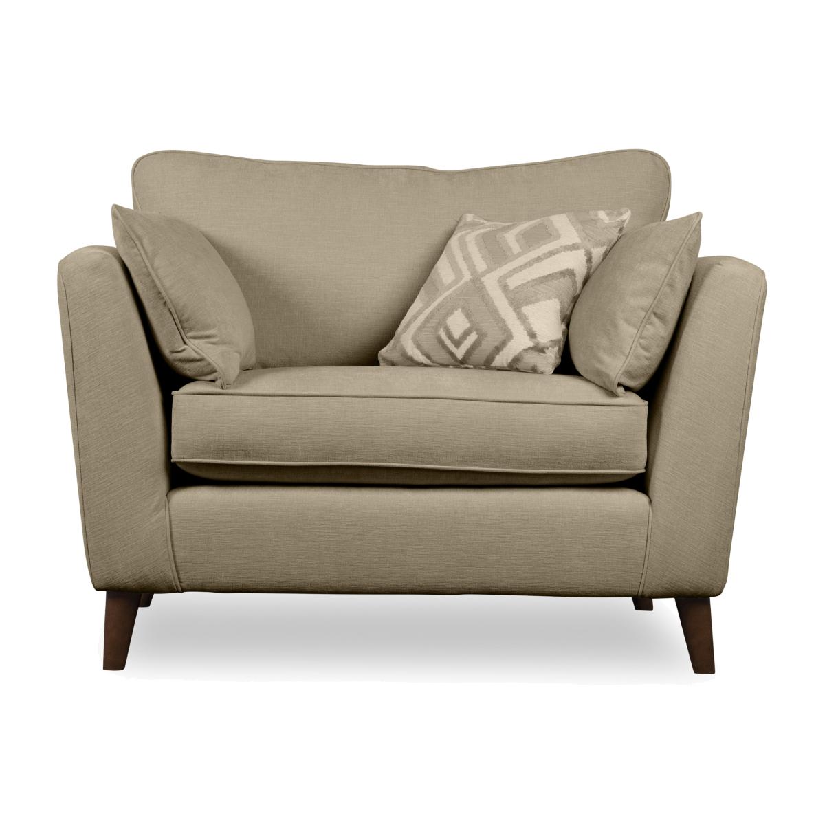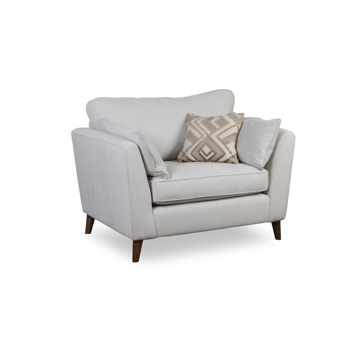 Behind the simple, elegant look of the modern sofas, chairs and storage footstool in our Kinley range is an impressive array of features designed to offer the ultimate in comfort and support. You’ll enjoy sprung seats and backs, luxurious cushioning, feather-filled arm bolsters and scatter cushions, long-lasting reversible seat and back cushions and gorgeously soft chenille upholstery. The look is cleverly understated to fit with all styles of décor, and with generous proportions, nice wide arms and a well-structured silhouette, every piece in the collection is so inviting. Handcrafted in the UK, the Kinley range is exclusively available at Furniture Village. Modern and understated, our Kinley snuggler is anything but minimal when it comes to comfort. Generously sized, it has a sprung seat and back, luxurious cushioning and feather arm bolsters and scatter cushion. Why you'll love it Understated style meets oversized comfort in our Kinley range. This large snuggler is elegant and modern with a host of comfort features. Reversible seat and back cushioning for long-lasting comfort and style. Sprung seat and back for fabulous all-over support. Comes complete with 2 matching feather arm bolsters and a coordinating feather scatter. Gorgeously soft woven chenille upholstery in a choice of colours. Solid oak legs in a fashionable dark wood finish. Handcrafted in the UK exclusively for Furniture Village. This snuggler is part of our Kinley range. What you need to know Medium comfort level. Seat suspension: 9-gauge steel spring. Seat cushioning: foam. Seat cushioning is reversible. Back suspension: webbing. Back cushioning: fibre. Back cushioning is reversible. Feet are removable. Plump and turn cushions regularly. Some fabrics can show wear on areas of more use or in direct sunlight. Clean regularly using a soft brush or vacuum with the curtain attachment. Deal with any spills promptly. Professional cleaning advised for oil- and grease-based stains. Please read our upholstery care guide for more advice. Item code: KINLSNUGTRUF-001