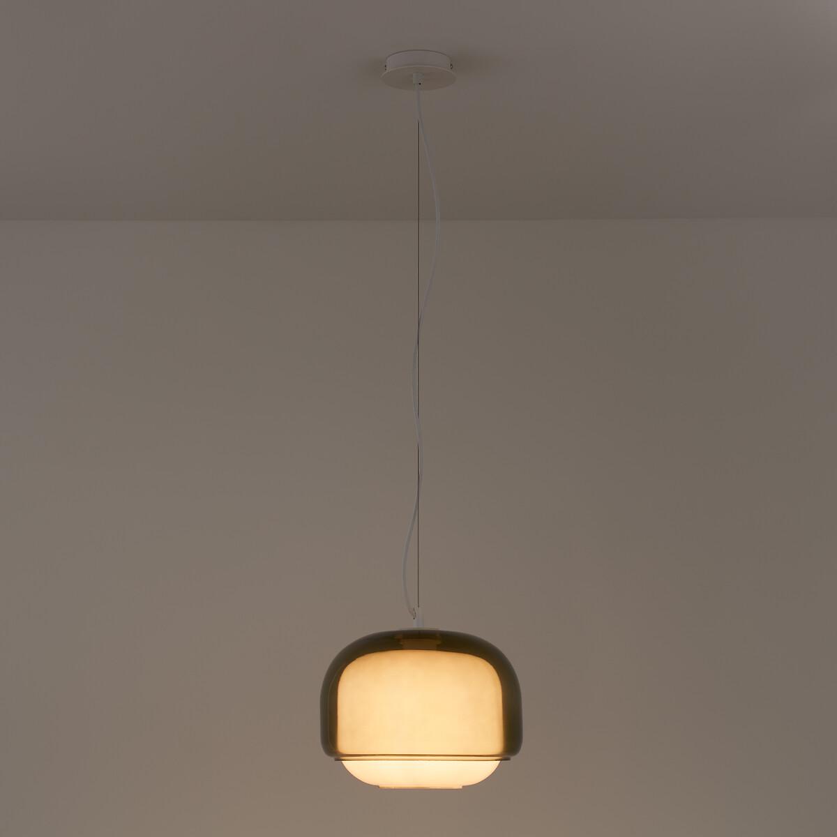 The Kinoko glass lampshade. This double coloured glass lampshade has a retro feel and will flood your home with a gentle light. Product Details • Pendant lamp with double shade in coloured glass • Steel structure covered with epoxy paint • Support for E27 socket for LED bulb of 9W max (not supplied) • Each piece is unique, the glass is hand blown and may vary slightly from one product to another. Dimensions • Diameter 30.5cm • Height: 106cm. Dimensions and weight of parcel1 parcel • 55 x 39 x 39cm • 3.3kg