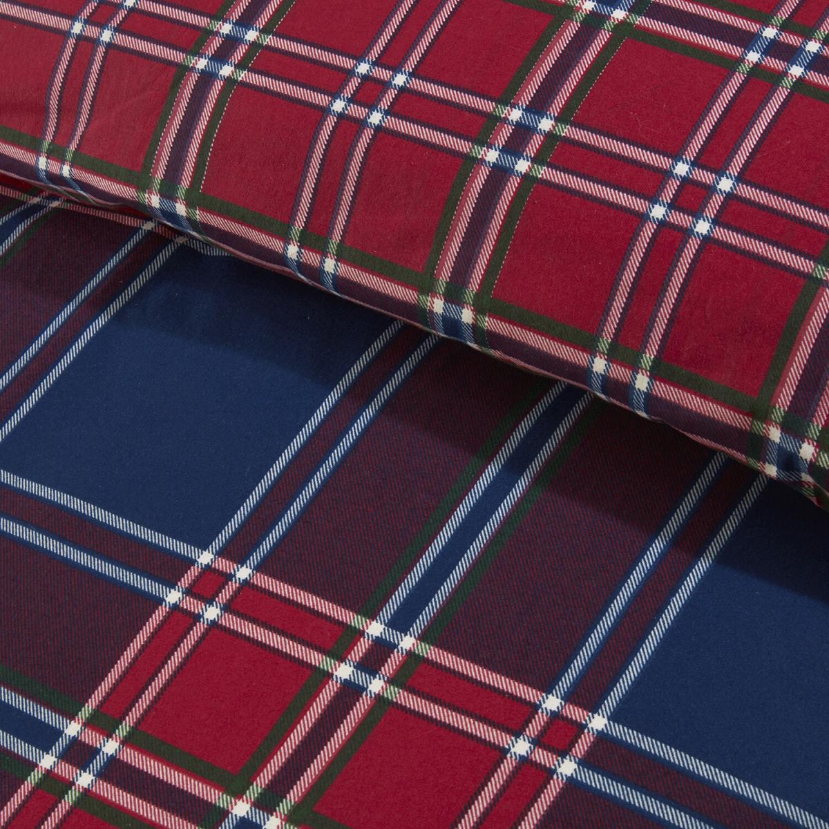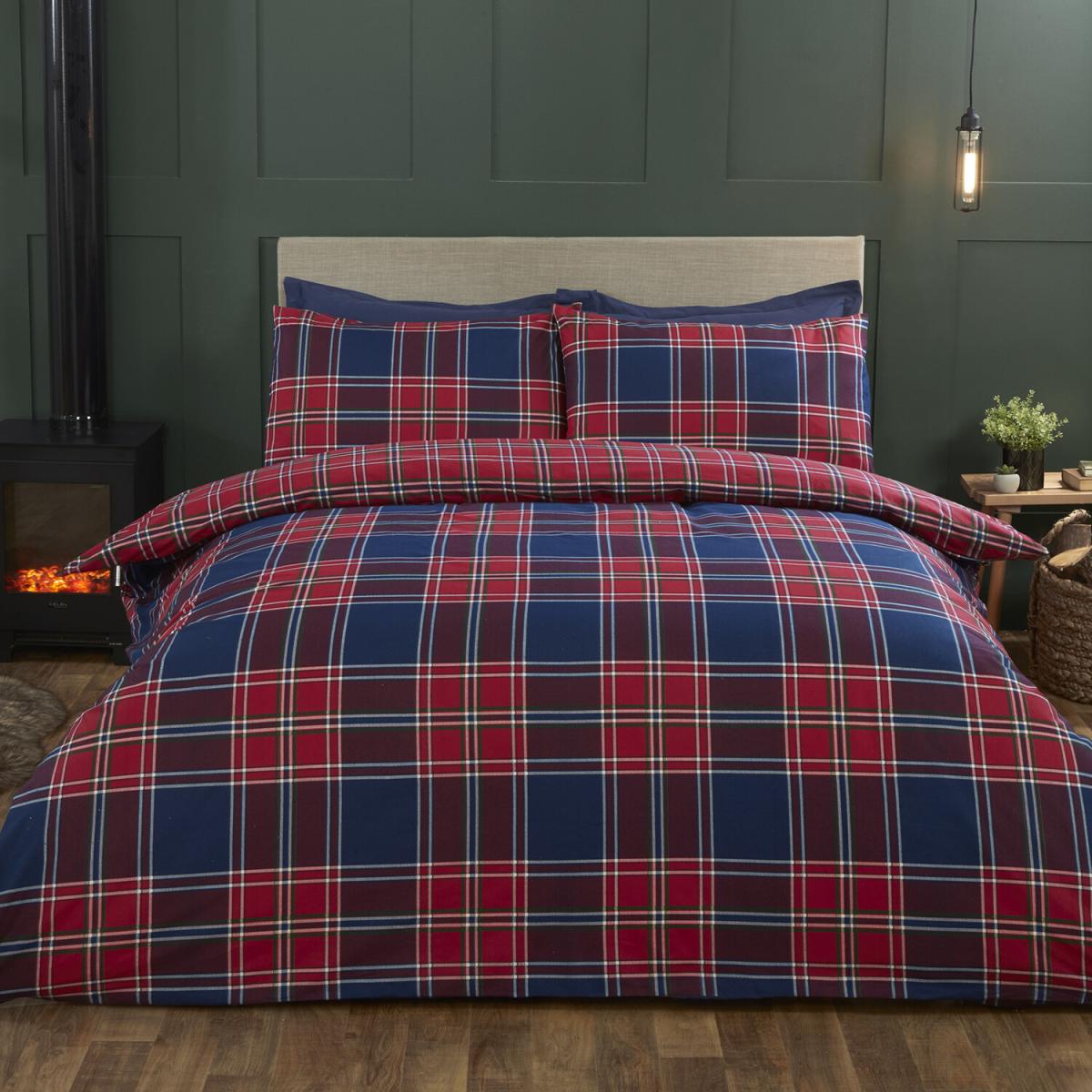 Offering two duvet sets in one, the traditional Kinross Check Duvet Cover and Pillowcase Set features a reversible design with a different check print on each side. Crafted from 100% cotton, this cosy bedding set is printed in classic red and blue tones and comes complete with matching pillowcases.
