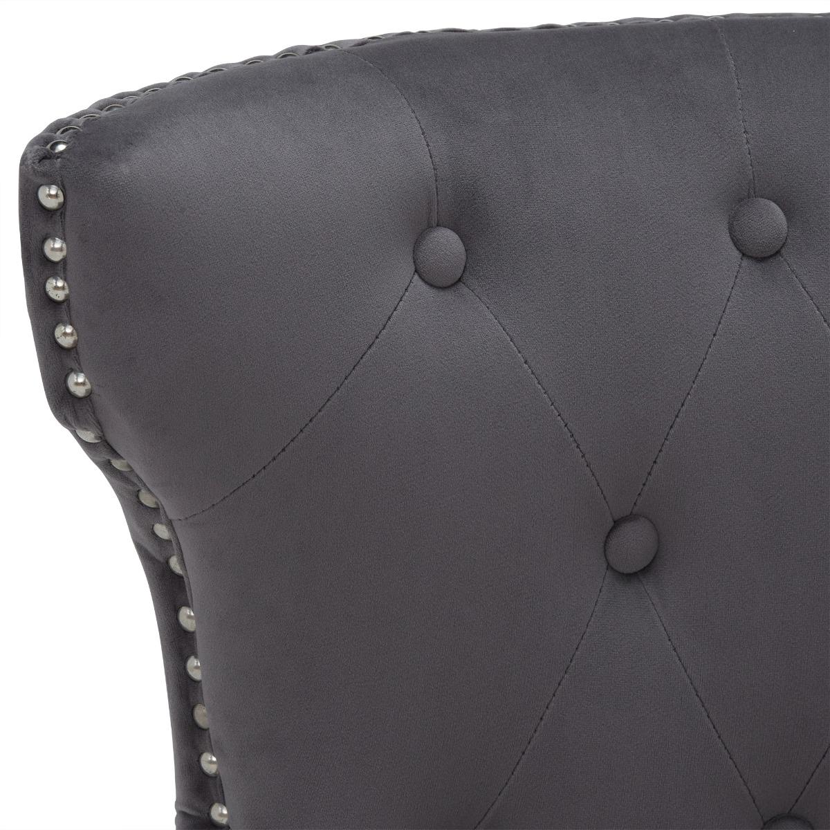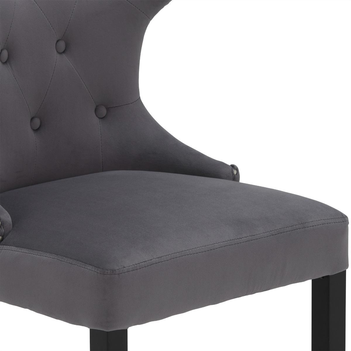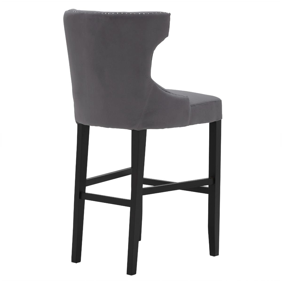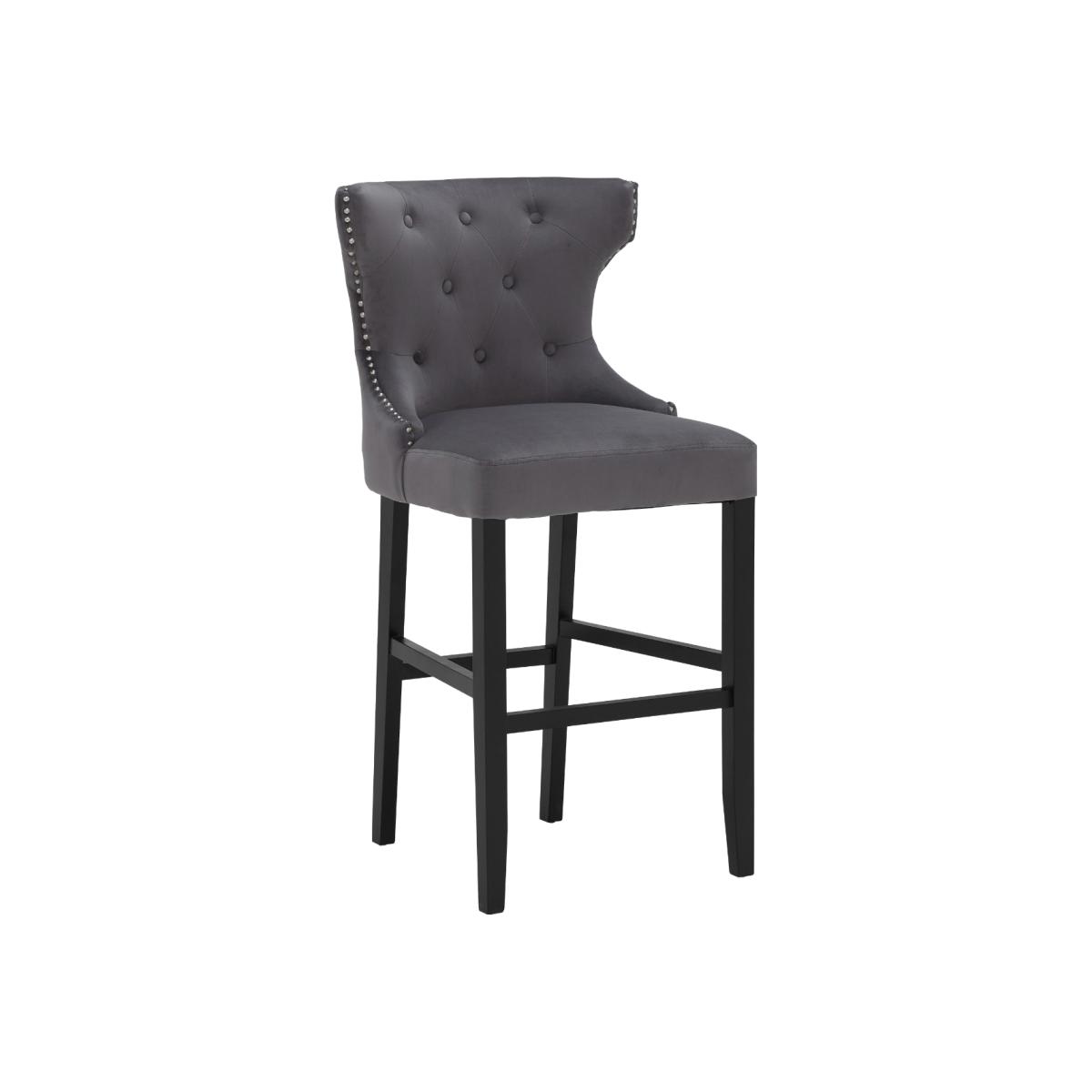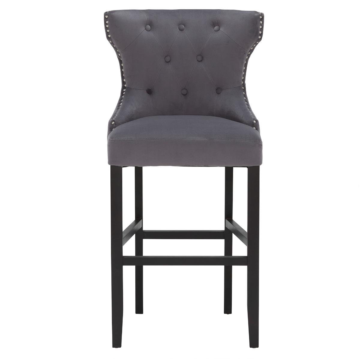 Design. Draped in luxurious velvet upholstery and finished with stylish stud detailing, the Kinsey Bar Stool will be a glamorous addition to your kitchen and dining area. The curvaceous back is foam filled for added comfort, perfect for propping yourself at the bar for a drink or two. The Grey Kinsey Bar Stool is supported by slim wood legs with an espresso finish, it will fit in effortlessly in modern or traditional interior settings.