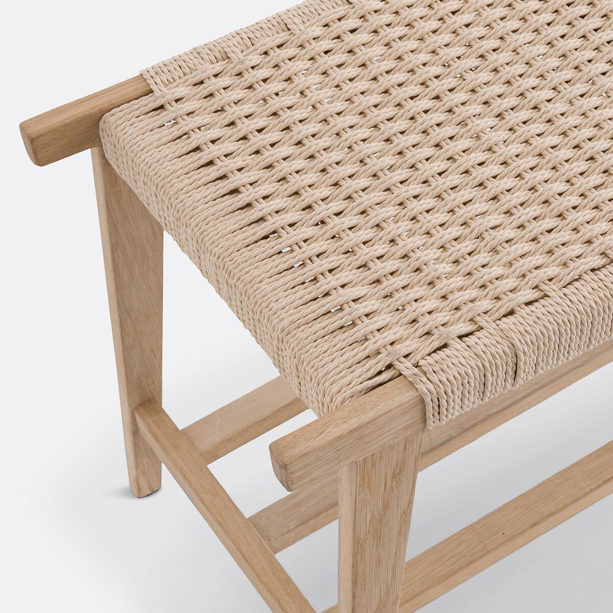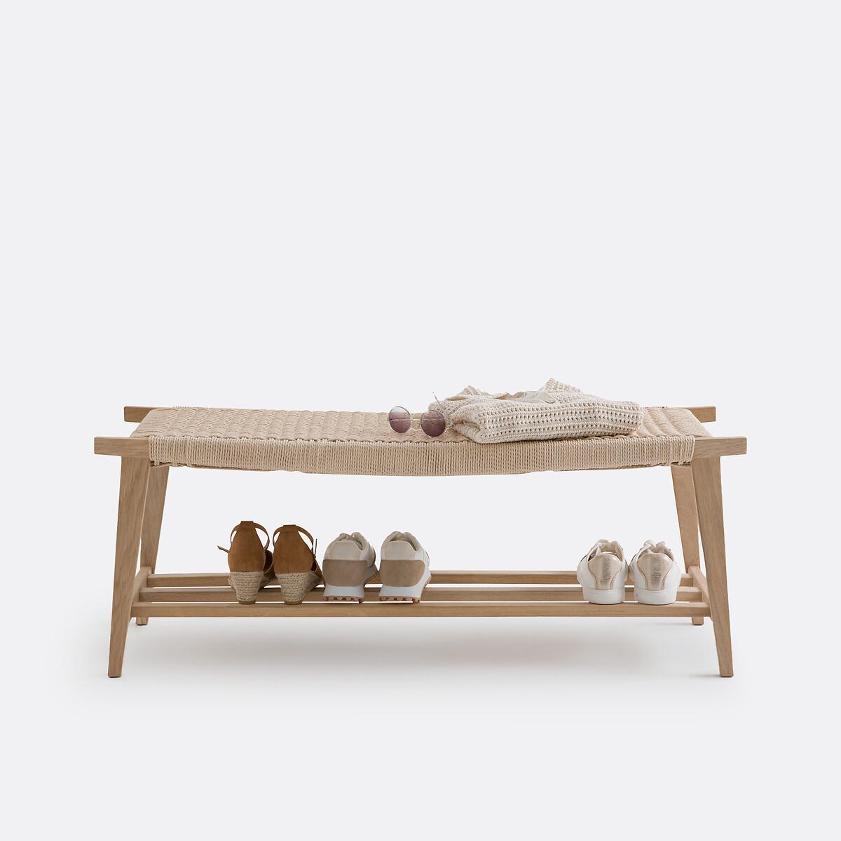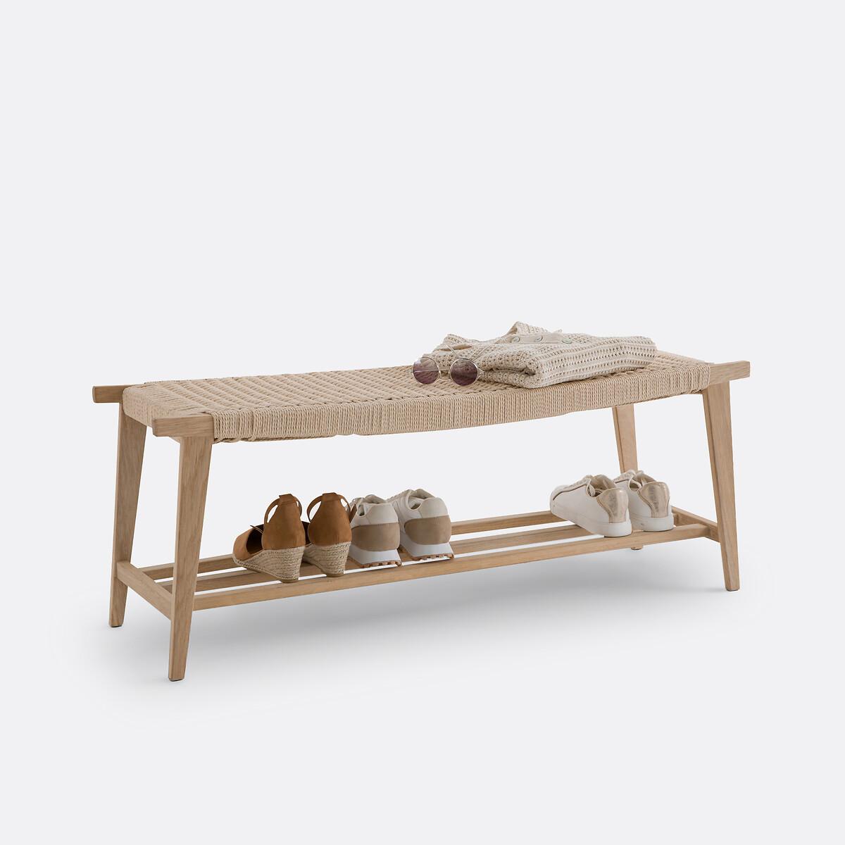 Solid oak with a hand-woven paper rope seat. In a 'Japandi' spirit, the Kioto bench combines the beauty of Japanese style with the timeless elegance of Scandinavian furniture. Product Details • Solid oak, nitrocellulose finish and hand-woven paper rope • FSC® Mixed certified wood • 1 lower shelf for shoes • Wall mounting system included, screws and dowels not providedDimensions. Overall • Width: 110cm • Height: 42cm • Depth: 35cm • Weight: 6.5kg. Usable space • Shelf:L101.5 x H25.5 x D23cmDelivery:. Sold pre-assembled. Available for home delivery. • WOOD FROM MORE SUSTAINABLY MANAGED FORESTS AND CONTROLLED SOURCES. FSC® Mix wood contains at least 70% FSC® certified and/or recycled wood, the remainder being FSC® controlled wood. Parcel dimensions and weight • 1 parcel • L115 x H49 x D41cm. 8.5kg.