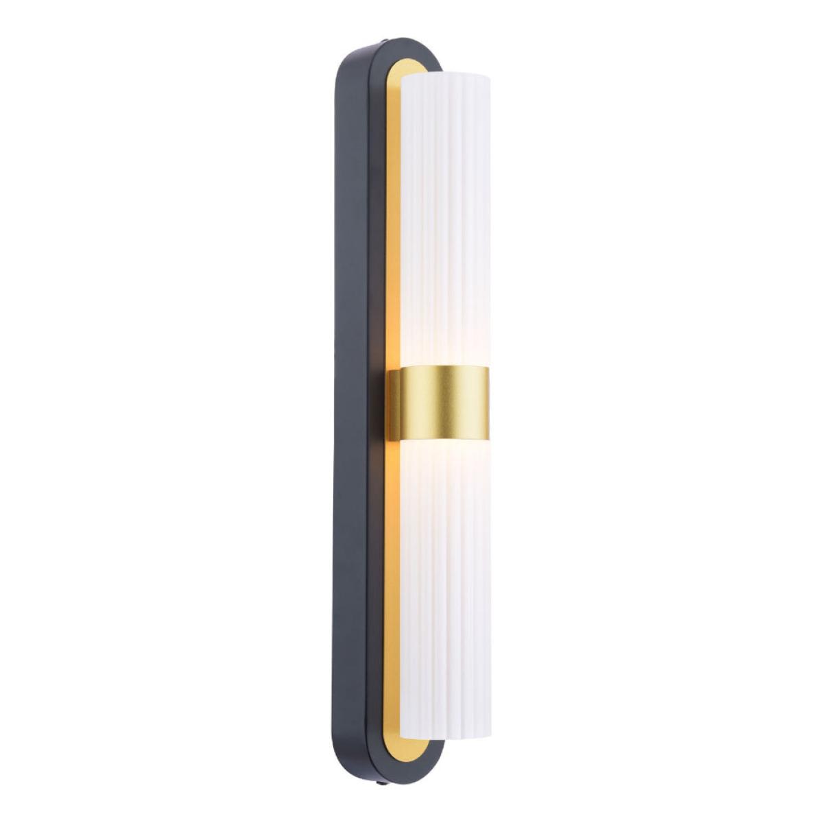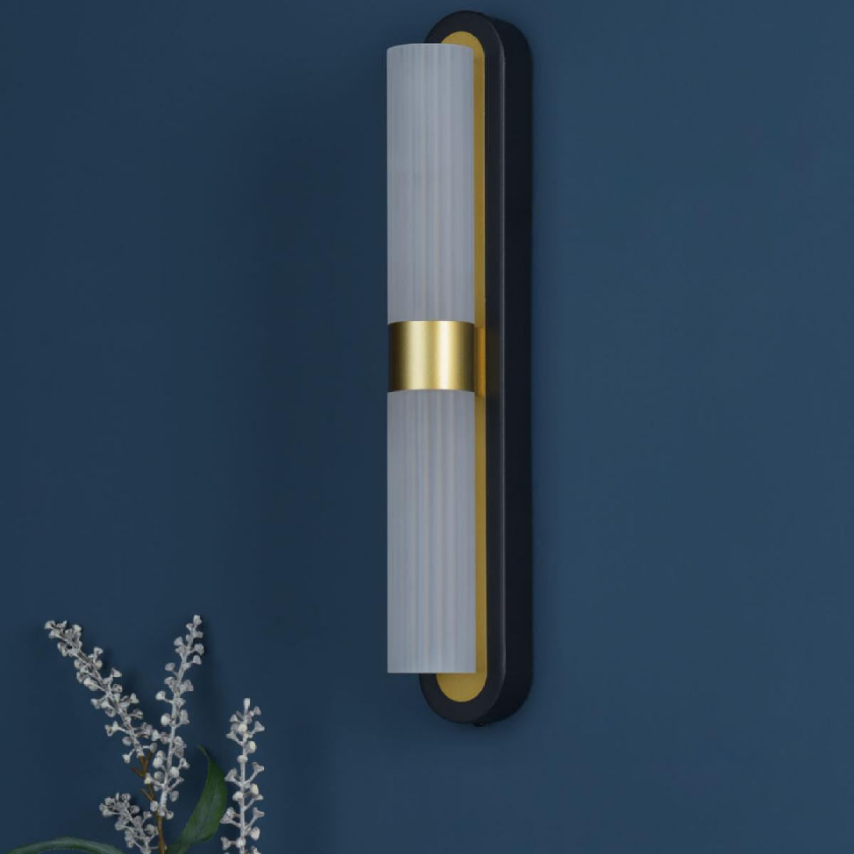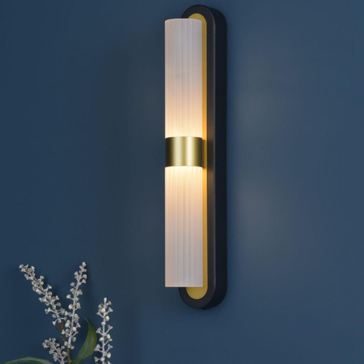 Combines modern sophistication with Art Deco-inspired style. Featuring a black and gold frame with ribbed glass diffusers, this elegant 2-light wall fixture provides a warm, ambient glow that enhances any interior. Perfect for hallways, living rooms, or bedrooms, the Kira adds a touch of luxury and refinement to your wall lighting scheme.