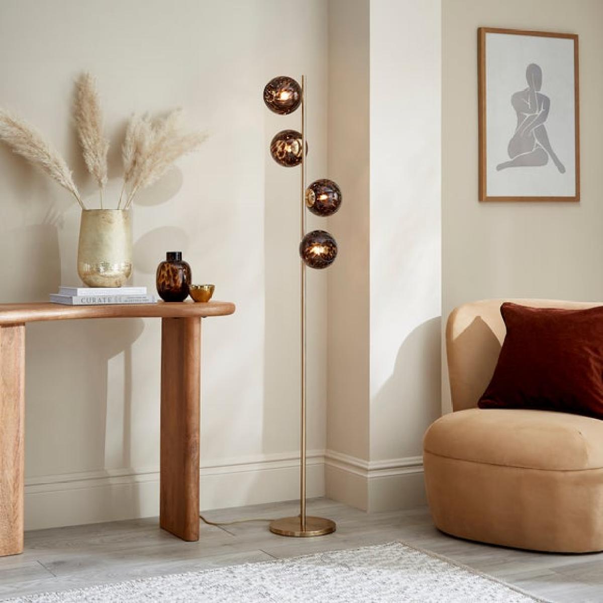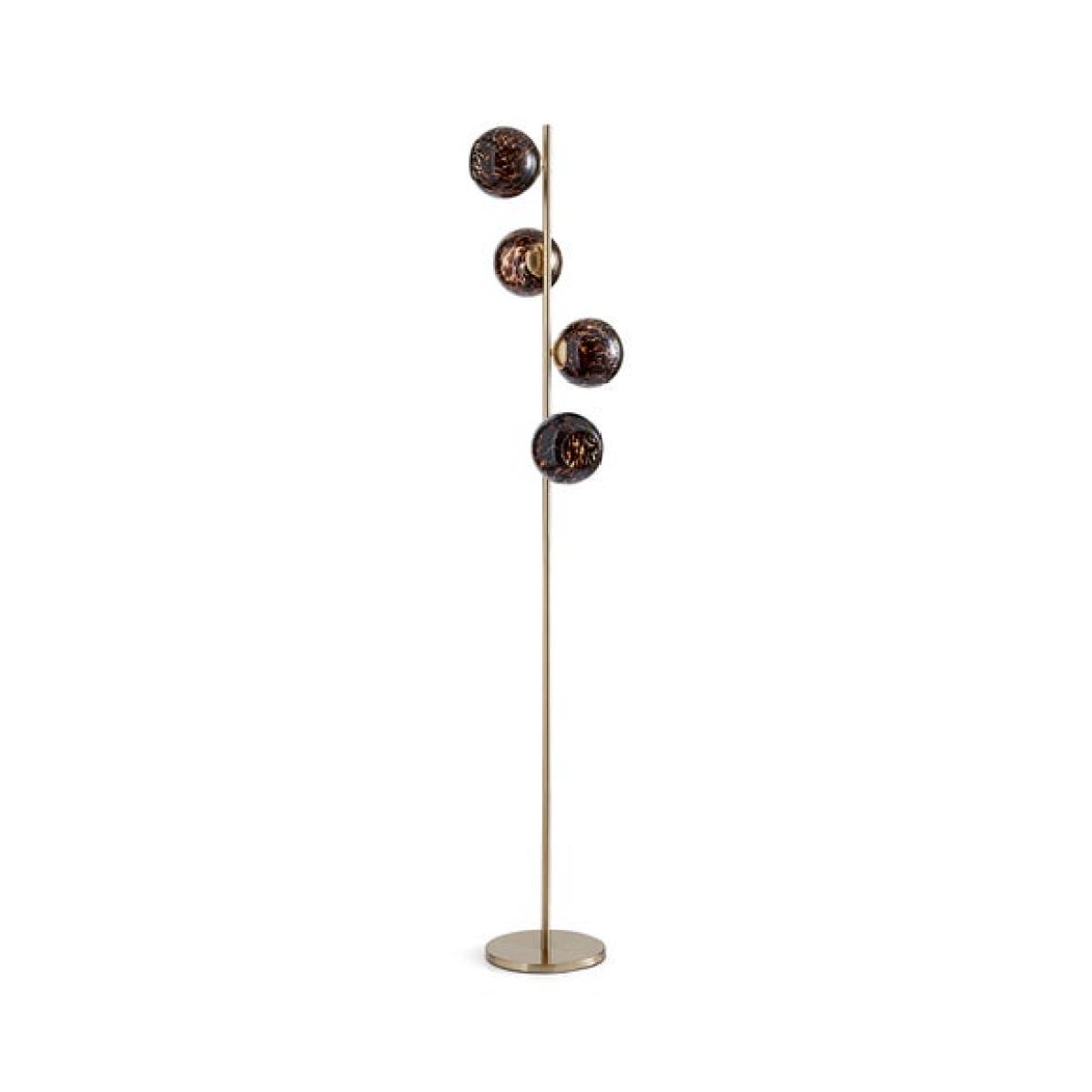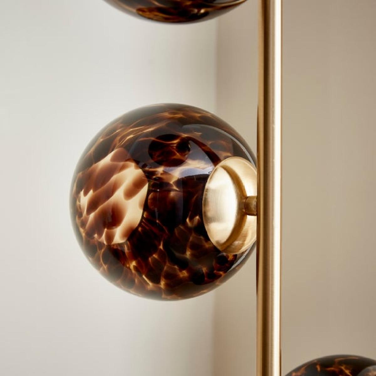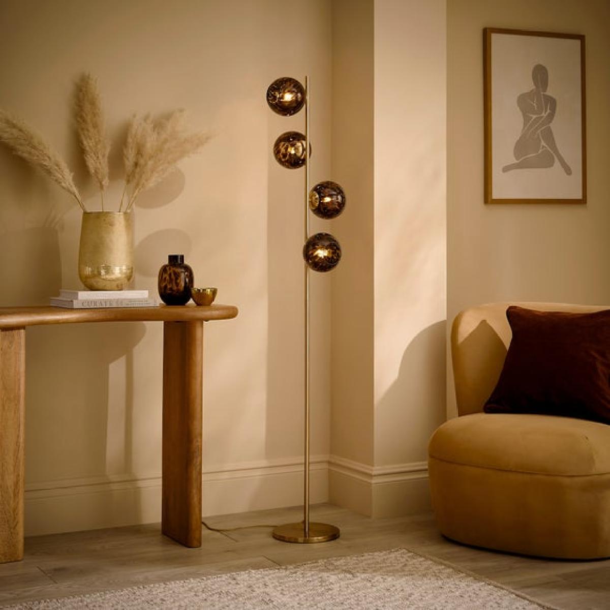 * Tortoiseshell Design * Made from Steel and Glass * Matching Items Available Elevate your interiors with the Kira 4 Light Tortoiseshell Floor Lamp. Featuring four glowing tortoiseshell glass globes on a brass stem with a fabric flex, it’s a stylish statement piece. Matching items available to complete your lighting scheme.