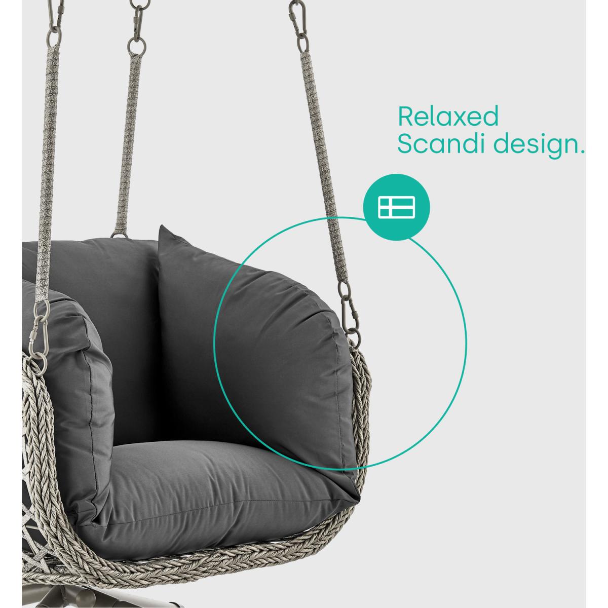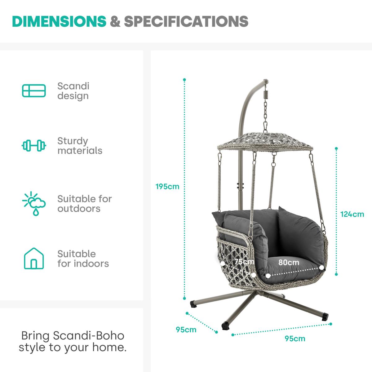 I love this hanging rattan swing with canopy for its relaxed yet stylish vibe, ideal for adding a cosy corner to outdoor or indoor spaces. Its neutral grey finish means it seamlessly fits into contemporary, boho, or coastal interiors. To style it effectively, pair with soft cushions and a textured rug to soften the look and create a comfortable retreat. It works well in patios, conservatories, or even as a standalone feature in a brightly lit corner of a living room or bedroom. Practical tips include ensuring it’s positioned where it won’t obstruct walkways and adding some greenery nearby for an added touch of nature. Overall, it’s a versatile piece that invites relaxation without compromising on style.