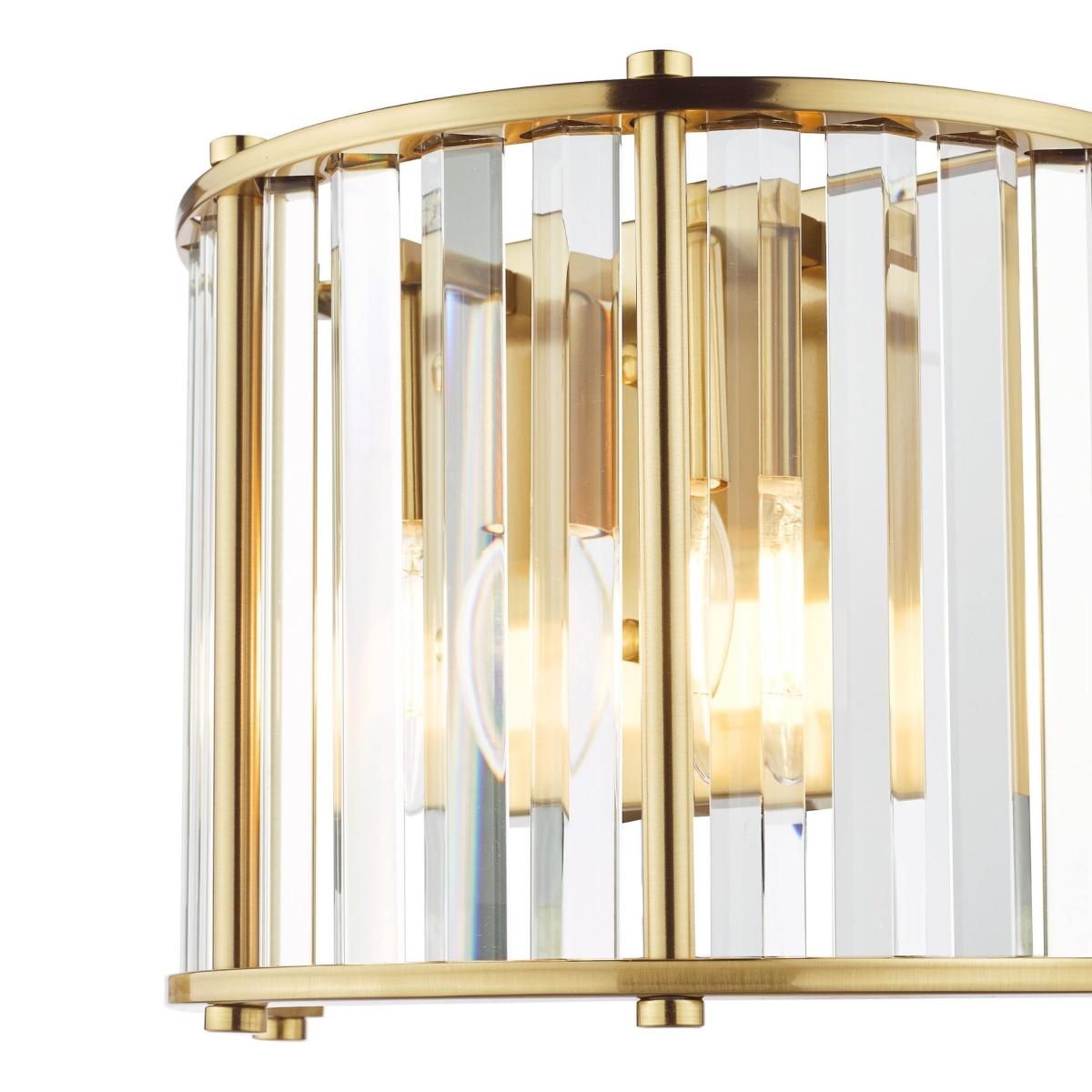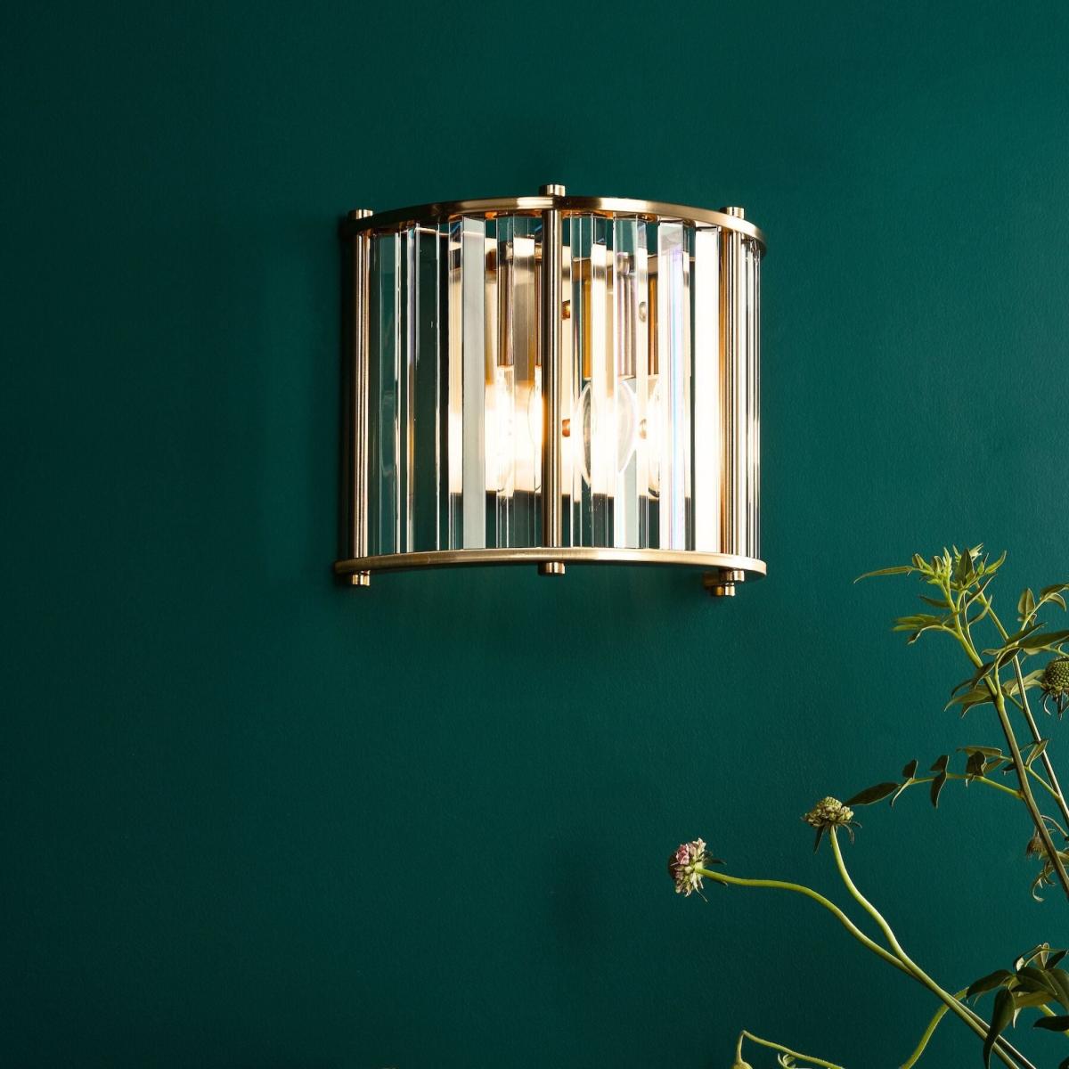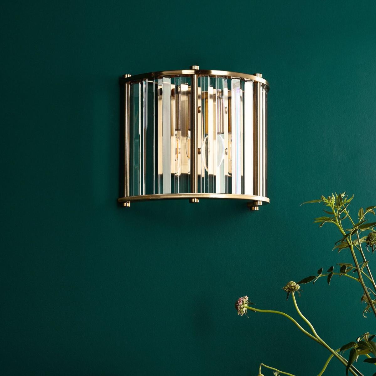 Kiran 2-light wall light, featuring a natural brass frame that houses faceted glass crystals. The Kiran wall light combines bold contemporary design with luxurious detailing to elevate any interior space. Its natural brass frame offers a sleek, timeless structure that elegantly cradles faceted glass crystals, designed to catch and reflect light in mesmerizing patterns. The dual-light configuration provides ample illumination while maintaining a chic and understated aesthetic. Perfect for living rooms, hallways or bedside settings, this wall light adds a touch of sophistication to a range of decor styles, from traditional-chic to modern glamour. Whether installed as a standalone piece or paired with other lights from the Kiran range, it creates a warm, inviting ambiance with an air of classic elegance. Part of the Kiran collection. Kiran 2-light wall light, featuring a natural brass frame that houses faceted glass crystals. The Kiran wall light combines bold contemporary design with luxurious detailing to elevate any interior space. Its natural brass frame offers a sleek, timeless structure that elegantly cradles faceted glass crystals, designed to catch and reflect light in mesmerizing patterns. The dual-light configuration provides ample illumination while maintaining a chic and understated aesthetic. Perfect for living rooms, hallways or bedside settings, this wall light adds a touch of sophistication to a range of decor styles, from traditional-chic to modern glamour. Whether installed as a standalone piece or paired with other lights from the Kiran range, it creates a warm, inviting ambiance with an air of classic elegance. Part of the Kiran collection.