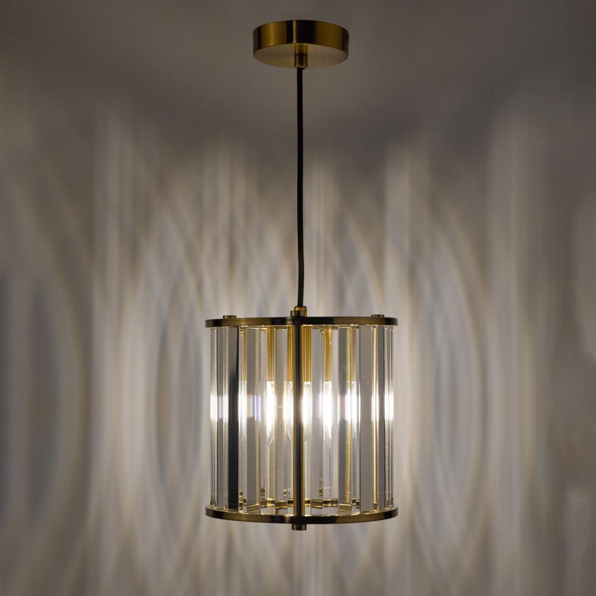Kiran 1-light pendant ceiling light, featuring a natural brass frame that houses a faceted glass crystal shade. The Kiran pendant ceiling light combines modern minimalism with a touch of luxurious elegance. The warmth of the natural brass frame adds a touch of traditional charm, perfectly complementing the stunning faceted crystal shade. The crystal’s intricate design catches and refracts light beautifully, creating a dazzling display of sparkle and warmth. Designed for hallways but also ideal for living areas, dining rooms and bedrooms, the Kiran pendant light serves as both a practical light source and a striking focal point. Its sophisticated design allows it to enhance a variety of interior styles, from industrial-chic to modern glam. Whether hung individually or in a cluster, this pendant exudes timeless appeal and refined character. Part of the Kiran range. Kiran 1-light pendant ceiling light, featuring a natural brass frame that houses a faceted glass crystal shade. The Kiran pendant ceiling light combines modern minimalism with a touch of luxurious elegance. The warmth of the natural brass frame adds a touch of traditional charm, perfectly complementing the stunning faceted crystal shade. The crystal’s intricate design catches and refracts light beautifully, creating a dazzling display of sparkle and warmth. Designed for hallways but also ideal for living areas, dining rooms and bedrooms, the Kiran pendant light serves as both a practical light source and a striking focal point. Its sophisticated design allows it to enhance a variety of interior styles, from industrial-chic to modern glam. Whether hung individually or in a cluster, this pendant exudes timeless appeal and refined character. Part of the Kiran range.