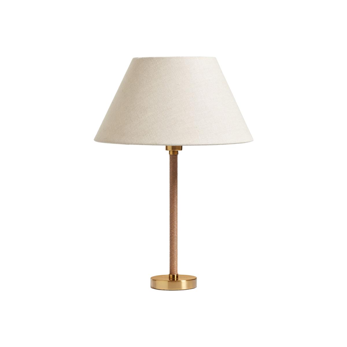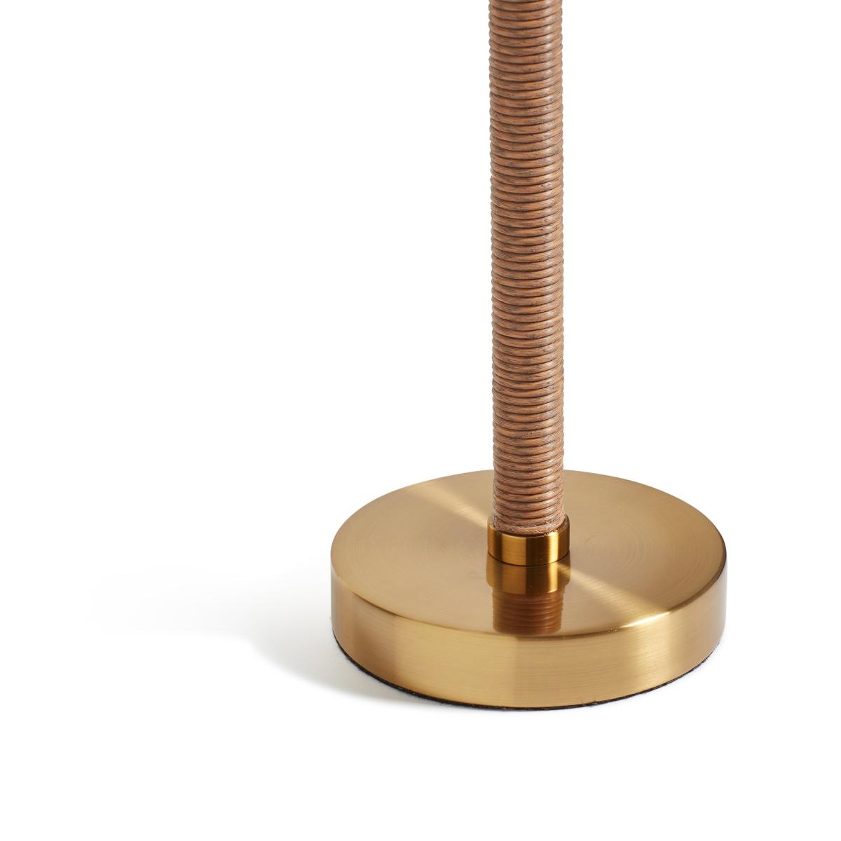 The Kirana Table Lamp has a sophisticated appearance due to the faux rattan that wraps around its iron hardware, with the exposed metal electro-plated with a brass finish.