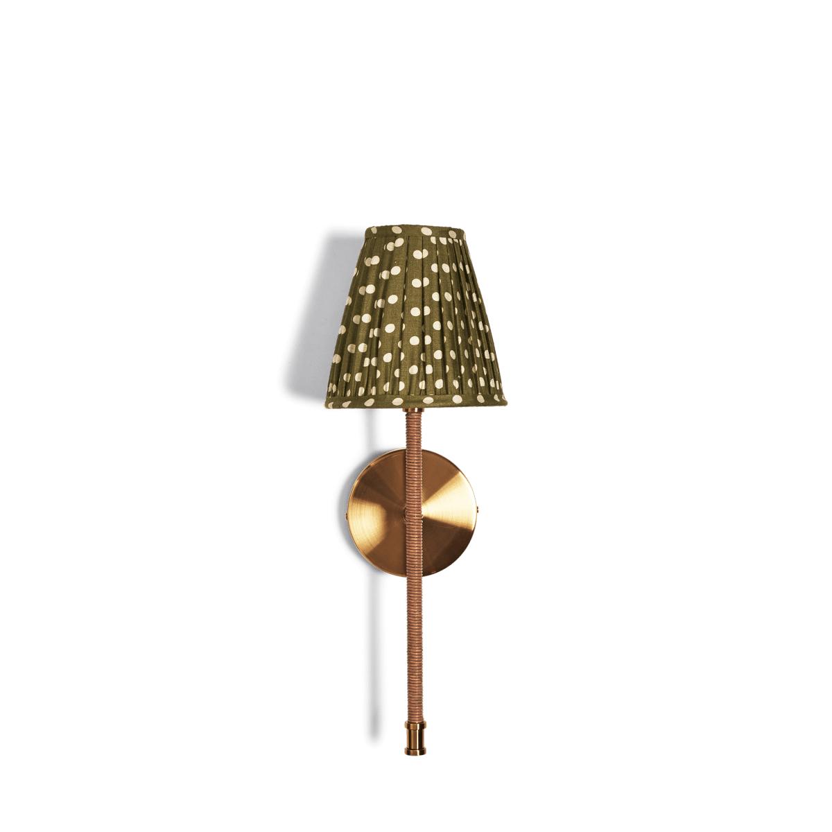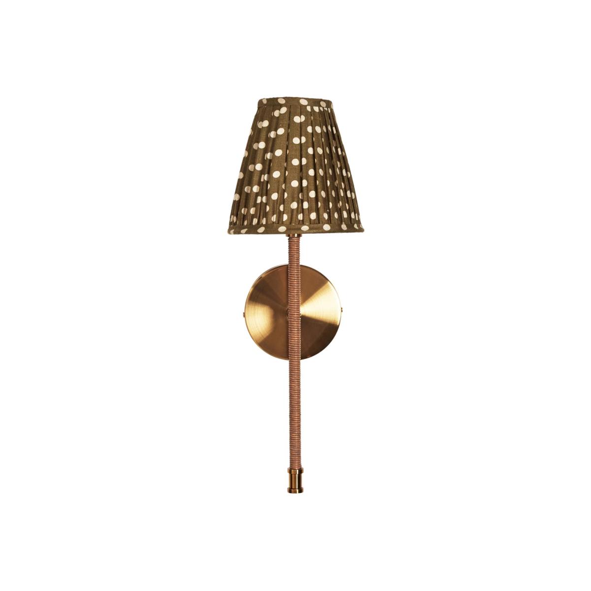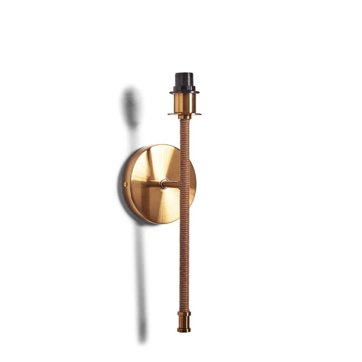 The Kirana Wall Lamp has a sophisticated appearance due to the faux rattan that wraps around its iron hardware, with the exposed metal electro-plated with a brass finish.