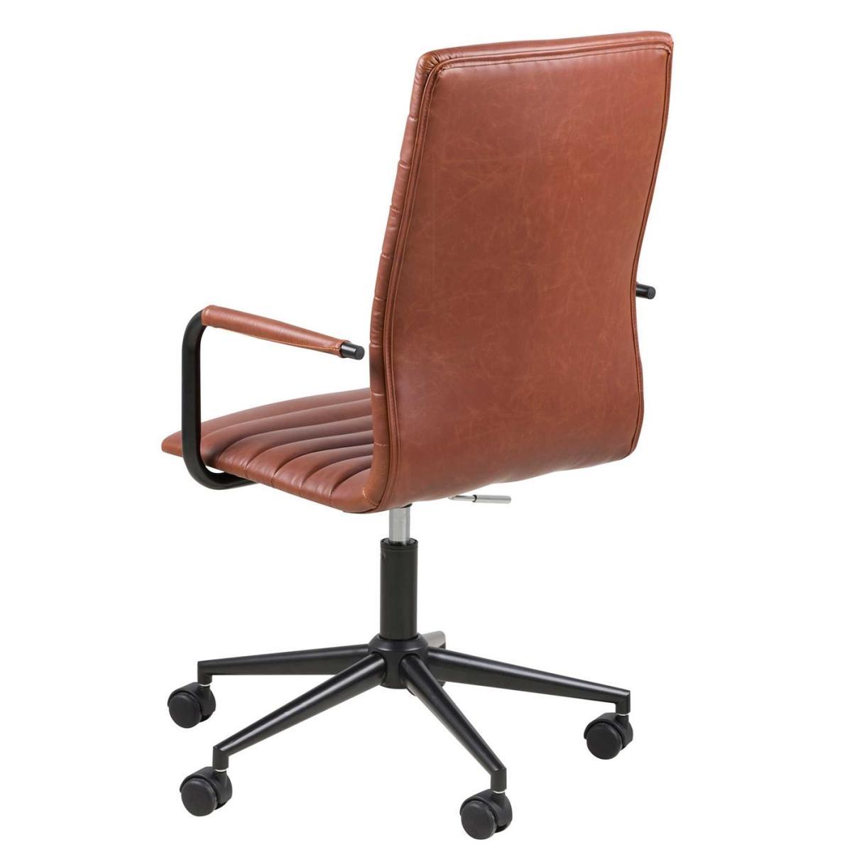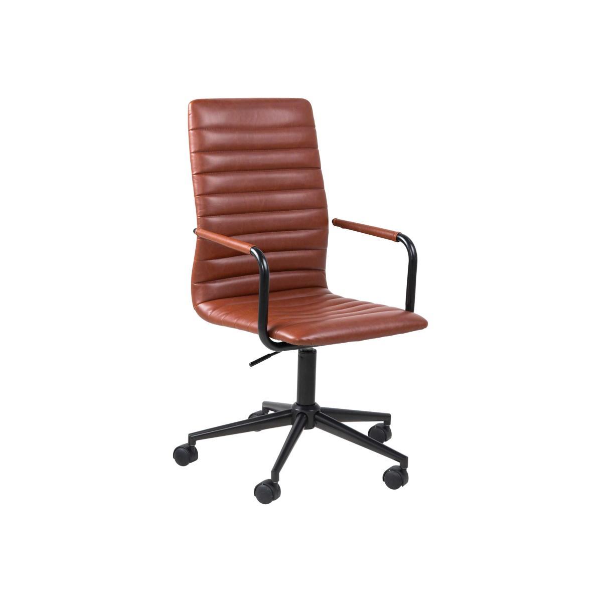 Design. A sleek seating choice for your home office, the Kirby desk chair is upholstered in smooth faux leather with deep stitch detailing. Slim armrests, foam cushioning and a curved back provide the perfect level of comfort, while the swivel base and wheeled feet make navigating your space a little more manageable. A stylish incentive to get to work, this contemporary office chair has an adjustable height function that makes it suitable for most desks.