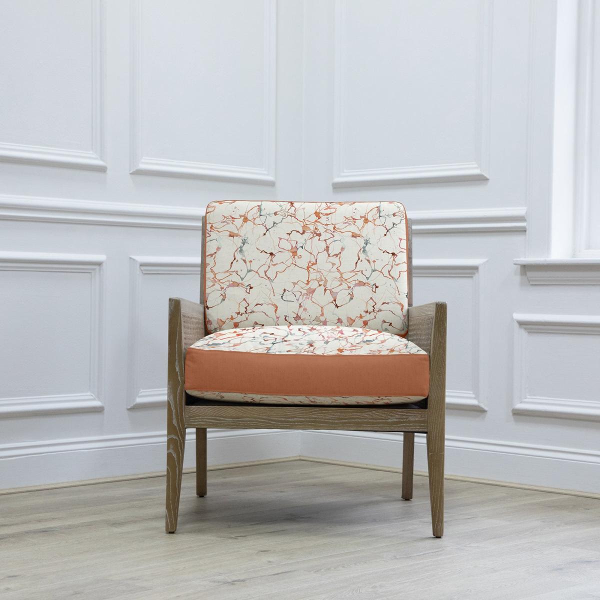 Sporting a warm amber base with a watercolour design on the cushions and trendy French cane detailing, this chair makes a statement in any room of the home. Made of solid oak, this is a durable piece will stand the test of time. The ability to remove the cushions makes aftercare easy.