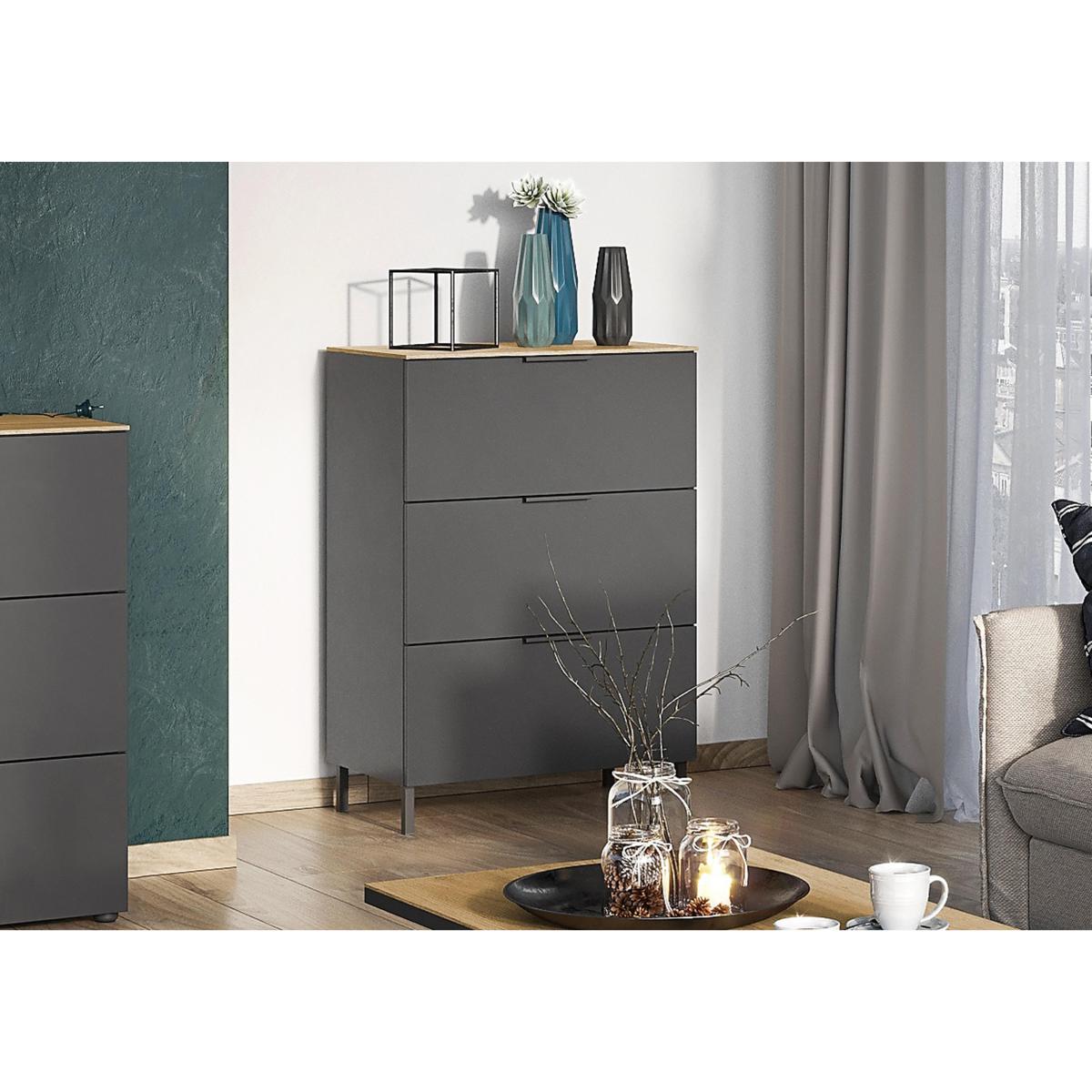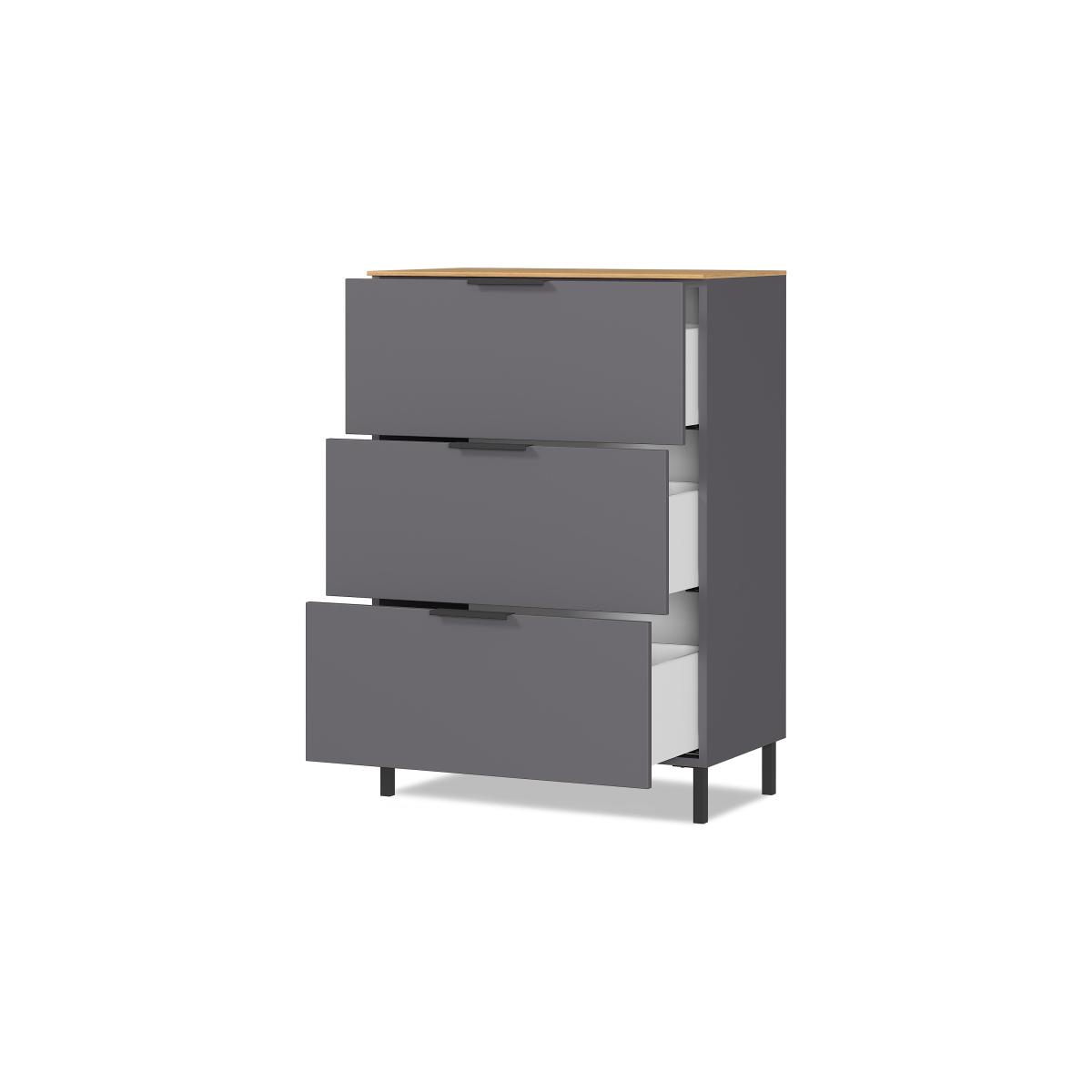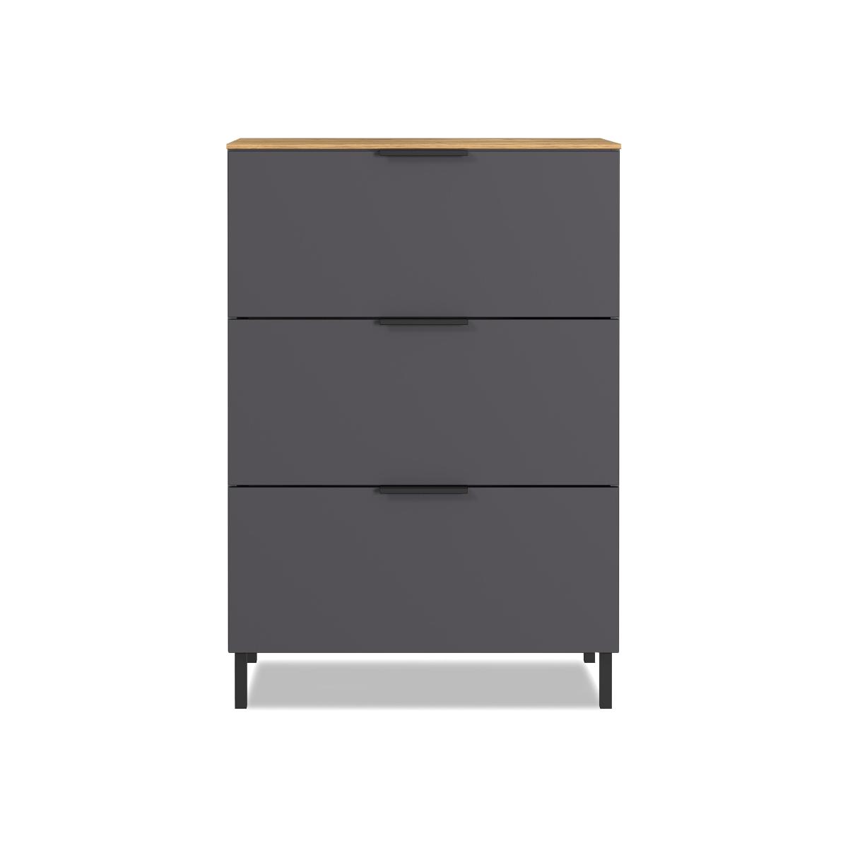 Simple and minimal, our contemporary Kit range of storage furniture is all about the details. With its dark grey matt finish and contrasting oak-effect tops, its style is both on-trend and timeless. A grownup look that works in every room from living room to bedroom and dining room to home office, the range comprises storage-rich chests of drawers, sideboards, a TV unit, a highboard and more. Proportioned for spaces both large and small, the Kit collection offers a practical mix of shelves, cupboards and drawers and is perfect for family homes thanks to its durable melamine finish. Designed and made in Germany. The chest of drawers gets a modern makeover in our Kit three-drawer chest. With its contemporary matt grey melamine finish and slender oak-effect top, this is definitely storage with style. Why you'll love it Chest of drawers works in any room from home office to bedroom. Bold contemporary style with a two-tone matt finish. Dark grey frame. Elegant, slim contrasting oak-effect top. Silent soft-closing drawers. Durable melamine construction with shock-resistant edges. Arrives in eco-friendly Styrofoam-free packaging. Made in Germany. A Furniture Village online exclusive. This 3-drawer chest of drawers is part of our Kit range. What you need to know Easy self-assembly required, full instructions included. Finished with a durable melamine resin coating. WARNING!Furniture can tip over unexpectedly and cause injury. This item must be fixed to a wall using the anti-tip kit provided. Be sure to use the correct wall fixings suitable for the walls in your home. Furniture Village is not able to fix anti-tip devices for you. Seek professional advice if you are unsure.