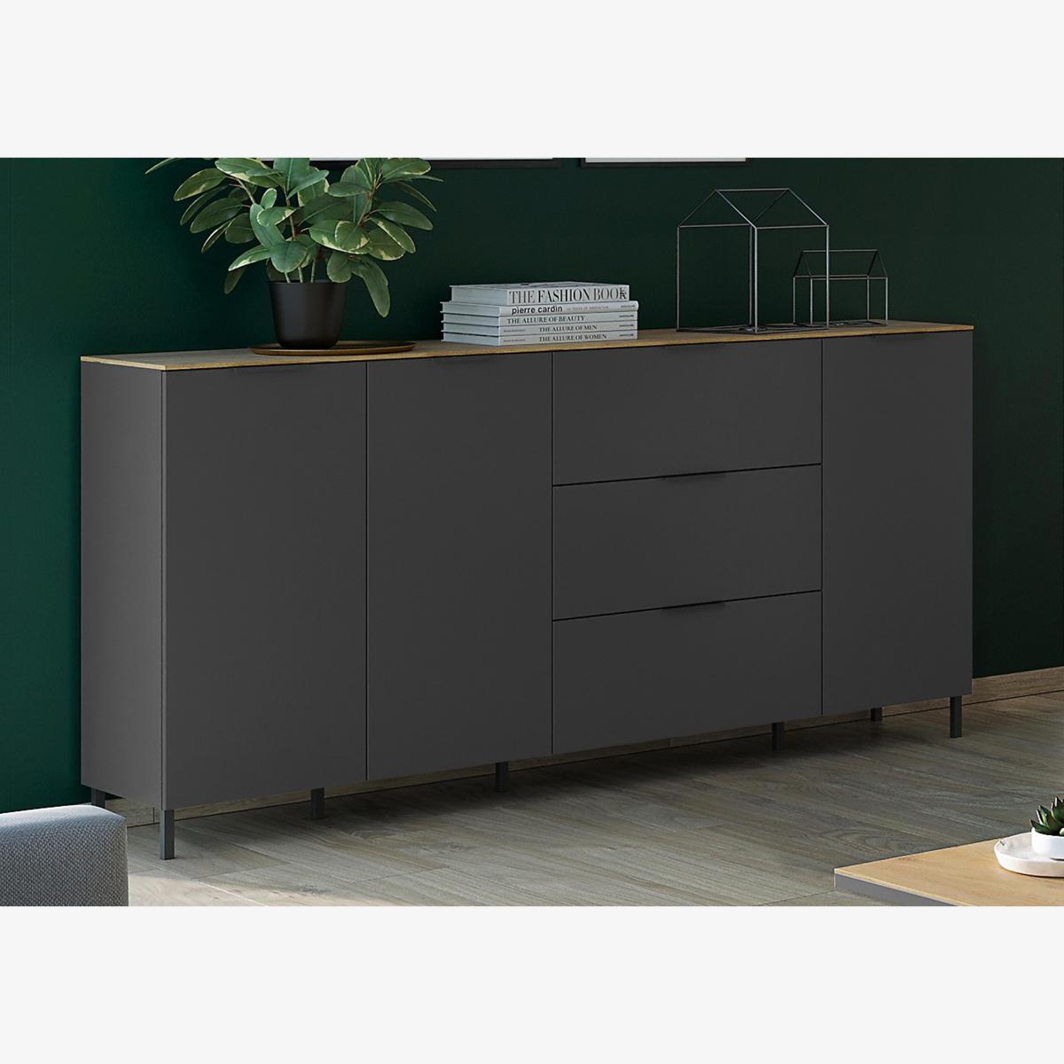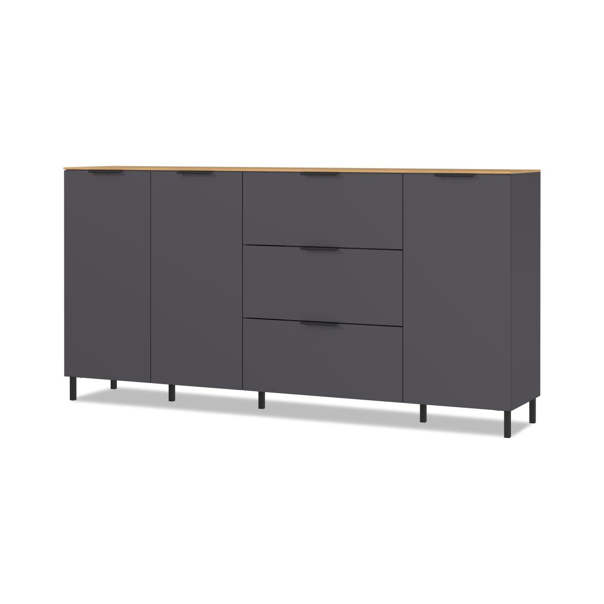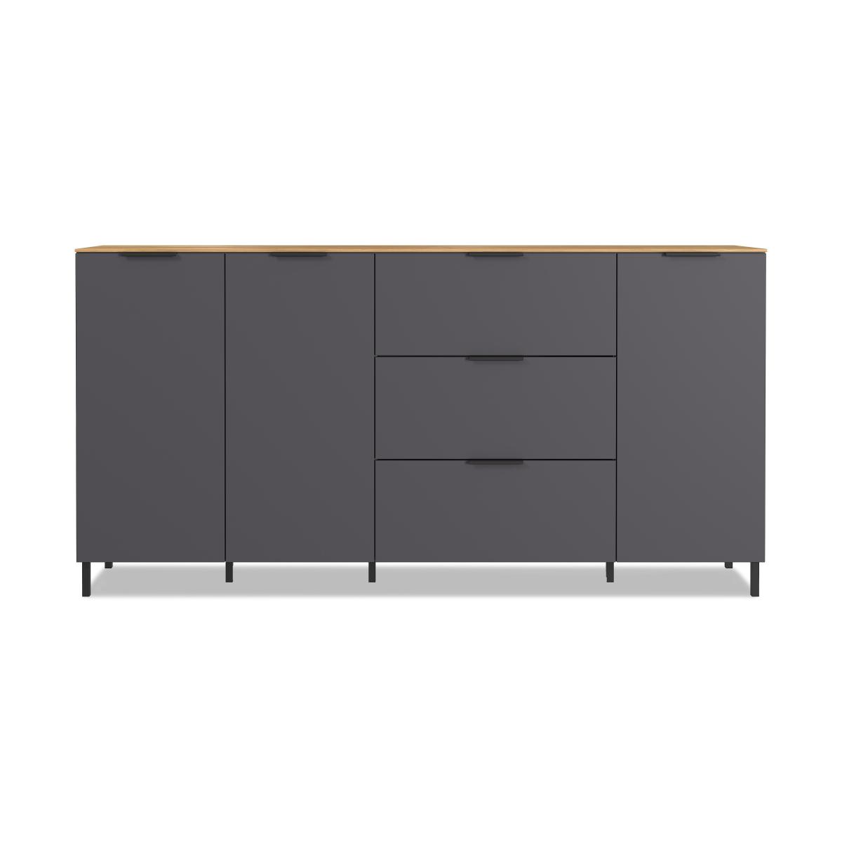 Simple and minimal, our contemporary Kit range of storage furniture is all about the details. With its dark grey matt finish and contrasting oak-effect tops, its style is both on-trend and timeless. A grownup look that works in every room from living room to bedroom and dining room to home office, the range comprises storage-rich chests of drawers, sideboards, a TV unit, a highboard and more. Proportioned for spaces both large and small, the Kit collection offers a practical mix of shelves, cupboards and drawers and is perfect for family homes thanks to its durable melamine finish. Designed and made in Germany. Spacious storage plus contemporary style – this large sideboard with a very cool matt grey melamine finish is all you need. We love that elegant oak-effect top. Why you'll love it Spacious storage and even bigger on-trend style. Bold contemporary style with a two-tone matt finish. Dark grey frame. Elegant, slim contrasting oak-effect top. Silent soft-closing cupboard doors and drawers. Durable melamine construction with shock-resistant edges. Arrives in eco-friendly Styrofoam-free packaging. Made in Germany. A Furniture Village online exclusive. This large sideboard is part of our Kit range. What you need to know Easy self-assembly required, full instructions included. Double-door cupboard has 2 shelves. Single-door cupboard has 1 shelf. Finished with a durable melamine resin coating. WARNING!Furniture can tip over unexpectedly and cause injury. This item must be fixed to a wall using the anti-tip kit provided. Be sure to use the correct wall fixings suitable for the walls in your home. Furniture Village is not able to fix anti-tip devices for you. Seek professional advice if you are unsure.