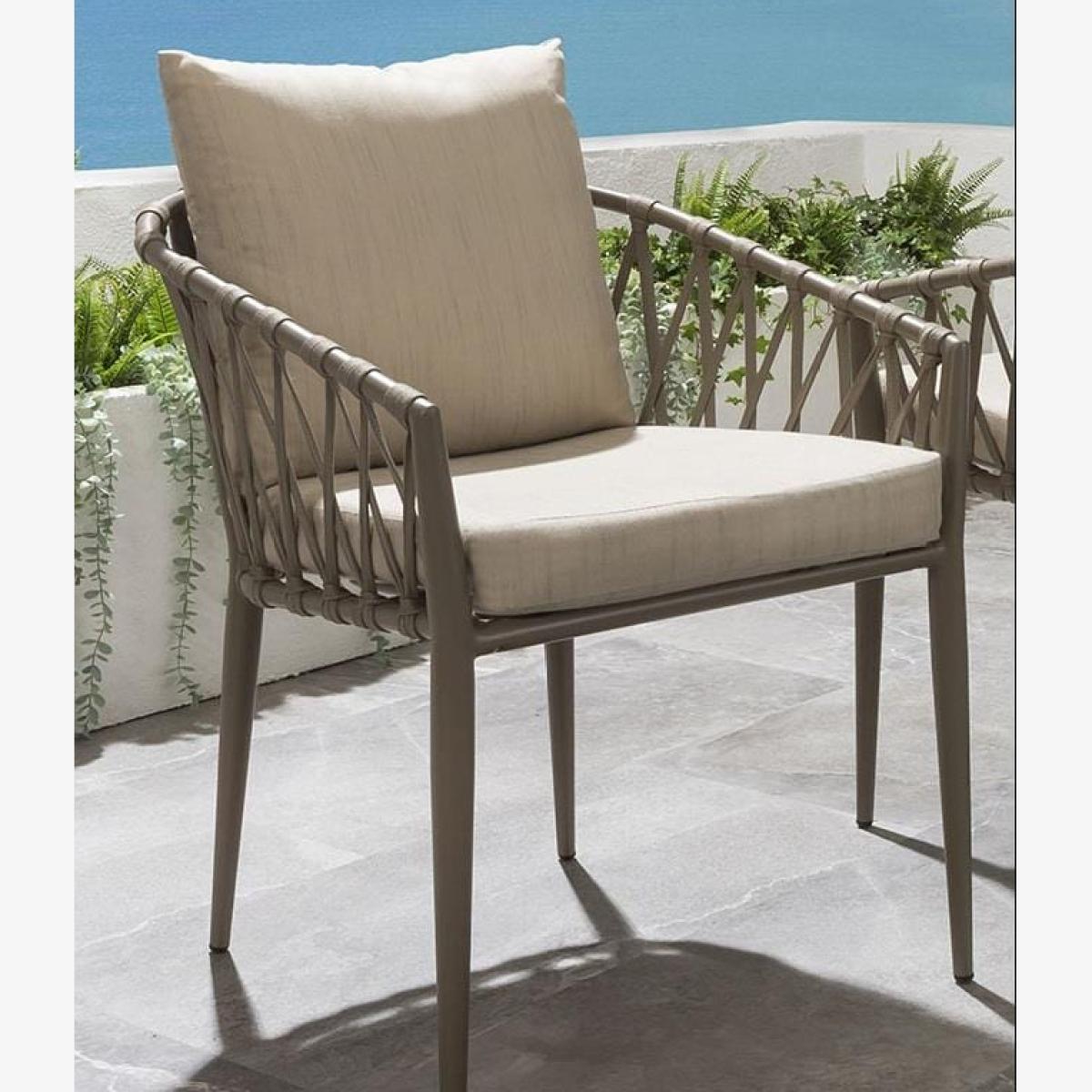 Reinvent your outdoor space with these fabulous all-weather beige rope-back garden dining chairs. The generously padded outdoor chairs are enhanced by a supportive back cushion for an extra layer of luxurious comfort. Our gorgeous rope back garden chairs will make a stunning addition to your outdoor seating area or patio. The garden chairs come complete with our signature luxuriously thick cushioning that offers unbeatable comfort, topped off with rich Beige high-end marine fabric which has amazing resilience to colour fading and damage caused by extreme weather conditions. Expertly crafted aluminium frames are highly durable, complemented by clean lines that lend contemporary style. It is robust and weather-resistant for outdoor use & the super cushioned seating offers comfortable support that's shower-resistant, but we advise that cushions are stored when not in use. W: 60cm, D: 63cm Stackable - Really Easy to Store Set of 2 Rope Back Garden Dining Chairs in Beige