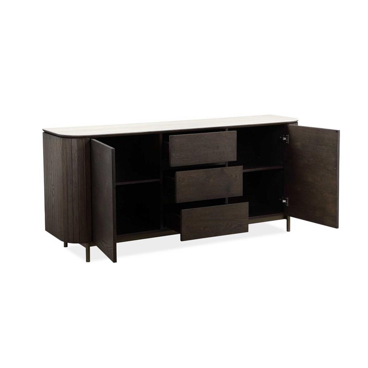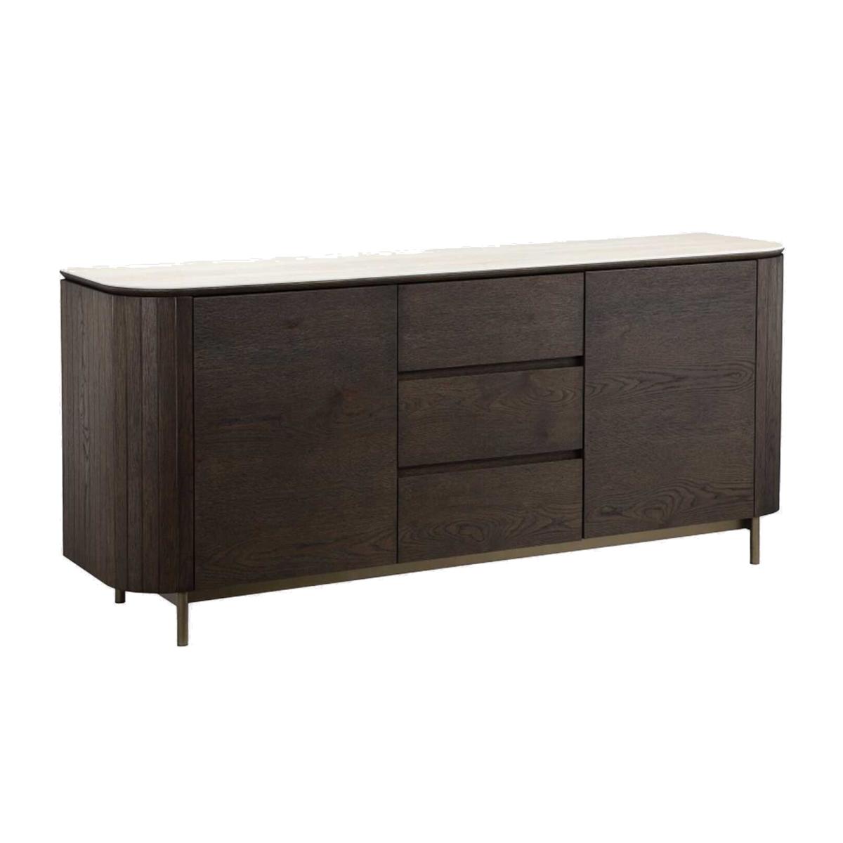 In your living space, this dark brown wood sideboard emerges as a symphony of elegance and grace. The rich wild oak veneer, adorned with a subtle decorative line, whispers tales of timeless charm, while the off-white travertine ceramic top casts a contemporary glow. Elevated by powder-coated metal legs, it balances modern sophistication with enduring durability. With two doors and three drawers, it offers a bounty of storage, seamlessly blending function with refined beauty. Poised to captivate, it transforms your home into a haven of stylish tranquility