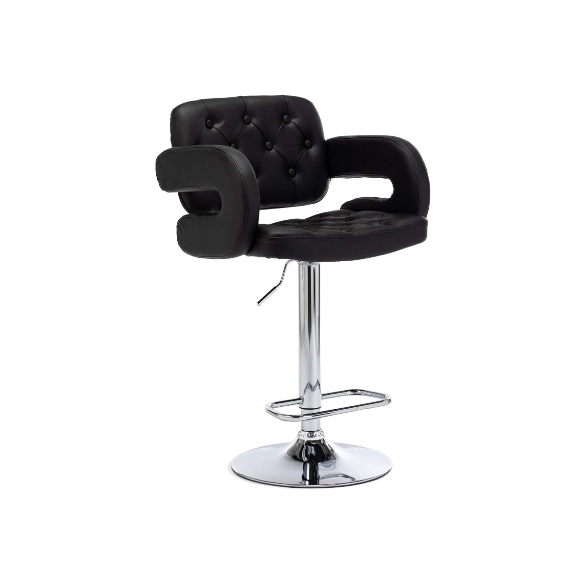 I love these curvy armrest stools for the way their button-tufted black upholstery and chrome gas-lift base combine comfort with a modern silhouette. The adjustable height and integrated footrest make them as practical for kitchen islands as they are for home bars, while the open armrests keep the look light. They suit contemporary, industrial or Scandi-inspired spaces. Pair them with a matte-wood island or concrete countertop to warm up the chrome, then soften things with a neutral linen seat pad. Finish with simple black or brass pendants and minimal open shelving for a cohesive scheme.