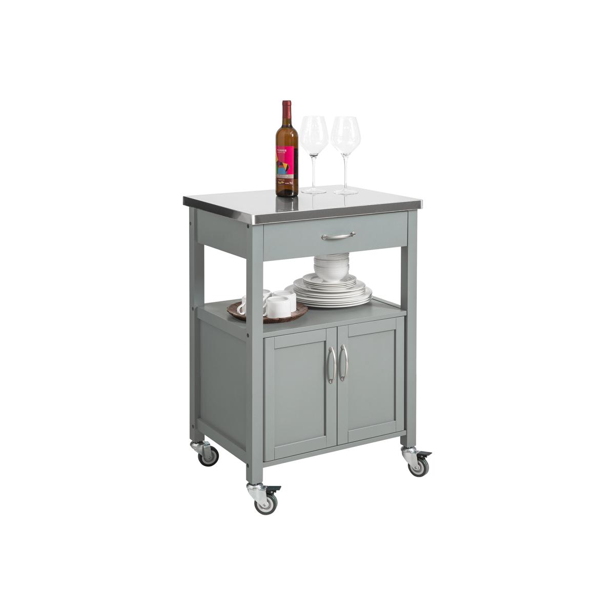 I love this grey trolley for its versatility and practical design. It’s perfect in both contemporary and rustic kitchens, providing additional storage with its closed cupboards and open shelving for easy access to essentials. The neutral grey finish makes it easy to incorporate into various colour schemes-from modern monochromes to cosy, country-style interiors. Styling tips include toppling it with a few stylish bottles or plants to add personality, and utilising the shelves for dishware or kitchen towels. Its mobility on wheels makes it ideal for flexible layout options or serving as a mobile bar when entertaining. Overall, it’s a functional piece that adds a subtle touch of colour while offering clever storage solutions.