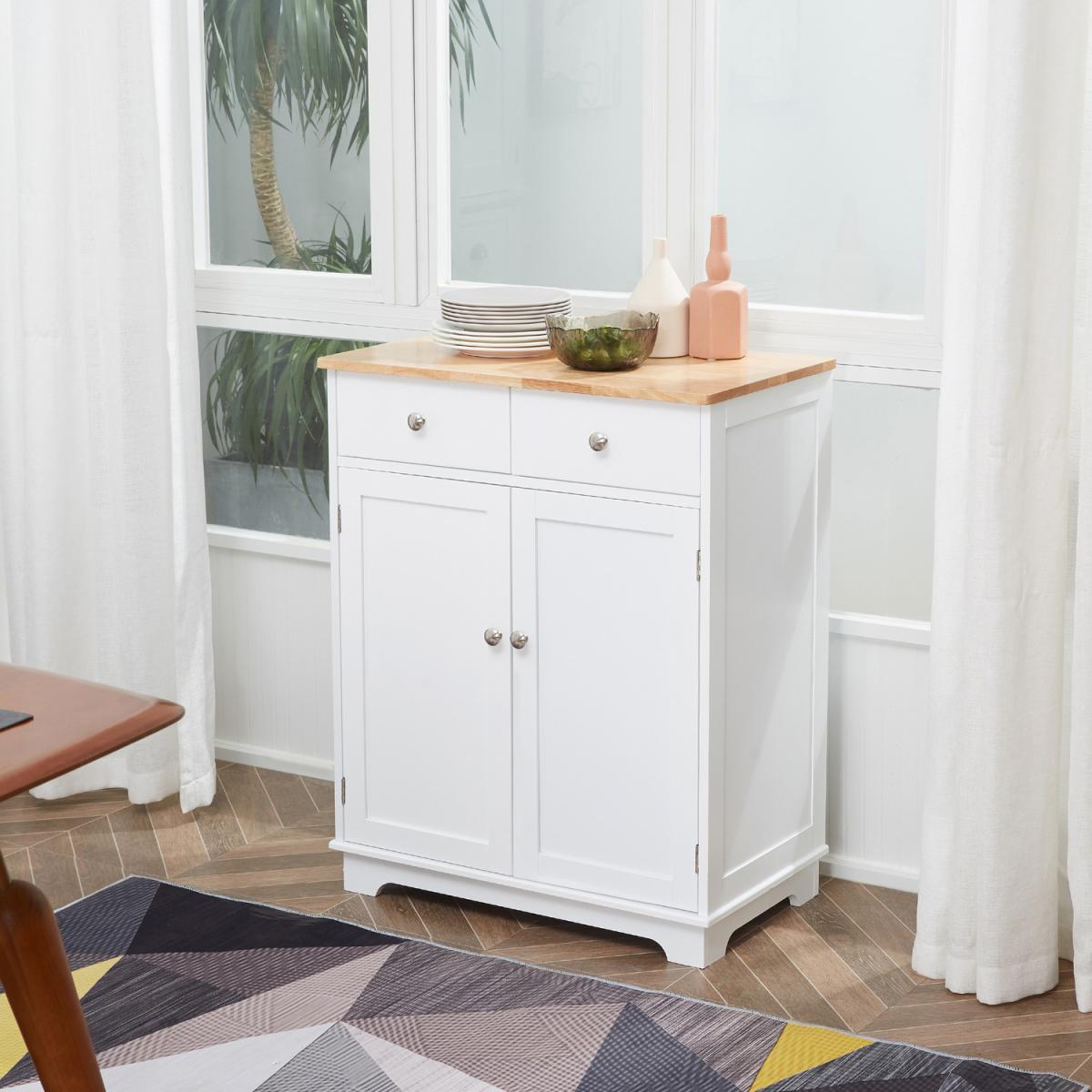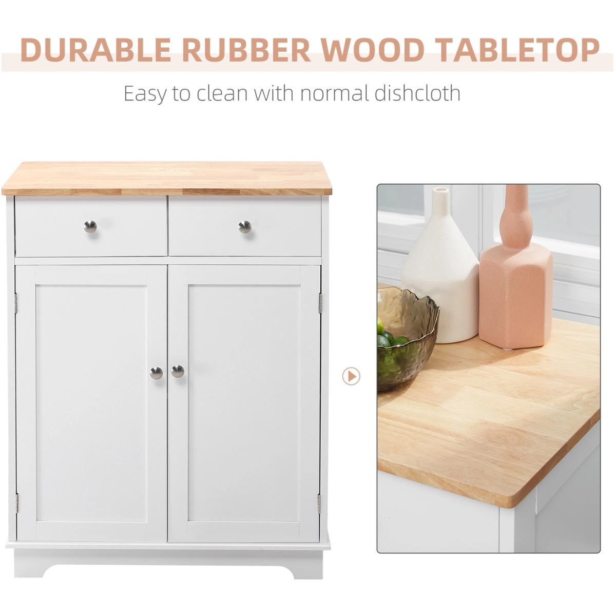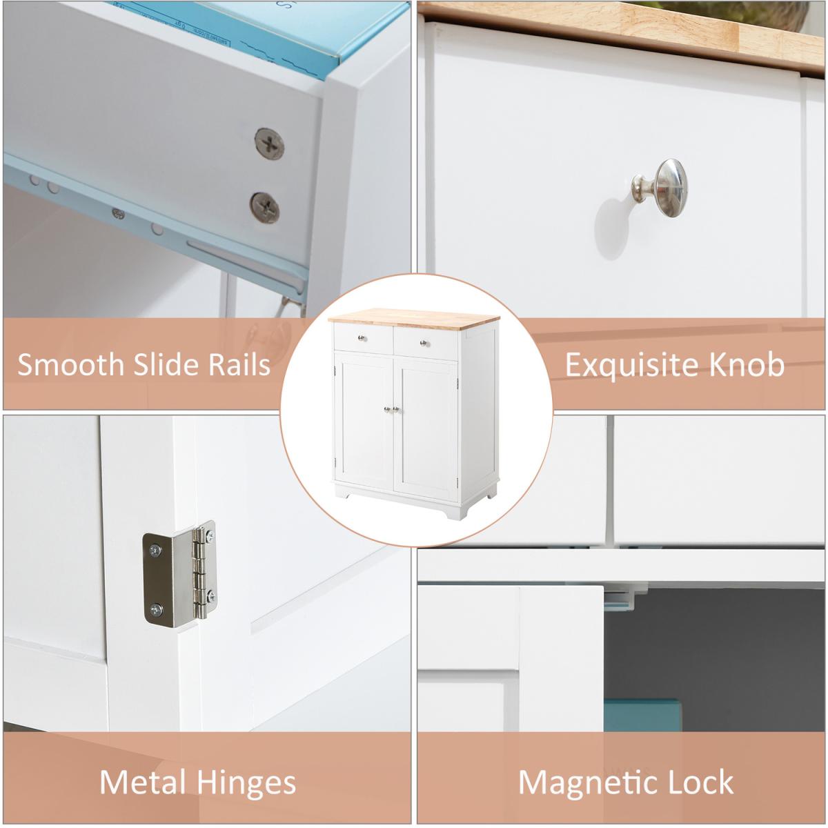 Made of easy-clean rubberwood and MDF, this HOMCOM cabinet is perfect for any kitchen and other rooms. The two large drawers and one cabinet with shelf adjustable can provide you more possibility to store. Polished surfaces and table corners are very safe and friendly to kids.