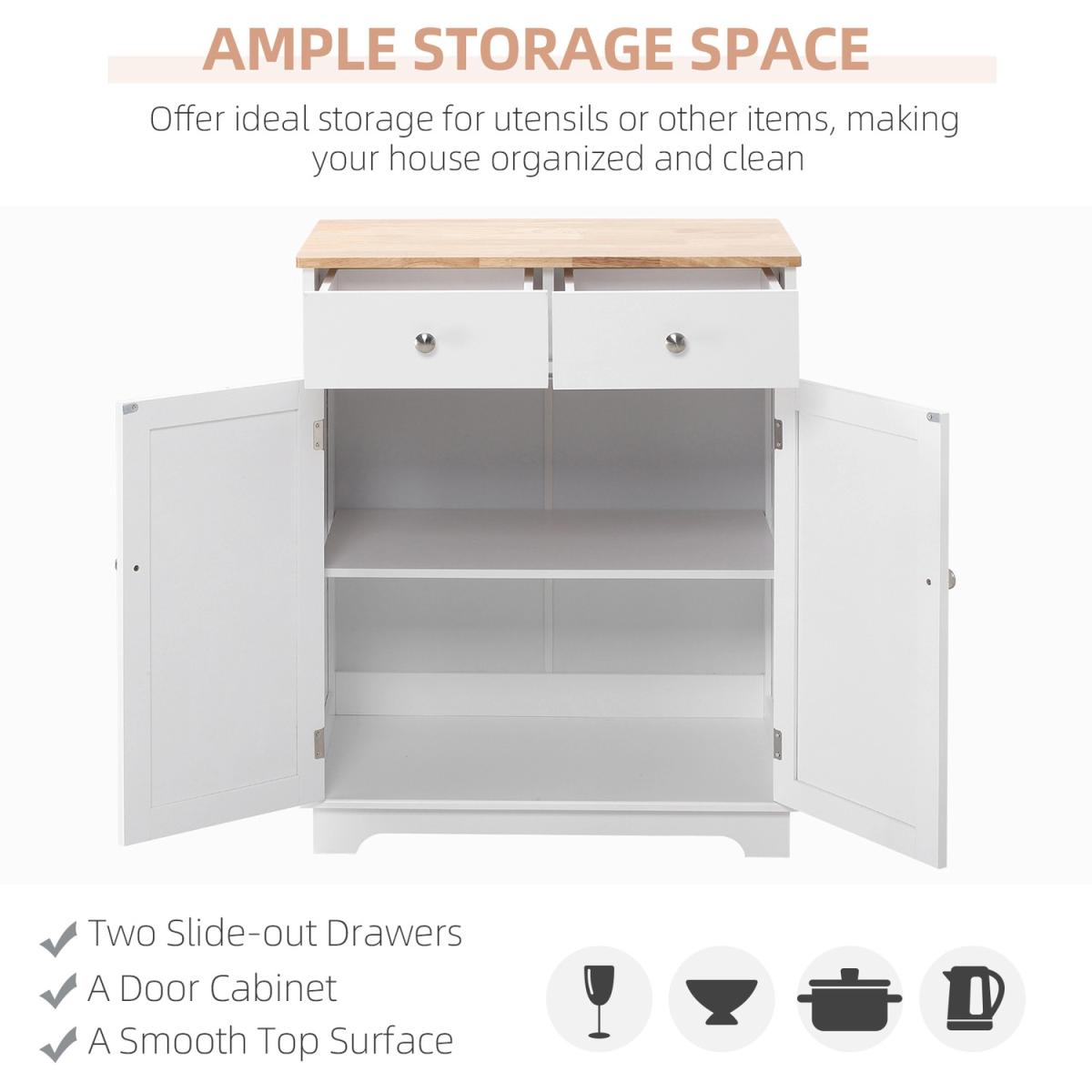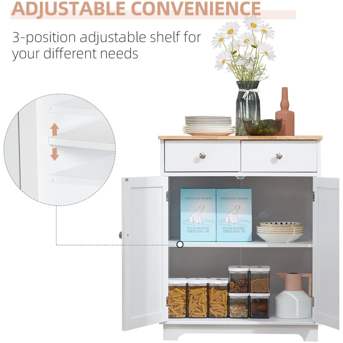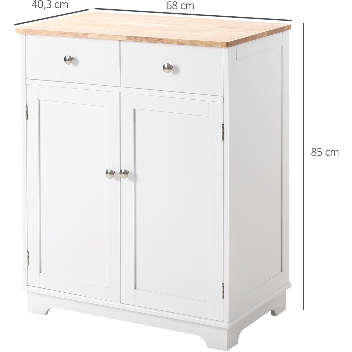 Made of easy-clean rubberwood and MDF, this HOMCOM cabinet is perfect for any kitchen and other rooms. The two large drawers and one cabinet with shelf adjustable can provide you more possibility to store. Polished surfaces and table corners are very safe and friendly to kids.