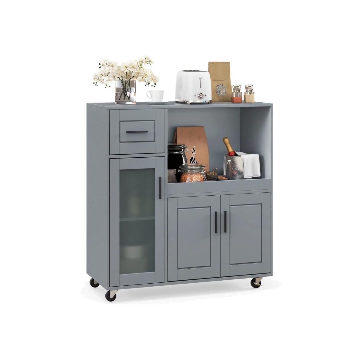 Unleash the magic of a clutter-free, stylish kitchen with this versatile island cart! Dance around with smooth-rolling mobility as you tuck away microwaves, coffee machines, tableware, pots and pans into a chic storage haven, accented by an elegant frosted glass door. Wave goodbye to mess and hello to grace with lockable wheels to anchor your culinary dreams in place and a safety guard for peace of mind. Elevate your kitchen or dining room with this kitchen cart's flexible flair. Click now to transform your space and celebrate organizational bliss!