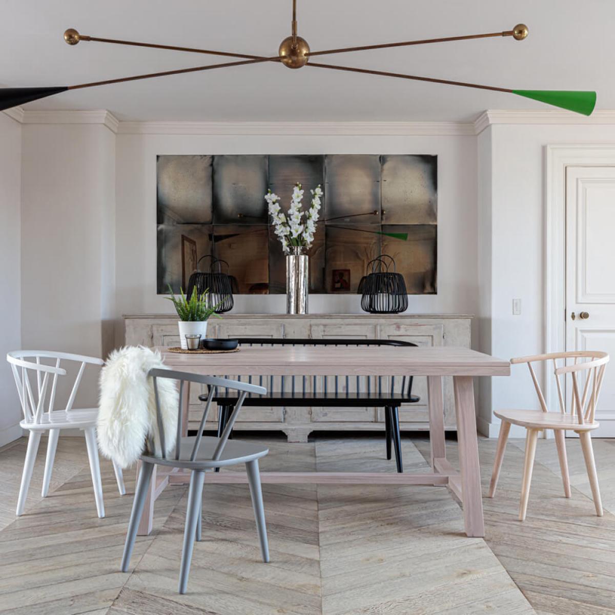 Represents a 10% saving when purchased as a set!1.7m metre whitewash table set consists of: 1 x Kitsilano 1.7 Metre Dining Table - Whitewash 1 x Brunswick dining bench – black 2 x Brunswick dining chair – true white 1 x Brunswick dining chair – whitewash 1 x Brunswick dining chair – light grey 1 x Kitsilano Extension Leaf Enjoy dining and hosting with the beautiful and versatile Kitsilano solid oak dining table. This stylish dining table comes in a 1.7 metre length (also available in 2.2 metre version) and benefits from an appealing whitewash tone finish. This lovely varied grain is highlighted further by the finger jointed surface a method which locks in the quality of the oak wonderfully. The Kitsilano modern dining table has also been lacquer coated meaning it’s pleasingly tactile to the touch. The oak has been sourced from fully certified FSC origins and therefore comes from properly managed sustainable forests. This dining table set comes with one Kitsilano extension leaf allowing the table to go from seating 6 to 8 people when this simple add-on leaf is inserted. Thankfully the extension system means there’s no undesirable central crease like other extending dining tables instead simply plug this into the end. If needed a second leaf (to be purchased separately) could be inserted to the other end to increase numbers further. This solid oak dining table set comes with the Brunswick seating range a slender and classic seating collection that we especially picked to pair with the solid oak Kitsilano table. Included is the 3 seater dining bench and 4 Brunswick chairs. The dining chairs come in a three delightful colours; true white black whitewash and light grey. Each seat has been carefully lacquer finished meaning it will resist marking and live longer - taking what the day to day may throw at it. We think the lovely variety of tone really brings this dining set to life. The Brunswick seating is a classic choice and the bench can also sit exceptionally well in a hallway or pretty much any room in the home including bedrooms. There's possibility to mix and match chair colours to make your dream set - please get in contact with our customer care team to discuss this. Also available as a singular 1.7 metre dining table but also as a 2.2 metre dining set.