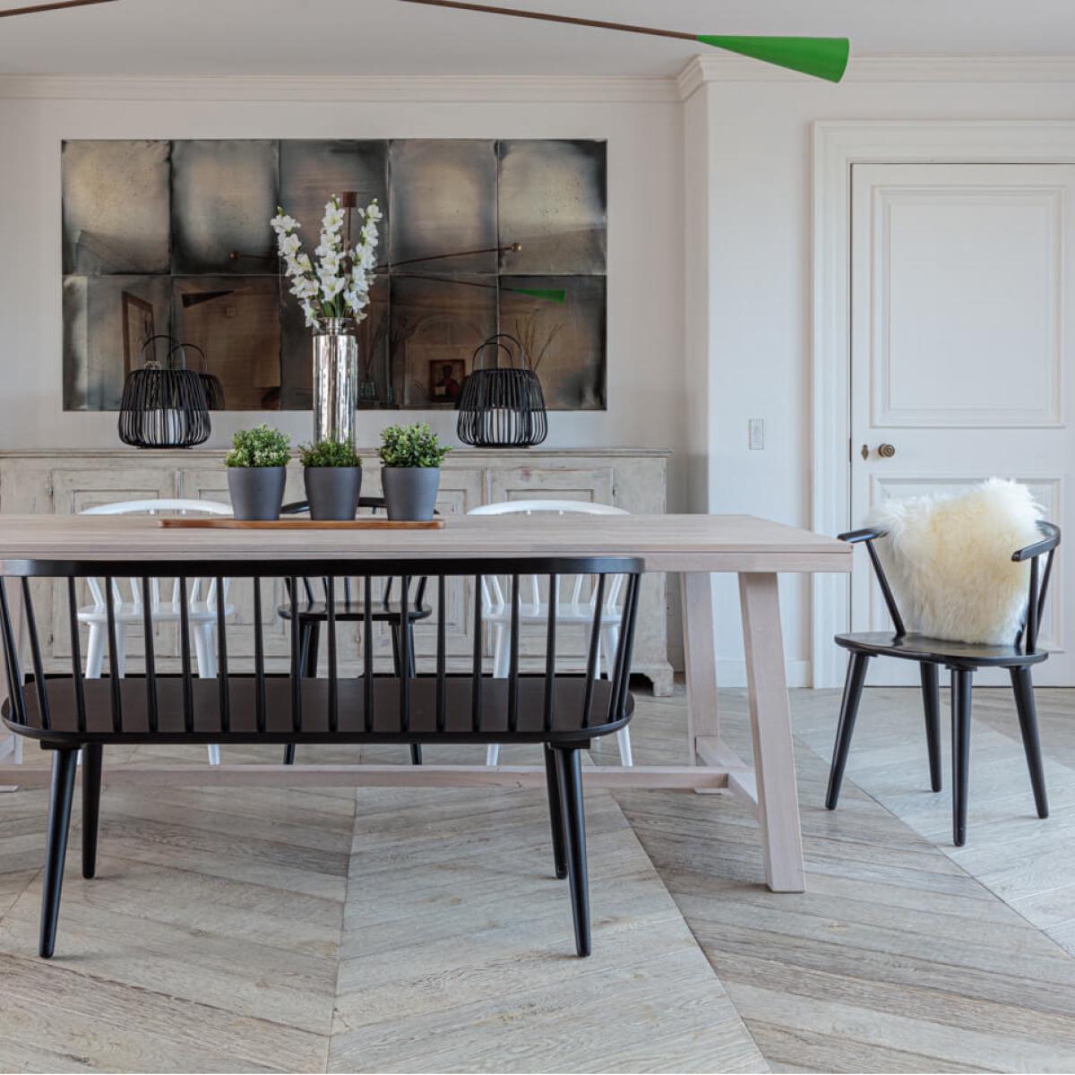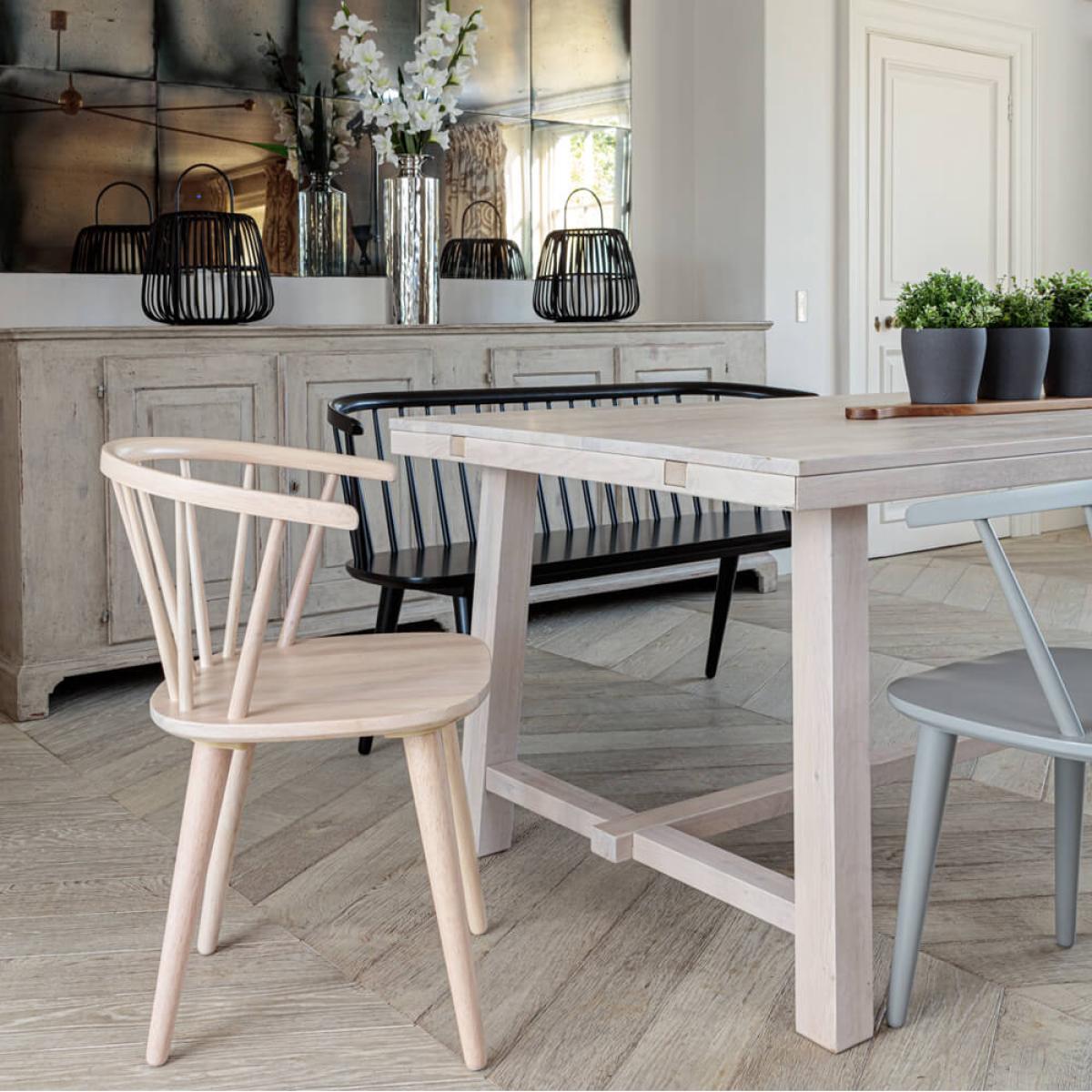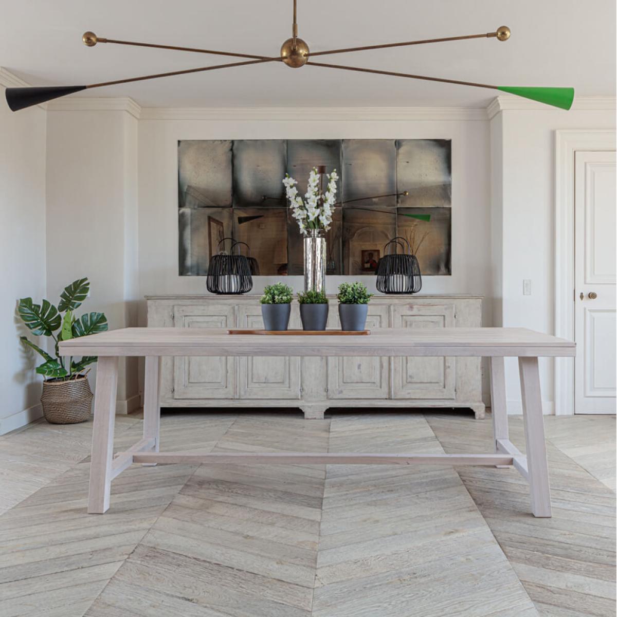 The Kitsilano Solid Oak Dining Table is sizeable yet sleek, a solid oak construction in an attractive whitewash that benefits from a finger jointed surface. A style not too dissimilar to how parquet flooring is constructed, this interlocking method gives wonderful variation to the finish of the table. The lovely varied grain of this oak is only exemplified by the neutral whitewash tone, a real classic hue. To seal in the quality this solid oak furniture has been lacquer finished, so is tactile to touch. The oak has been sourced from fully certified. FSC. Origins, and therefore comes from properly managed sustainable forests. At a stately 2. 2 metres you’ll already be able to seat 6 as-is, however if attaching one of the add-on end extension leaves (sold separately) this wooden furniture can seat even more – up to a whopping 12 people if using two extension leafs! A wide variety of seating or benches would suit this table, however, our top pick are the. Brunswick. Chairs and Benches. This table is. Available as a pre-determined set. Which benefits from a 10% inbuilt discount. This table is also. Available in Dark Brown Oak.