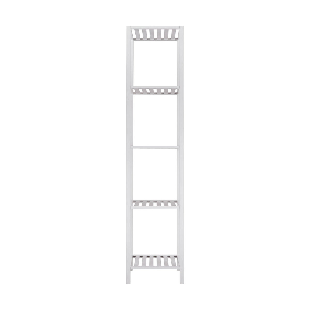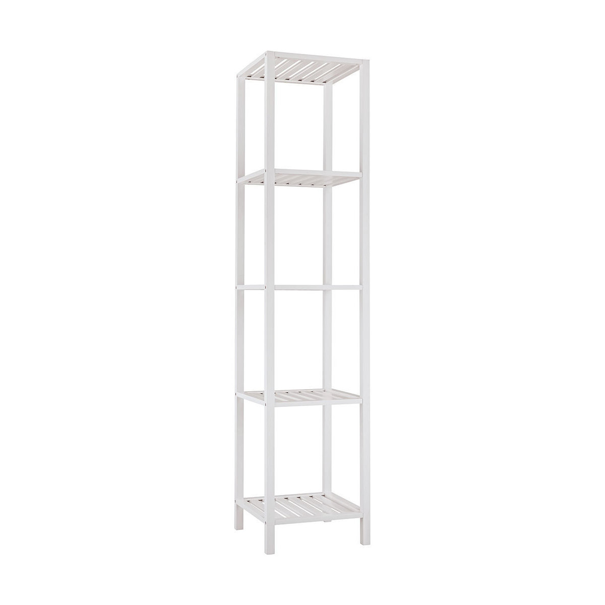 The Kitt bamboo 5 tier white shelving unit is a sturdy design that provides generous storage space for towels, toiletries and make-up.;Ideal for any room in need of extra storage, it’s also suitable for use in the bathroom - the sustainable bamboo material has a water-resistant surface, meaning it will absorb less water than wood. A stable material, it’s unlikely to warp when exposed to moisture. This versatile piece features a slatted design which adds lightness to a space.;Slot Kitt next to your bath, shower or sink to ensure your toiletries are always close to hand and pair with other sizes in the range for extra storage options.