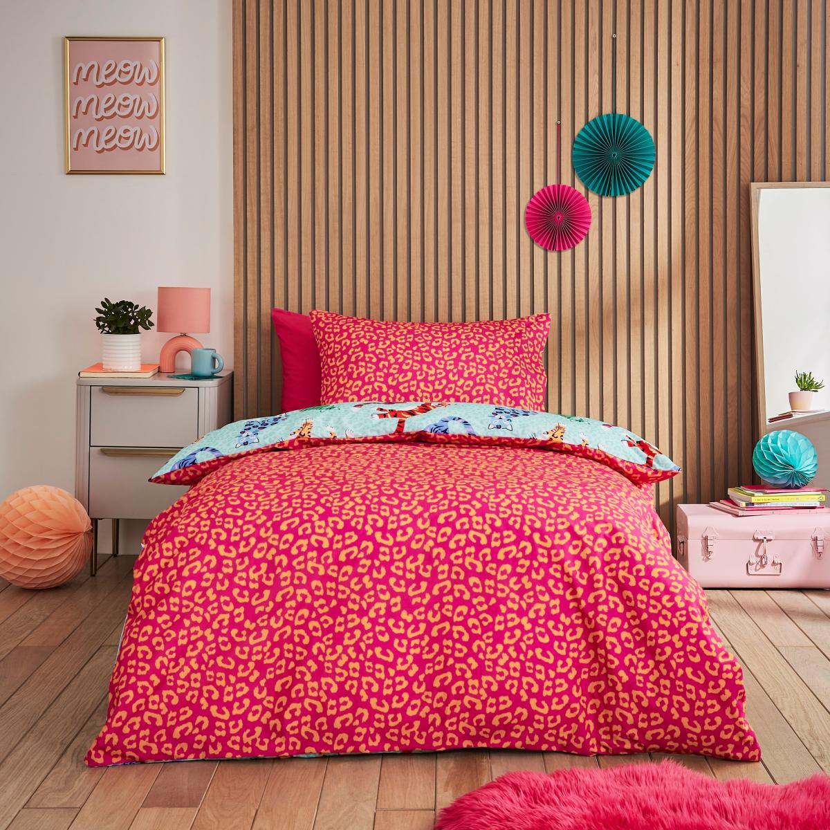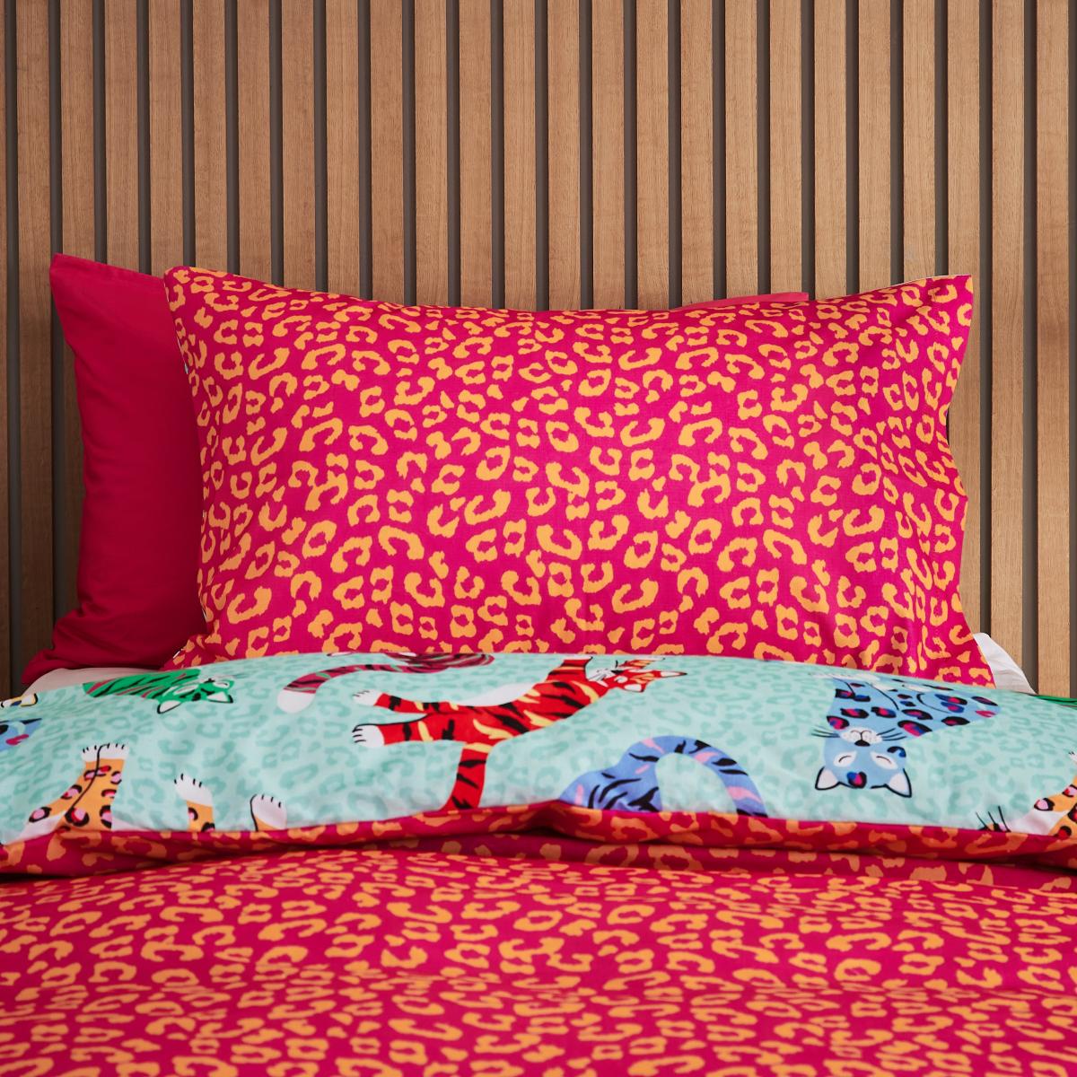 * Polycotton Blend Duvet Set* 144 Thread Count* Pack Contains 1 x Duvet Cover and 1 x Pillowcase Dive into a world of whimsy and charm as adorable kitty cats adorn your bed. The playful and colourful design on one side is complemented by a coordinating leopard print reverse, offering you two delightful looks in one set. Made from a luxurious yet easy-care poly-cotton blend, these duvet covers are not just a visual treat but also a tactile pleasure. The soft fabric ensures a comfortable and restful night's sleep, while the reversible feature allows you to switch styles according to your mood.