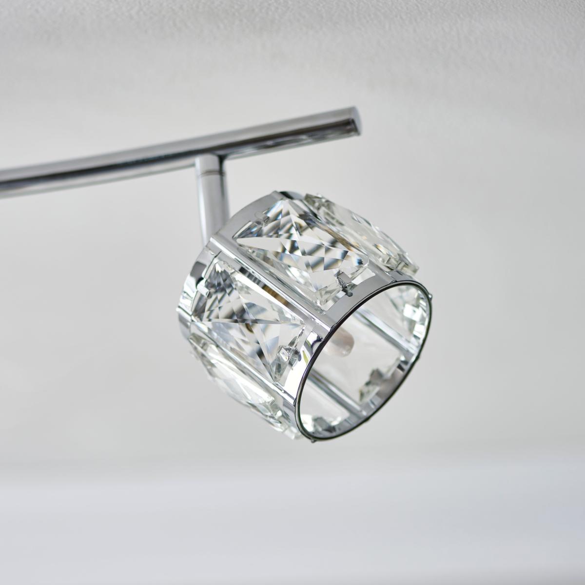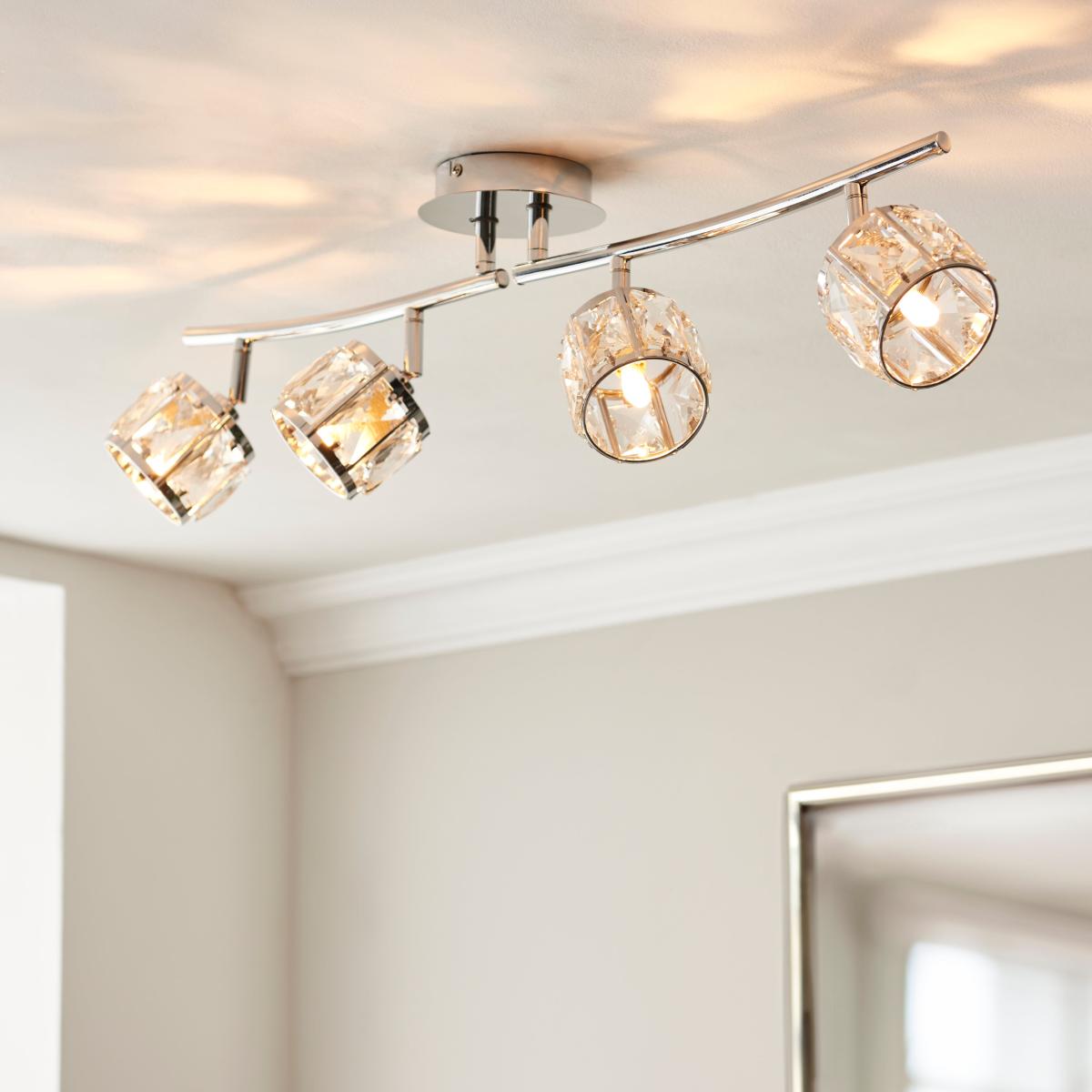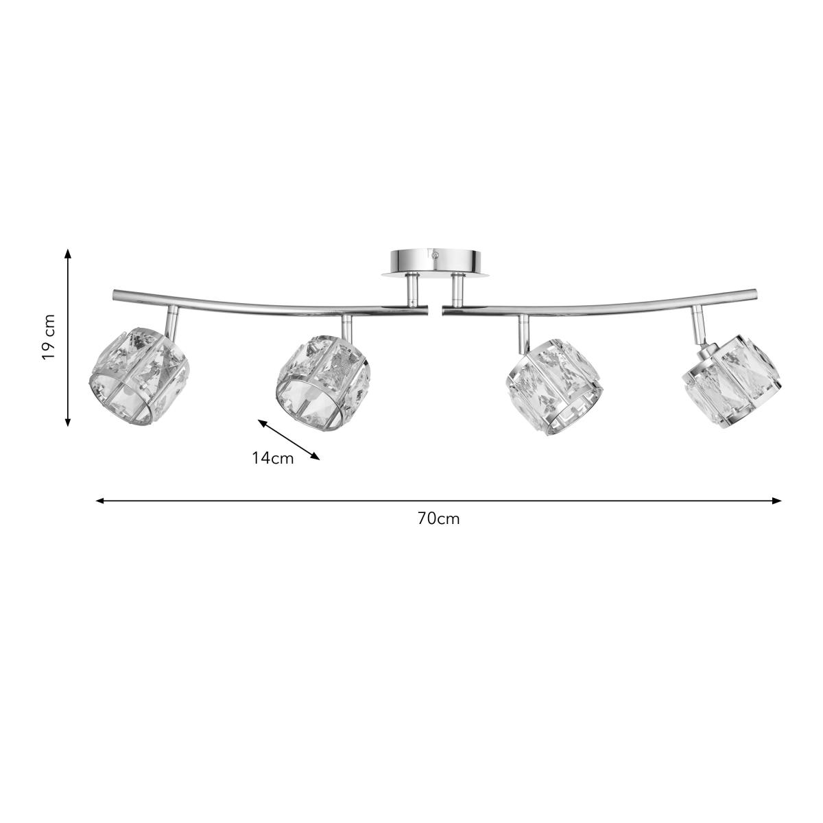* Modern, Chrome Finish* Eye-Catching Glass Jewel Beads Design* Adjustable Spotlights & Bar - Tailored Ambience* Dimmable Compatible - Needs Dimmable Bulb & Switch* Requires: G9 Cap Type & Capsule Bulbs With its modern chrome finish and glass jewel beads design, the Kleio Modern 4 Light Adjustable Spotlight Bar is the perfect addition to your living space. It has an adjustable bar and spotlight heads, offering tailored ambience.