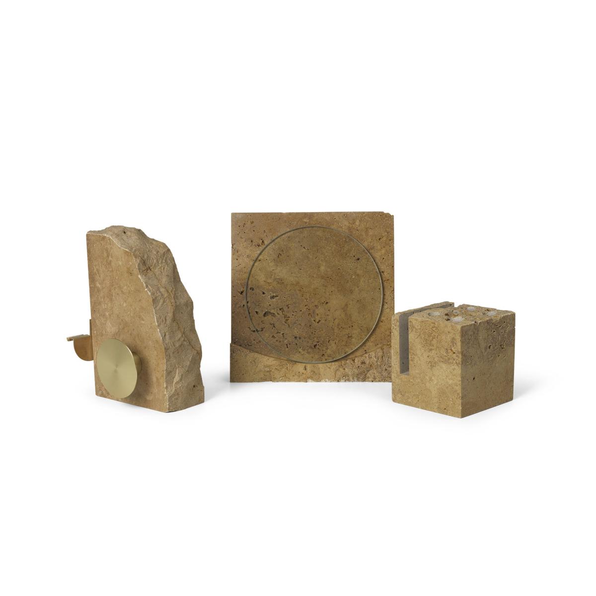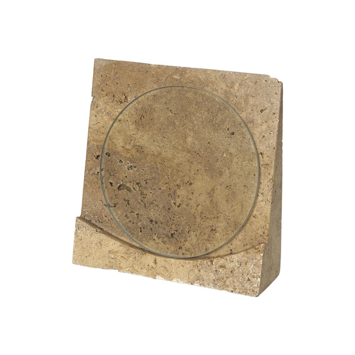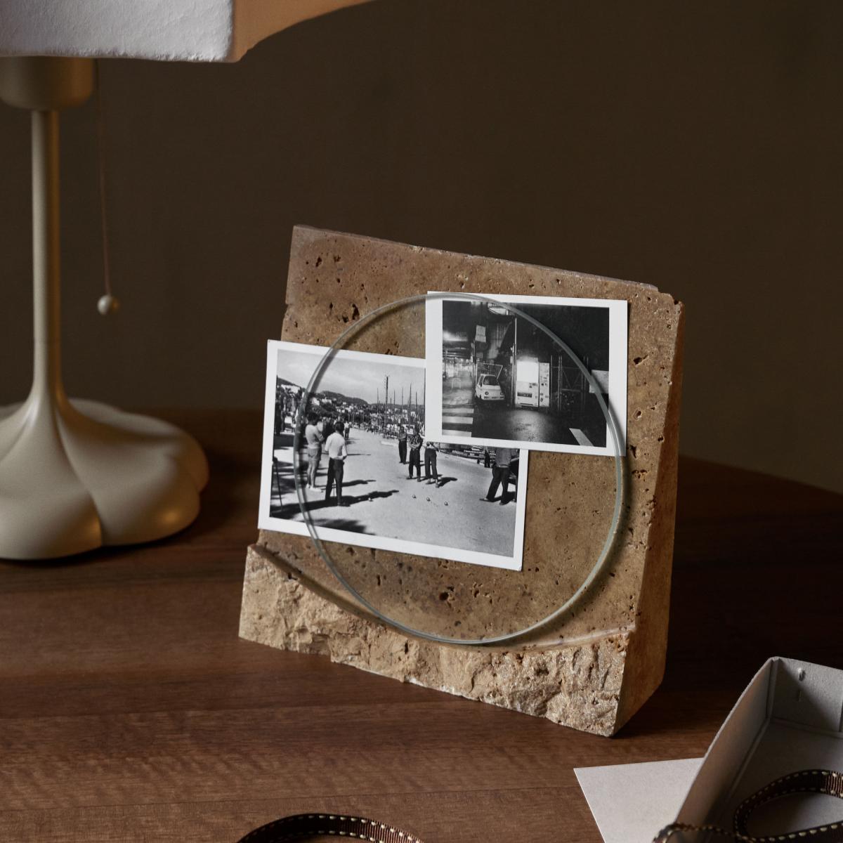 The Klint collection, made from beautiful, natural stone, brings a modern twist to the traditional office accessory. This photo frame is crafted from a travertine block, a natural stone with delicate marbling. The rough, unpolished surface contrasts with its clean, sleek lines. The natural qualities of this limestone lend the object a rough appearance that further highlights its architectural character. Slip your favourite photo between the circular glass and travertine stand. Travertine is a natural material, so variations may occur.