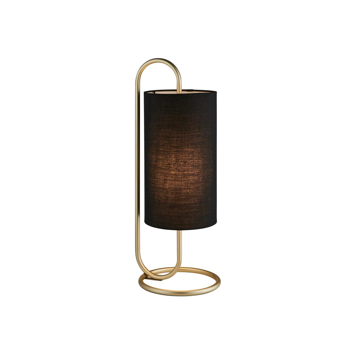 Floating cylinder black fabric shade encapsulated by the soft curves of antique brass painted metal work. A table light perfect for today's contemporary living; other finishes also available.